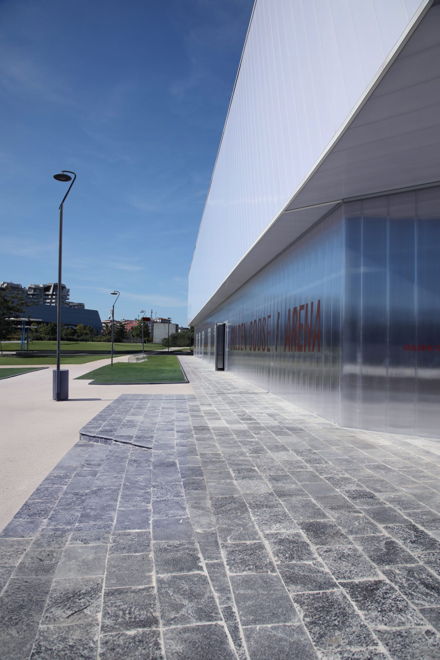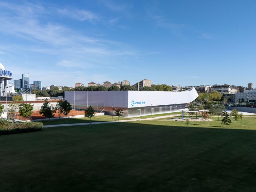 Standing 12 metres tall and spanning a total surface of 2,800 sqm, the Golden Goose Arena is defined by a sweeping 17-metre curved cantilever designed to naturally welcome and guide visitors. As a fully public facility, it was created to promote healthy, inclusive and accessible lifestyles, consolidating its role as a new sports and social hub within Milan’s largest urban park: 178,000 sqm of green space and over 2,000 trees.