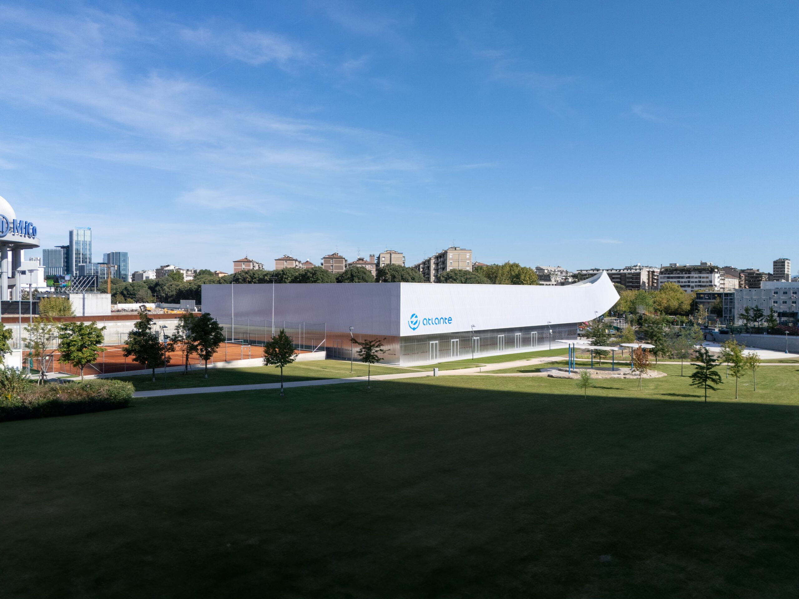 Polycarbonate is used as the main cladding material, transforming the building into a contemporary lantern that lights up at night as a glowing focal point within the park. Sustainability is a key focus: radiant floor heating, high energy efficiency and a photovoltaic roof powering the facility with renewable energy in synergy with the surrounding energy network.