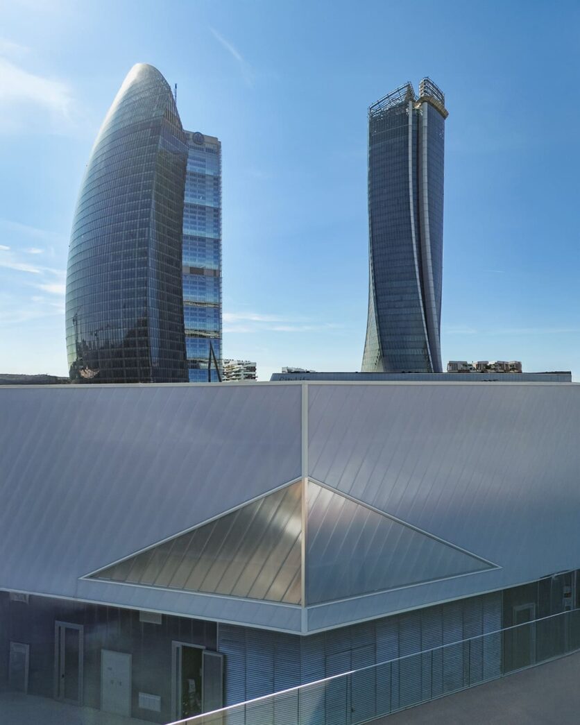 The building’s geometry directly responds to the curve of the adjacent CityWave, designed by BIG, establishing a mirrored relationship: the volume lifts to create an elevated entrance that becomes a true urban gateway, a symbolic connection between the Fiera district and the large park.