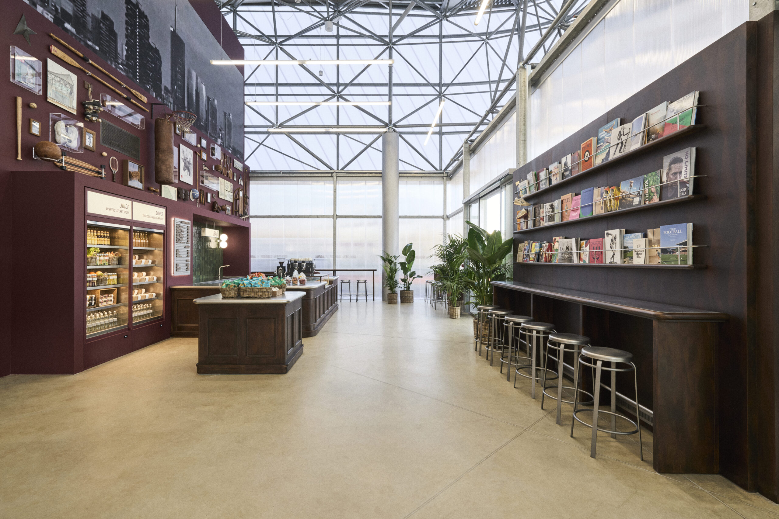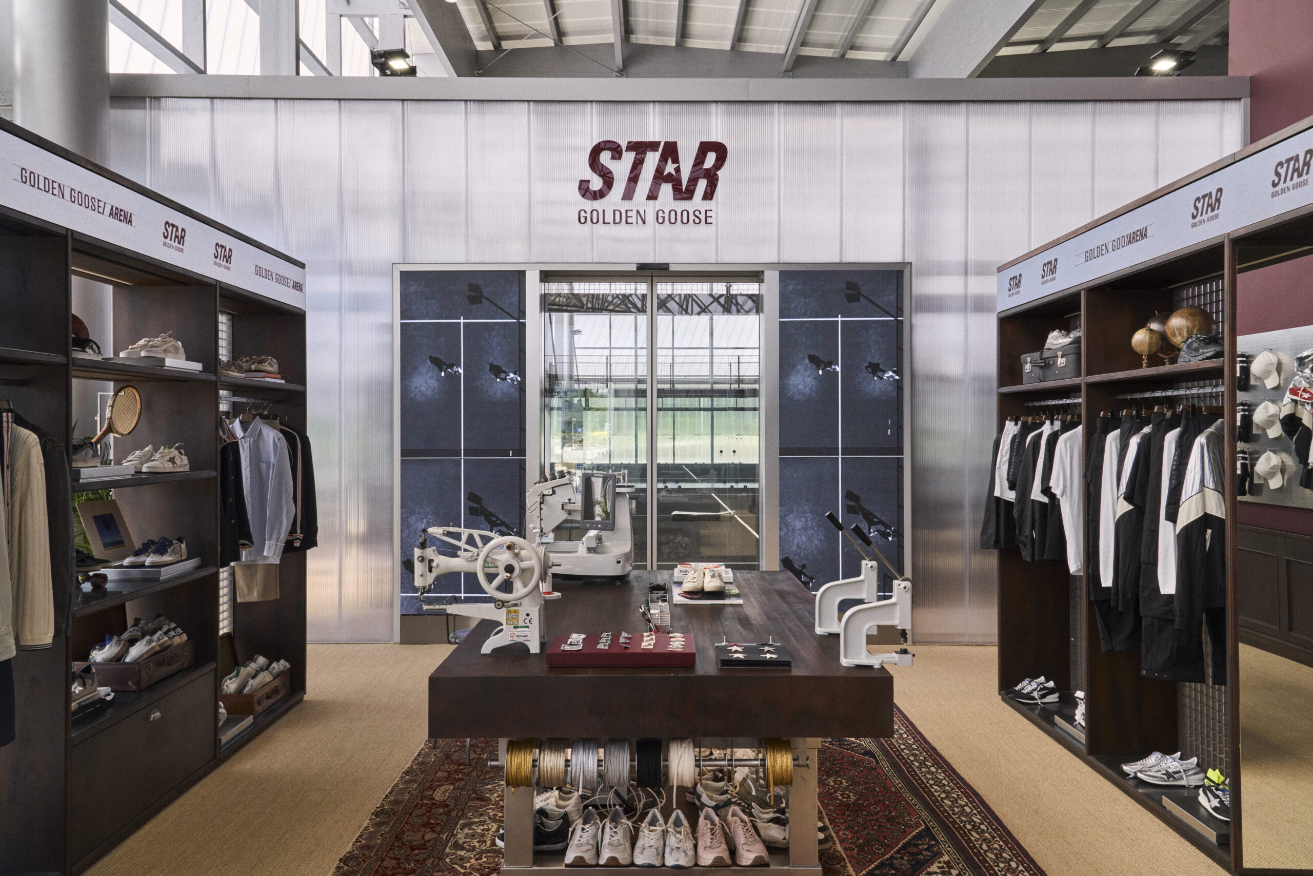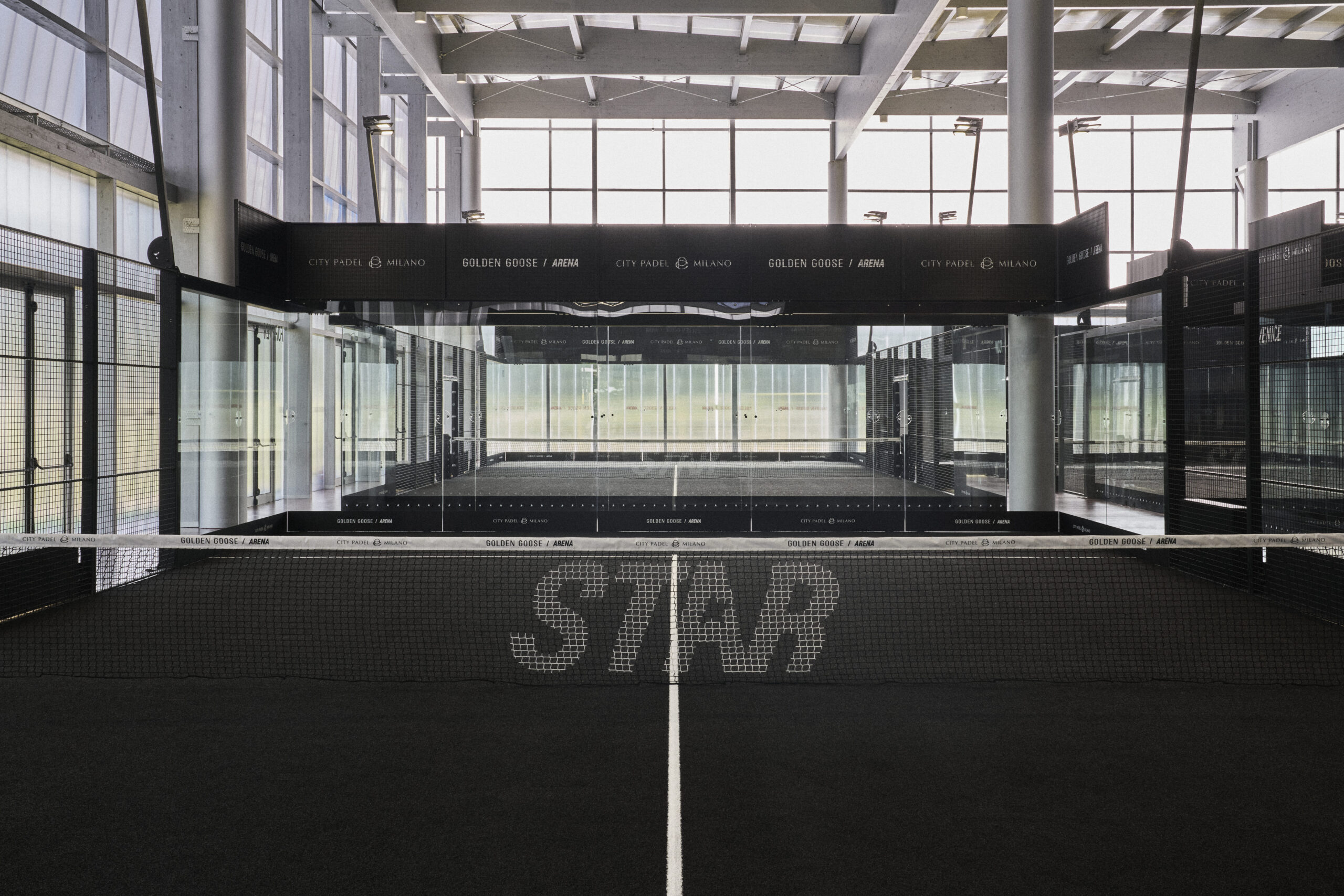 Inside, the Arena features nine padel courts—including six premium indoor courts in total black, an immersive Pro Court with tracking system and LED scoreboard, as well as two outdoor courts. Completing the functional programme are a Wellness Café, an elevated panoramic Lounge and a Store-elements that transform the Arena into a hub for well-being and social life, perfectly aligned with the values of the Golden Goose brand.