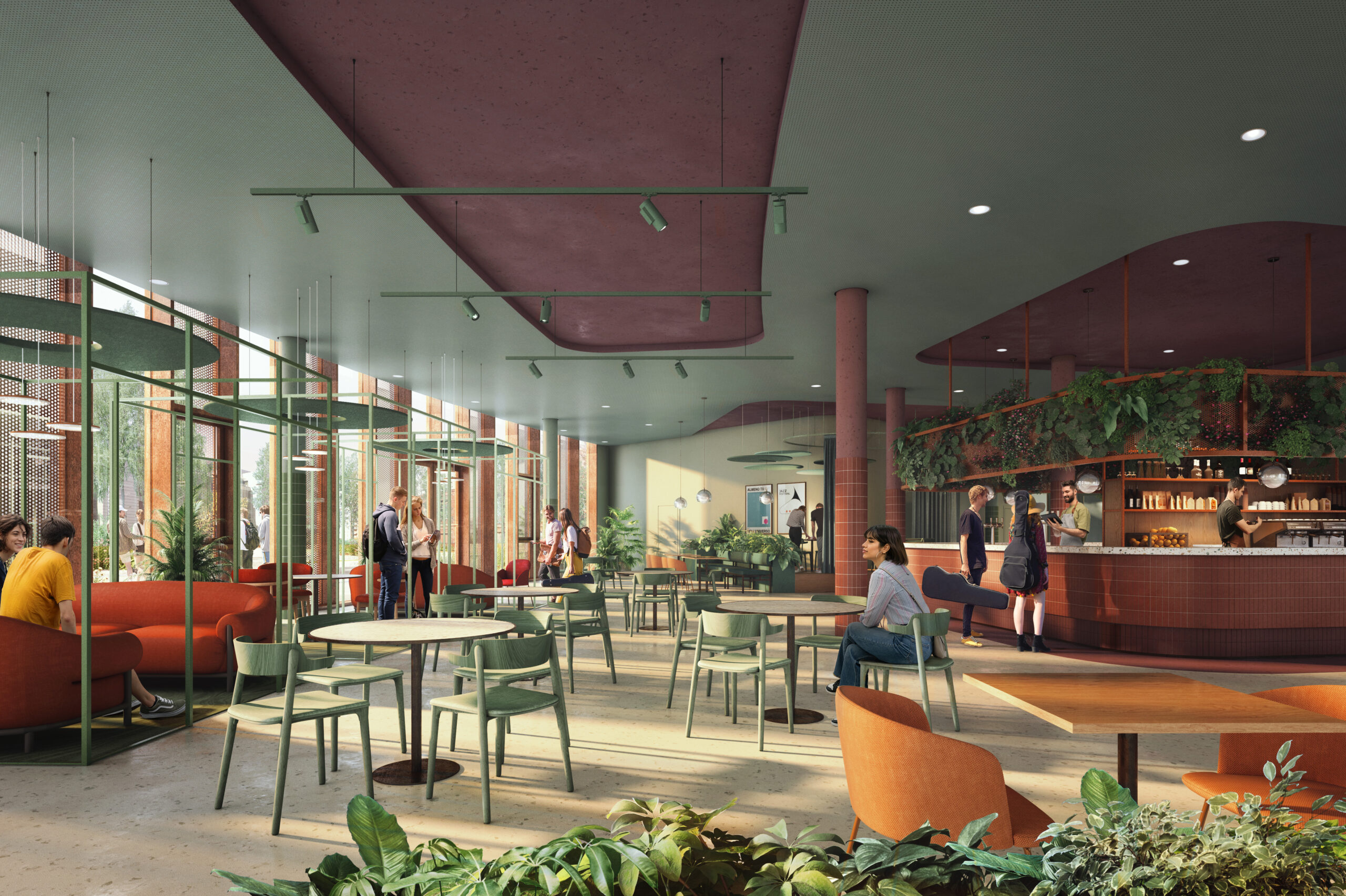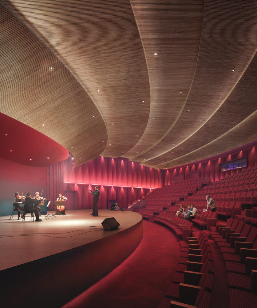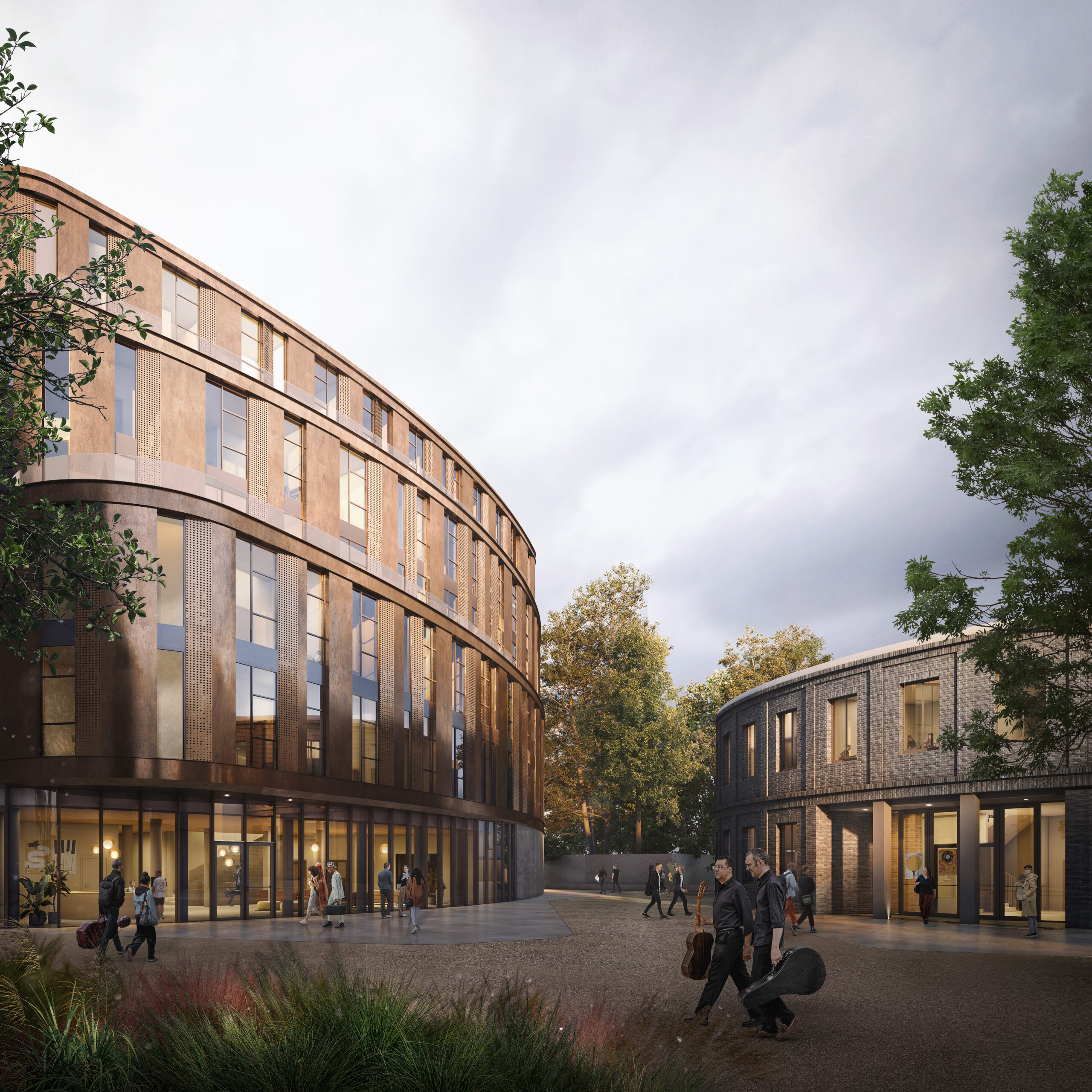 Il campus ospiterà diverse funzioni chiave: un auditorium da 400 posti, pensato come fulcro simbolico del progetto e rivestito con scandole ceramiche in sette diverse tonalità; una residenza universitaria da 200 posti letto; l’edificio ristrutturato Ex Chimici, destinato alla scuola di rock, pop e jazz; e un edificio multifunzionale dedicato alla musica elettronica ed esperimentale, con spazi condivisi, caffetteria e ristorante.