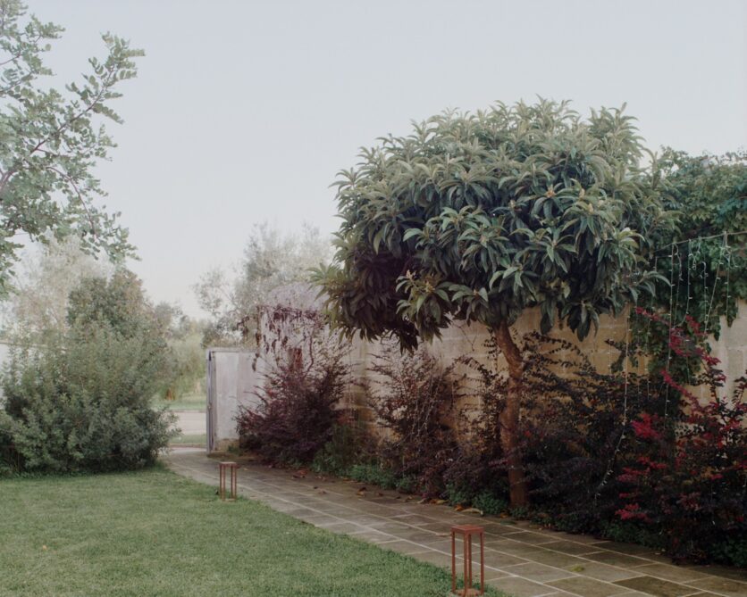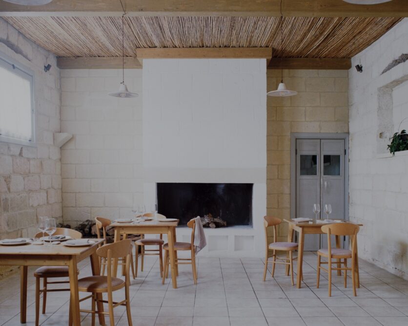 Anche il cortile, liberato dalla copertura lignea incongrua, torna a essere uno spazio centrale del progetto. La protezione parziale è affidata a un dehor in corten, rivestito da un incannucciato lasciato grezzo e integrato da elementi illuminanti in terracotta. Tavoli e arredi, disegnati appositamente, impiegano gli stessi materiali di corten, pietra e legno, rafforzando l’idea di un insieme coerente, costruito per addizione di elementi essenziali e riconoscibili. La masseria torna così a essere una struttura essenziale, capace di accogliere un nuovo uso senza rinunciare alla propria memoria costruttiva.