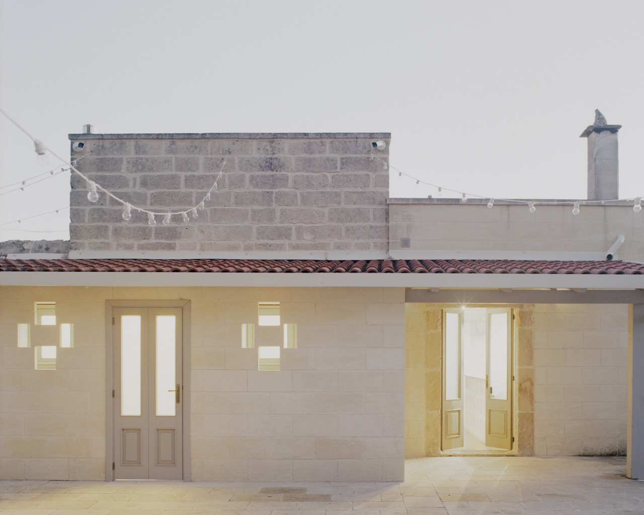 La masseria, storicamente destinata all’allevamento ovino e alla produzione di lana e filati, presenta una struttura originaria riconoscibile in un impianto a corte chiusa. Il nucleo fondativo è definito da un recinto quadrangolare in pietra leccese, alto circa tre metri, concepito come dispositivo di protezione per il bestiame, sul quale si innesta un corpo edilizio voltato articolato in tre ambienti, un tempo utilizzati come opificio e ricovero. L’intervento assume questa stratificazione come materia critica e sceglie di operare per sottrazione, liberando l’architettura dalle sovrascritture per restituire continuità allo spazio, misura alla materia e leggibilità all’impianto originario.