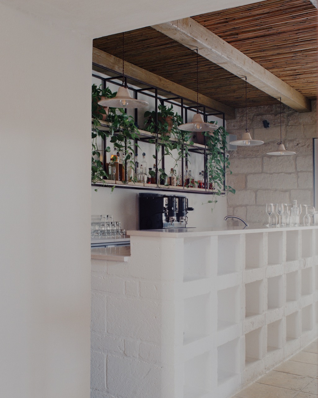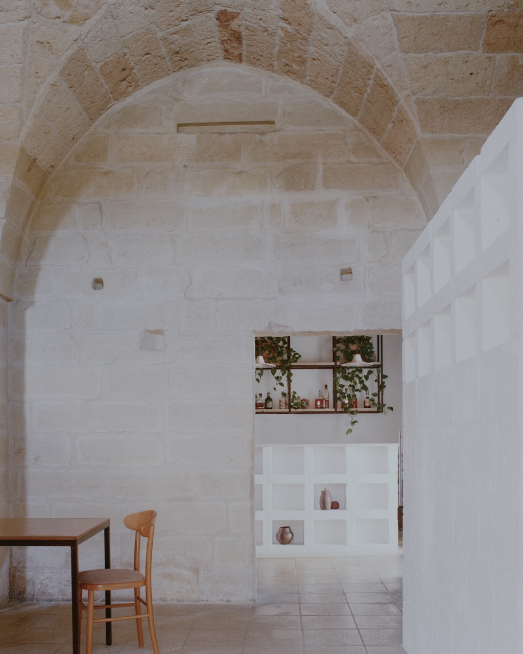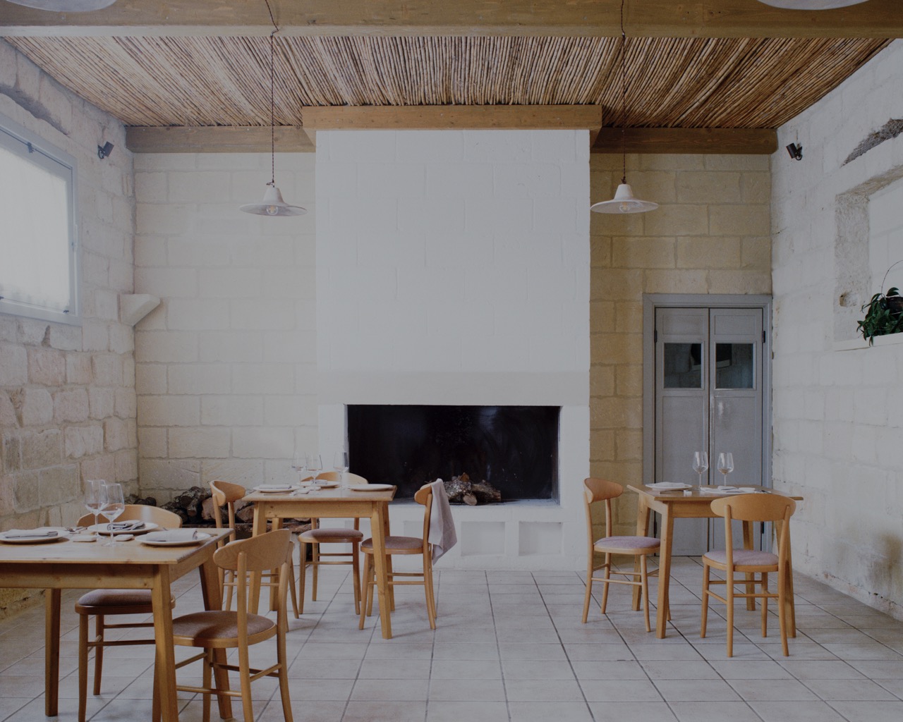 La rifunzionalizzazione degli spazi interni, oggi destinati a ristorante, non avviene attraverso una ridefinizione totale dell’impianto, ma tramite l’inserimento di tre episodi architettonici puntuali: un banco, un focolare e una quinta. Questi elementi, realizzati in pietra di tufo e trattati con scialbature a latte di calce, si dichiarano come presenze contemporanee, distinguendosi cromaticamente e matericamente dalla fabbrica storica. Il loro disegno essenziale e il tema comune del cassettonato instaurano una continuità visiva che attraversa gli ambienti, costruendo una nuova gerarchia spaziale senza sovrapporsi alla struttura esistente.