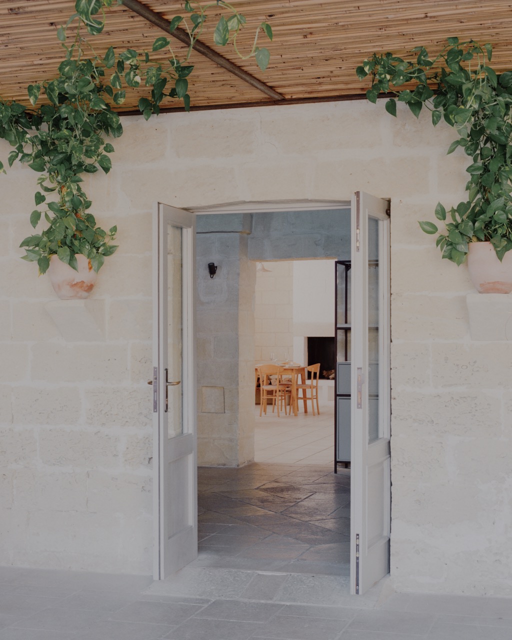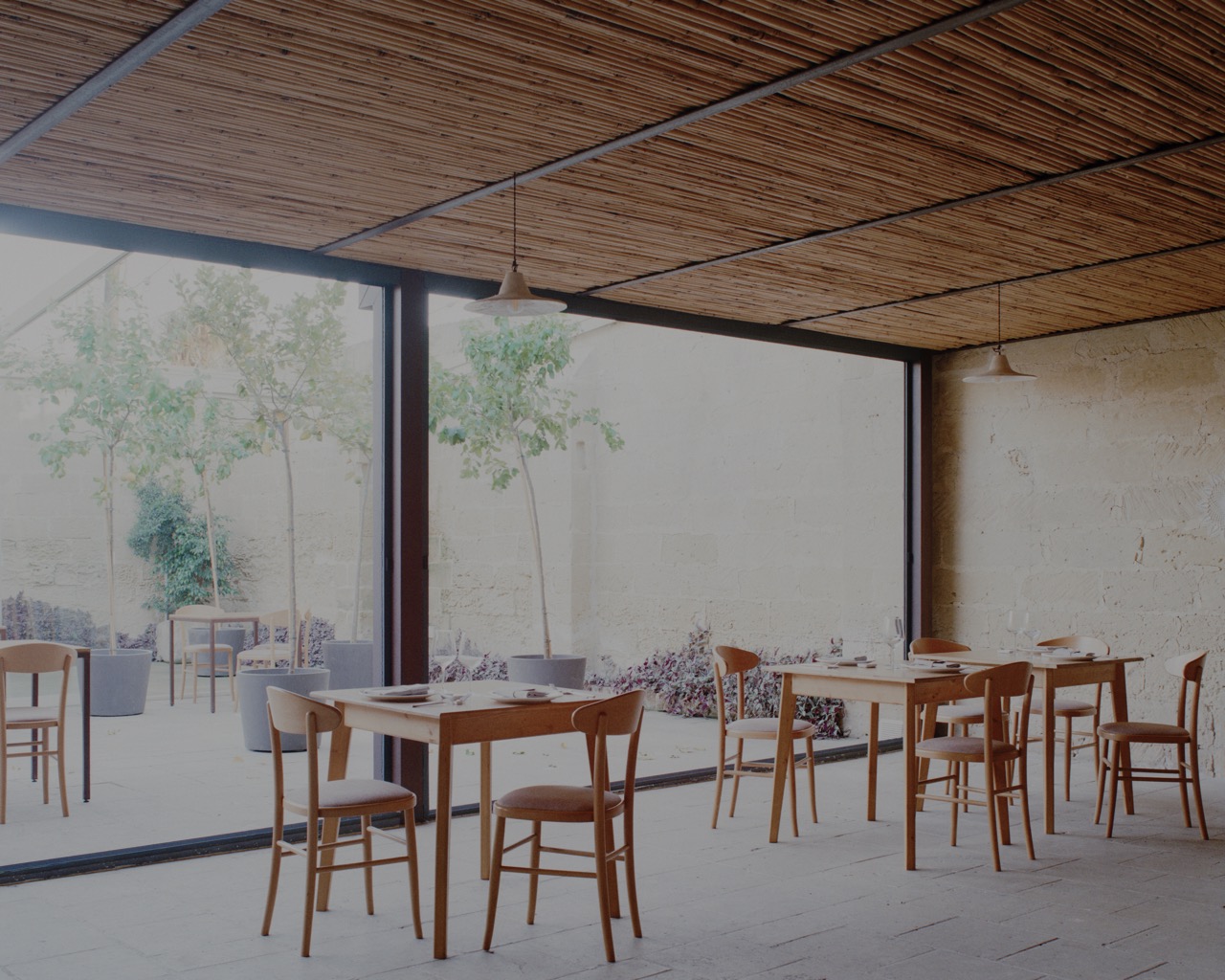 Anche il cortile, liberato dalla copertura lignea incongrua, torna a essere uno spazio centrale del progetto. La protezione parziale è affidata a un dehor in corten, rivestito da un incannucciato lasciato grezzo e integrato da elementi illuminanti in terracotta. Tavoli e arredi, disegnati appositamente, impiegano gli stessi materiali di corten, pietra e legno, rafforzando l’idea di un insieme coerente, costruito per addizione di elementi essenziali e riconoscibili. La masseria torna così a essere una struttura essenziale, capace di accogliere un nuovo uso senza rinunciare alla propria memoria costruttiva.