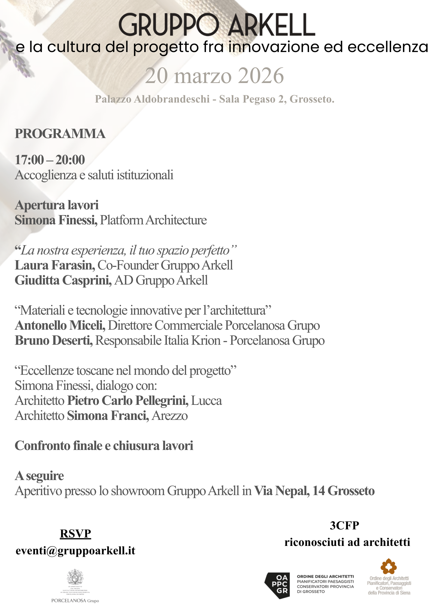 The event, accredited with 3 CPD points for architects, will conclude with a social gathering at Gruppo Arkell’s showroom in Grosseto (Via Nepal, 14), offering participants a further informal space for dialogue and discussion.