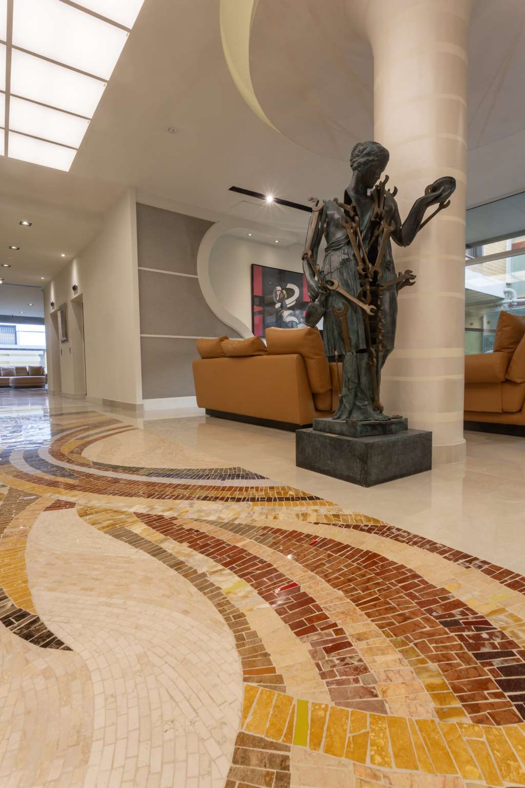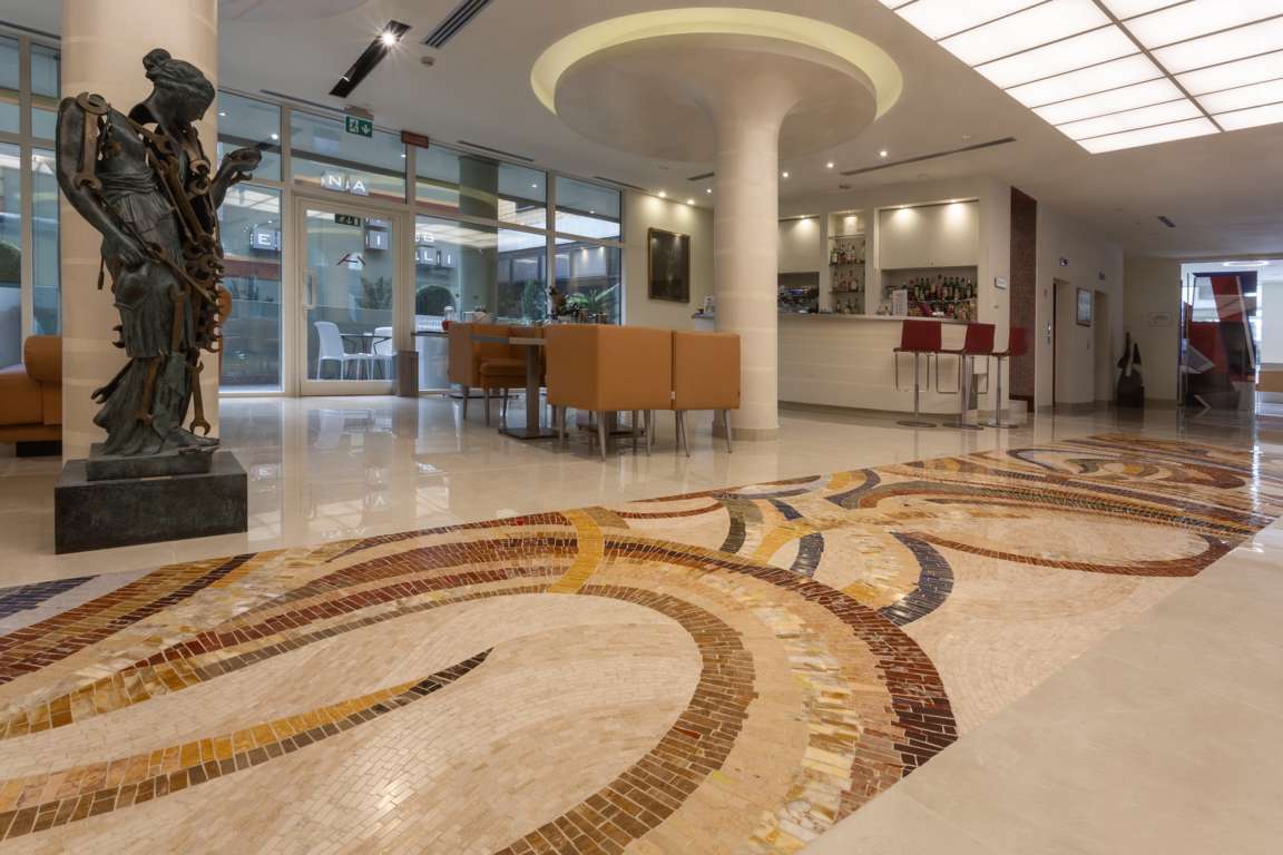 Tra le suggestioni senza tempo dei Navigli e l’energia creativa della Milano del design, della moda e dell’arredo, l’Art Hotel Navigli accoglie i suoi ospiti in ambienti eleganti e funzionali, impreziositi da una significativa presenza artistica. Proprio all’interno di questo percorso visivo si inserisce l’intervento del mosaico realizzato da Friul Mosaic in occasione della ristrutturazione della hall al piano terra, un progetto fortemente voluto dalla proprietà e affidato all’architetto Biagio Forino, con l’obiettivo di conferire carattere e valore all’opera di rinnovamento.