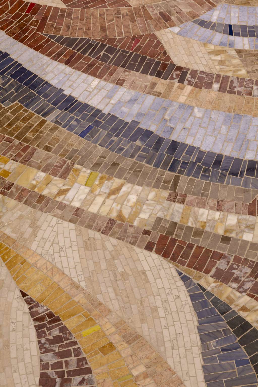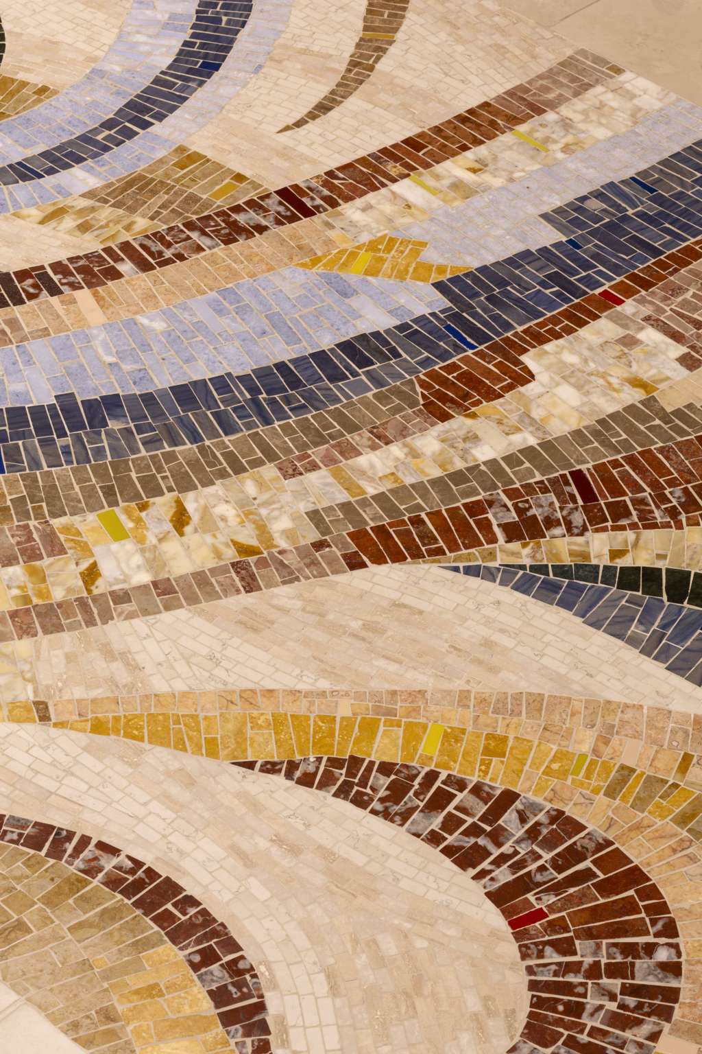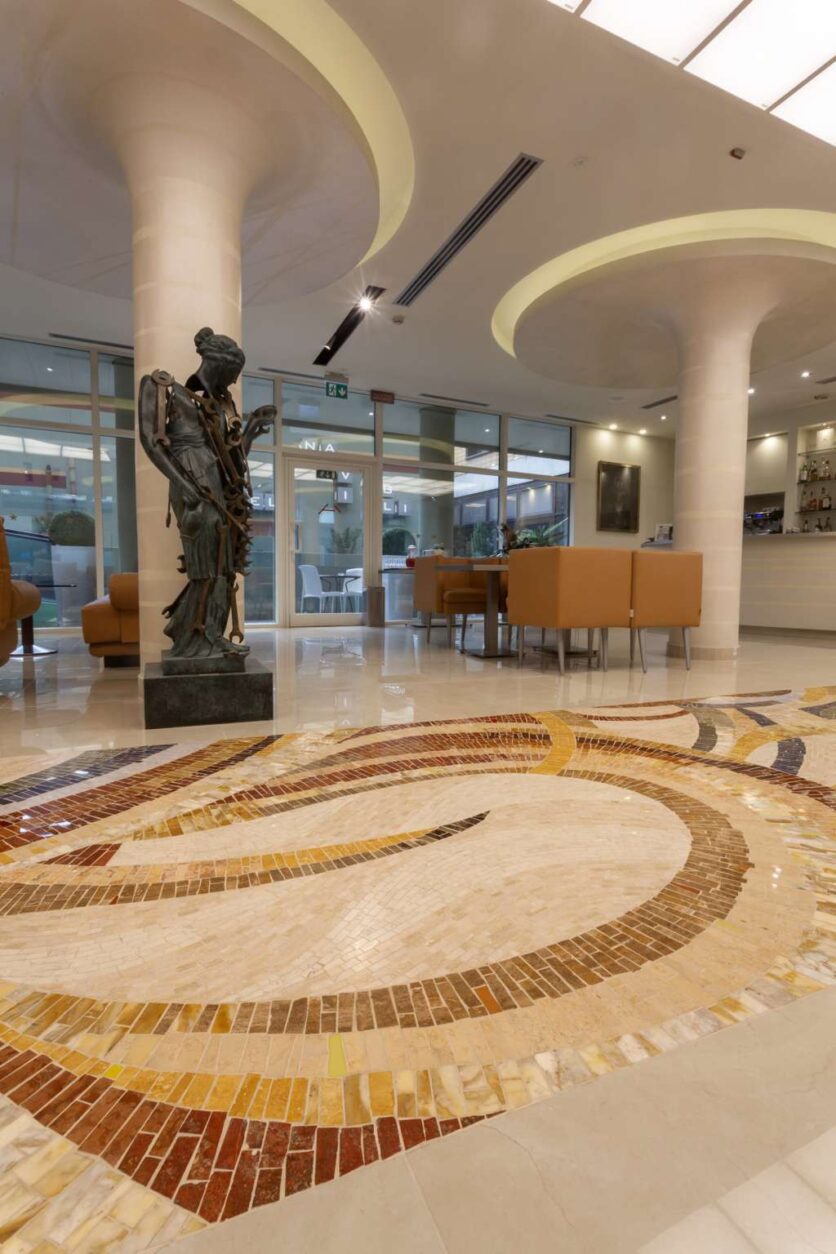 L’idea del mosaico è nata per inserire nel progetto un elemento distintivo, capace di dialogare con la collezione di opere d’arte presenti nell’hotel e di rafforzarne l’identità estetica attraverso un linguaggio contemporaneo. Per la sua realizzazione sono stati scelti materiali di grande pregio, unendo marmi, pietre naturali e smalti veneziani, accostati in modo dinamico e raffinato. La lavorazione è avvenuta con tecnica a rovescio su carta, reinterpretata in chiave moderna grazie all’impiego di tessere di dimensioni differenti, che spaziano da formati minuti a pezzature più importanti, creando ritmo, profondità e un forte impatto visivo.