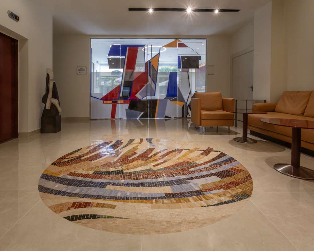 Friul Mosaic, laboratorio specializzato nella progettazione e produzione di mosaici artistici personalizzati, ha collaborato a stretto contatto con l’architetto, mettendo a disposizione competenza artigianale e sensibilità progettuale per tradurre l’idea iniziale in un’opera musiva attuale, sperimentale e perfettamente integrata nello spazio, capace di impreziosire la hall e di raccontare, attraverso materia e tecnica, un dialogo riuscito tra tradizione e contemporaneità.