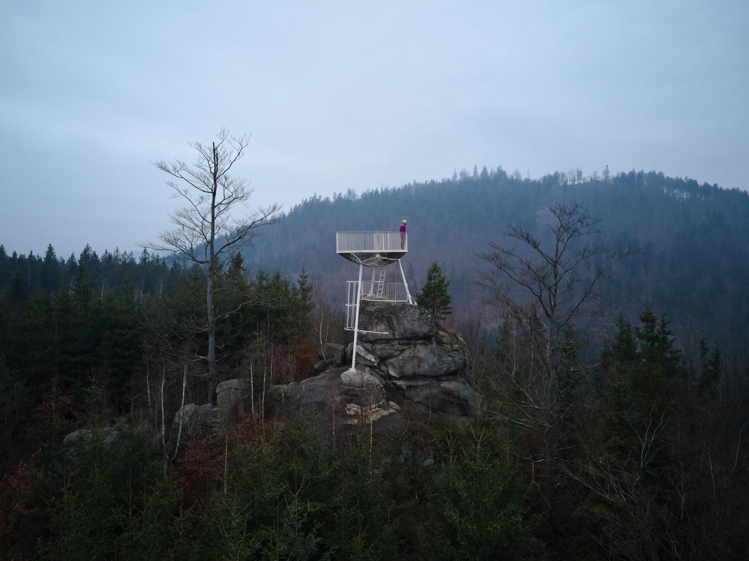 The belvedere is located on the upper rock of Malý Špičák and looks down into the valley of the confluence of the Desná and Kamenice rivers in the Czech Republic. This was the starting point of the Tanvald bobsleigh track, an important point of sporting activity in its time. The remains of the bobsleigh track on the Malý Špičák slope indicate its former route. In a way, Špička also serves as a tribute to the regional heroes in tight suits, who fearlessly drove their shiny bobsleighs through steep curves in the desire to cut every second off their time.