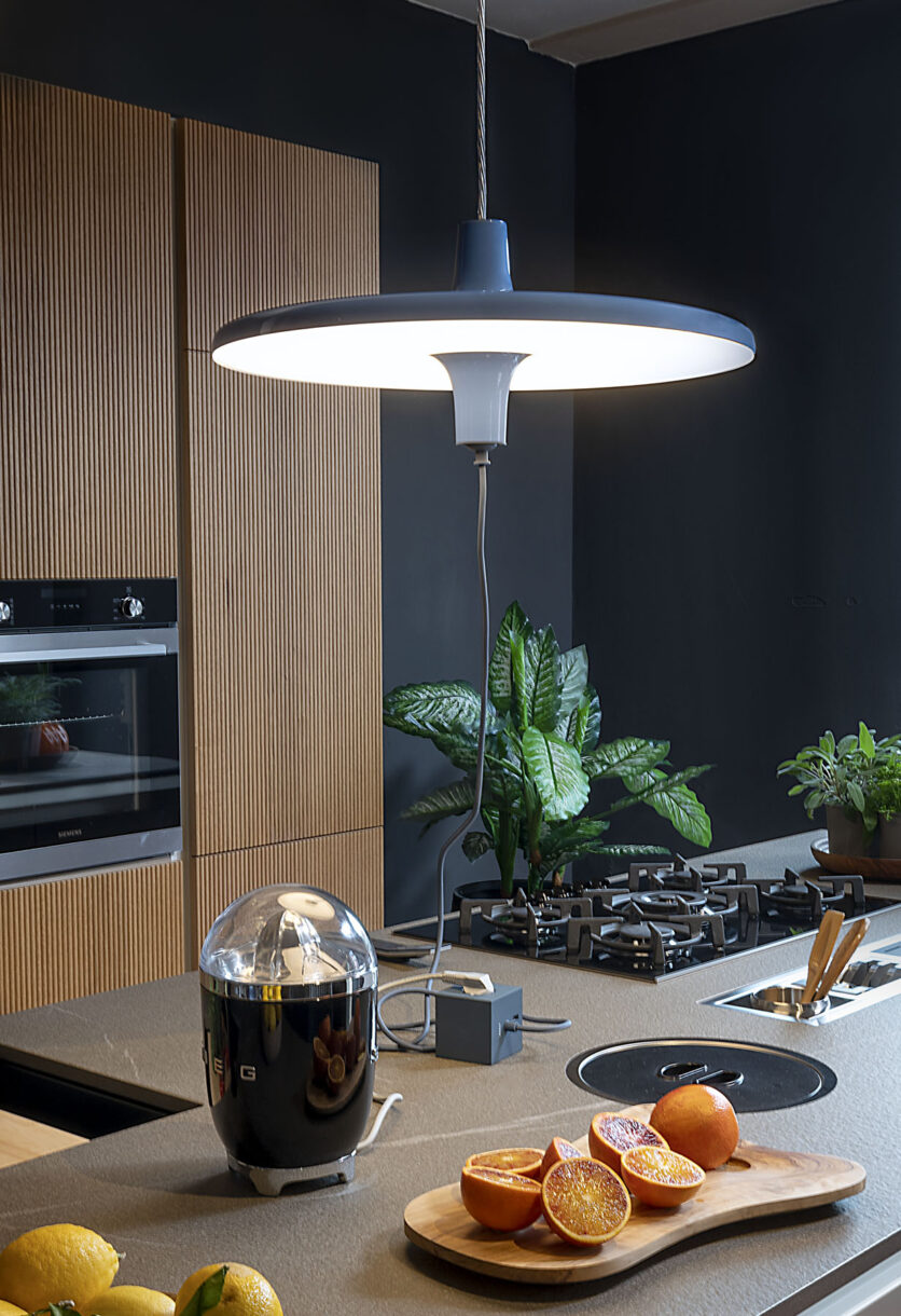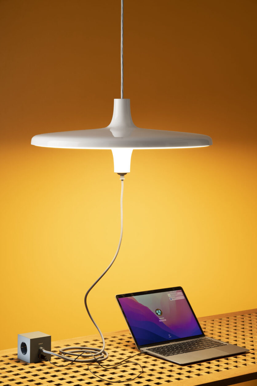 Ogni dettaglio del progetto è pensato per favorire un uso fluido e naturale dei dispositivi elettrici, facilitando il lavoro da casa come in ufficio e trasformando lo spazio in un’officina creativa, dove estetica e funzione convivono senza frizioni. La struttura in alluminio verniciato nei toni arancio, azzurro, bianco e nero si combina con una sorgente LED dimmerabile che diffonde una luce diretta e soffusa, mentre l’alimentatore elettronico integrato nel rosone mantiene pulita la linea visiva dell’oggetto. Per chi necessita di ulteriori punti di alimentazione, è disponibile una multipresa da tavolo completa di tre Shuko e due porte USB.