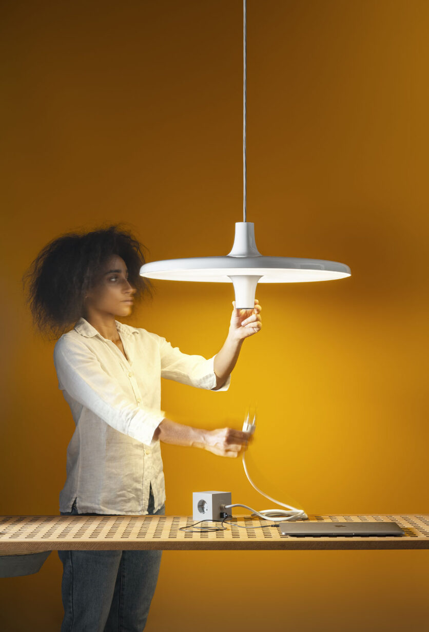 L’evoluzione di questo progetto porta oggi alla nascita di due nuove varianti, Avro Junior e la versione con sola presa, pensate per ampliare le possibilità d’uso e semplificare ulteriormente la vita quotidiana. La possibilità di agganciare le lampade a un binario consente di spostarle con precisione e senza sforzo, rendendo l’installazione particolarmente adatta agli ambienti lavorativi e pubblici, dove la configurazione dello spazio può cambiare rapidamente. Avro Junior risponde alle esigenze degli ambienti più contenuti grazie al diametro ridotto del diffusore, mentre la versione che integra esclusivamente la presa fornisce un accesso immediato all’elettricità in coworking, open space o zone in cui non occorre aggiungere una fonte luminosa. In quest’ultima soluzione, il design si arricchisce di un secondo cono speculare al primo, tra i quali un piccolo diffusore pulsa a intervalli regolari con una luce morbida, segnalando in modo delicato il funzionamento della presa.