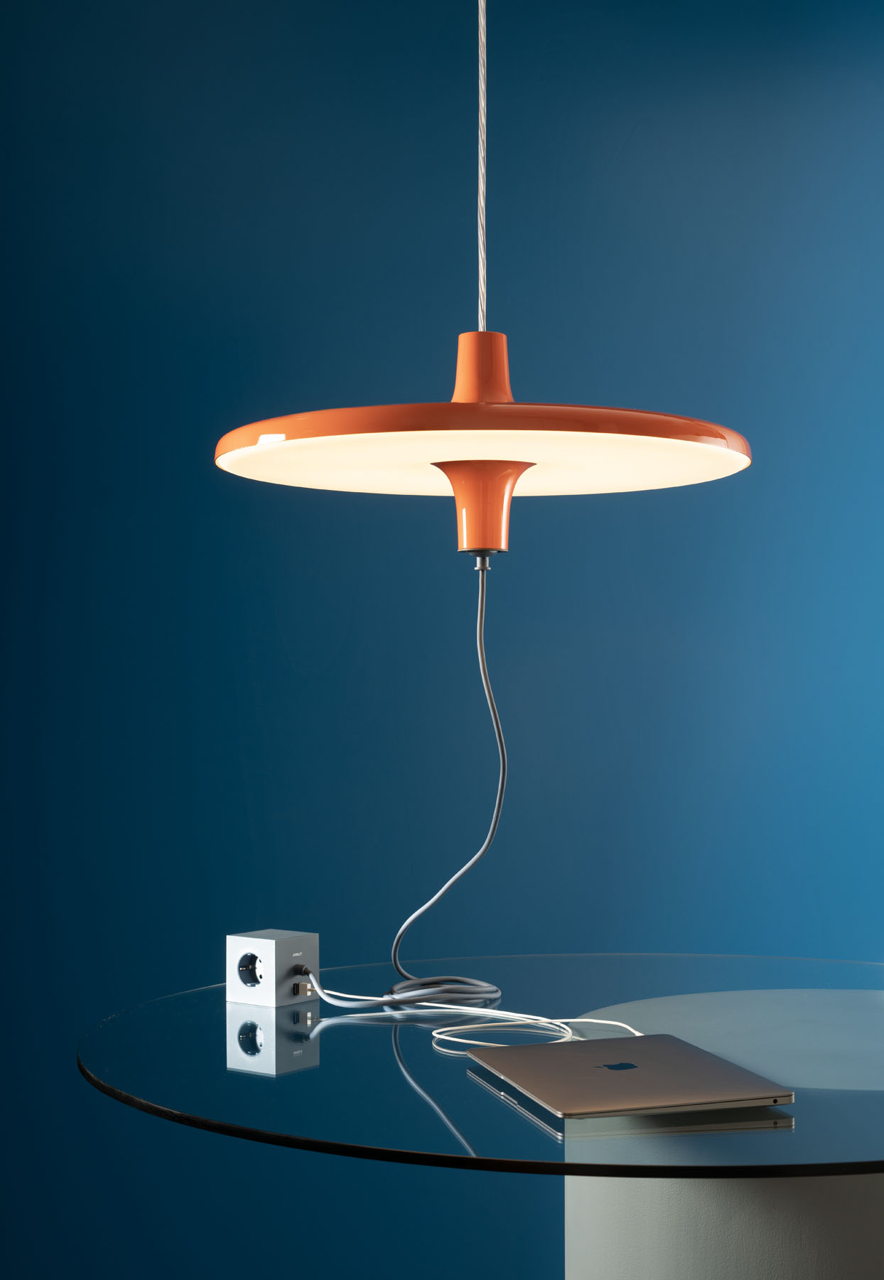 Ogni dettaglio del progetto è pensato per favorire un uso fluido e naturale dei dispositivi elettrici, facilitando il lavoro da casa come in ufficio e trasformando lo spazio in un’officina creativa, dove estetica e funzione convivono senza frizioni. La struttura in alluminio verniciato nei toni arancio, azzurro, bianco e nero si combina con una sorgente LED dimmerabile che diffonde una luce diretta e soffusa, mentre l’alimentatore elettronico integrato nel rosone mantiene pulita la linea visiva dell’oggetto. Per chi necessita di ulteriori punti di alimentazione, è disponibile una multipresa da tavolo completa di tre Shuko e due porte USB.