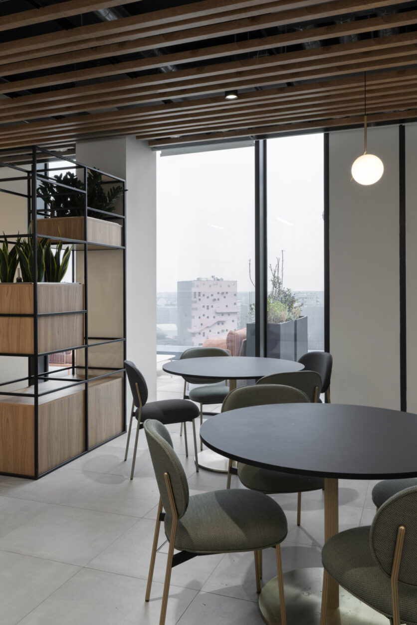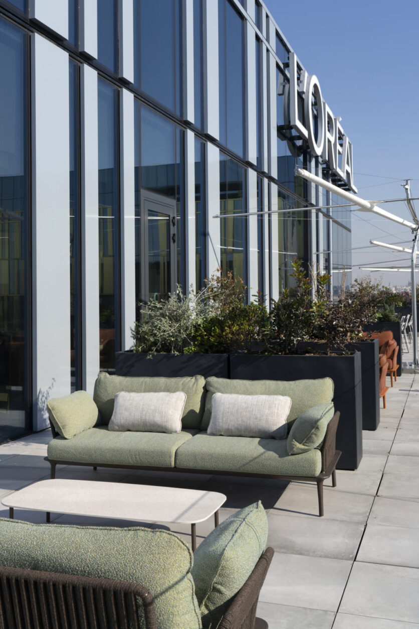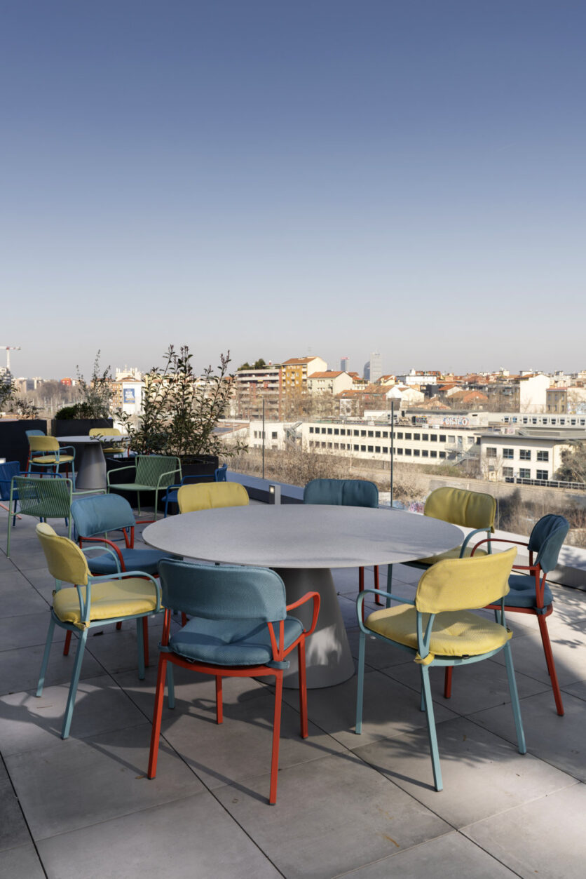 In questi ambienti trovano perfetta armonia le collezioni Pedrali: le sedute Nym, anche nella versione imbottita, firmate da Cazzaniga Mandelli Pagliarulo, gli sgabelli Babila di Odo Fioravanti, le poltrone Malmö di Cazzaniga Mandelli Pagliarulo e le poltrone Héra di Patrick Jouin, i tavoli Stylus e Arki-Table, oltre agli sgabelli Jazz e Folk, ideali per spazi versatili e contemporanei. Le zone lounge accolgono le sedute e i tavolini Blume di Sebastian Herkner, dalle linee morbide e raffinate, mentre le poltrone Ila e Héra di Patrick Jouin, abbinate ai coffee table Malmö, creano salotti intimi e confortevoli. Anche gli spazi esterni assumono un ruolo sempre più importante nel benessere lavorativo: terrazze e aree outdoor diventano veri e propri luoghi di incontro e concentrazione, dove lavorare o rilassarsi in armonia con l’ambiente. Sulla terrazza del quartier generale di L’Oréal, i divani Reva Twist di Patrick Jouin, caratterizzati da un intreccio realizzato con una corda piatta in polipropilene, convivono con i coffee table Buddy di Busetti Garuti Redaelli, le poltrone Intrigo di Dondoli e Pocci, i tavoli Ikon di Pio & Tito Toso e le poltrone Tribeca di Mandelli Pagliarulo, componendo un salotto all’aperto che celebra il design italiano e la convivialità.