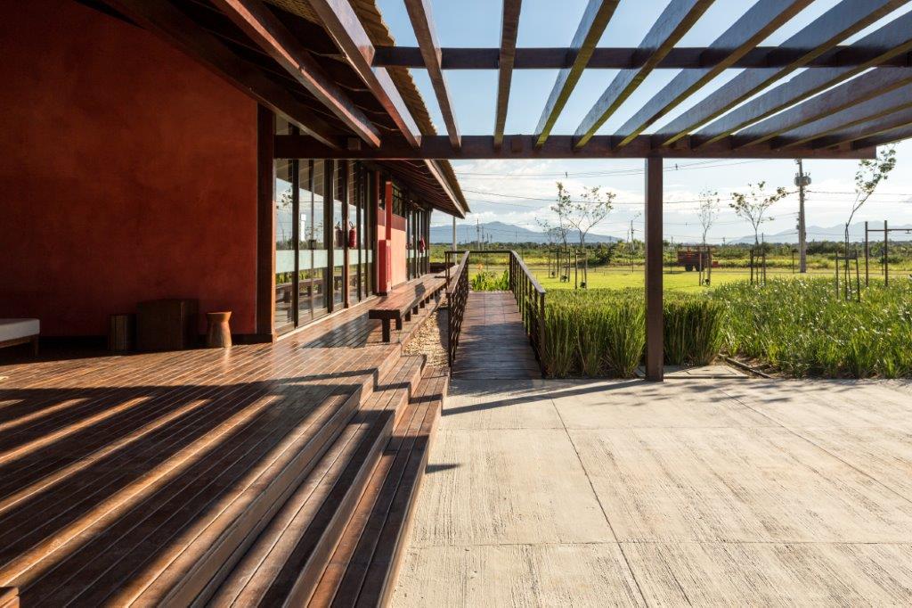 A terraced circulation circumvents the whole building and guarantees access to the collective programs that have glassware bolting on both sides, ensuring visual integration with the landscape. In closed programs, such as toilets and technical areas, the use of a red pigmented mass that reinforces the identity of the building and makes reference to the traditional constructions of the Northeast.