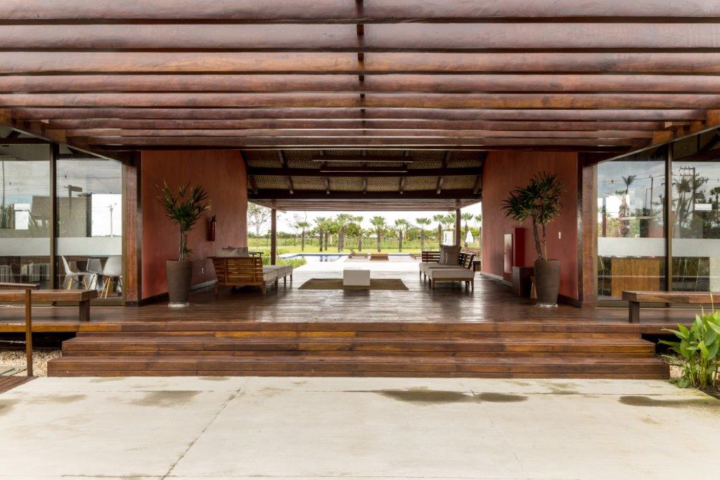 Set in a completely flat land, the building designed to the clubhouse, concentrates the entire brief into a single linear pavilion with 60 meters in length. This is composed of modules of 5×7.50 meters and rises 50 centimeters in relation to the original dimension of the ground. The access axis is implanted transversally to the building, defined by a large pergola of wood that crosses the pavilion. At one end of the pergola is the users access control. In the opposite side, the pools. This main circulation divides the pavilion into two wings that concentrate on one side the gym, changing rooms, playroom, game room and on the other side the party hall with other areas of support and services of the brief.