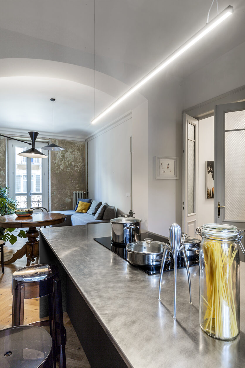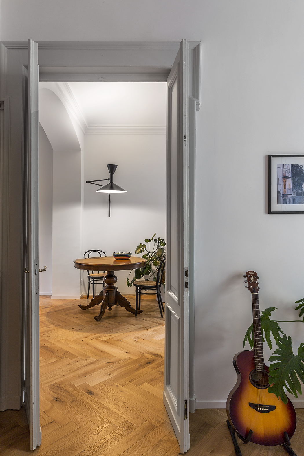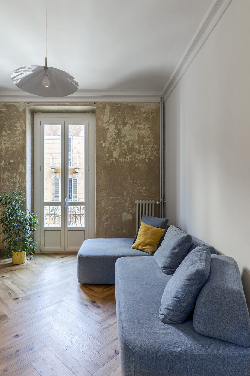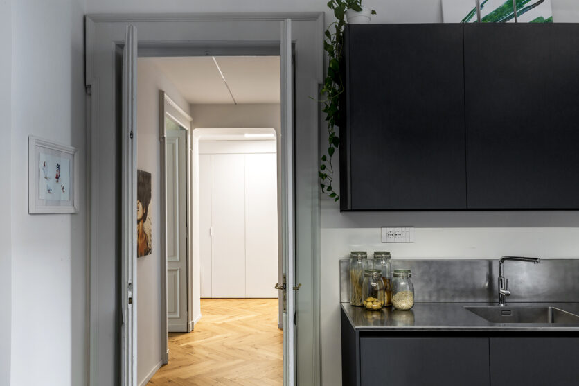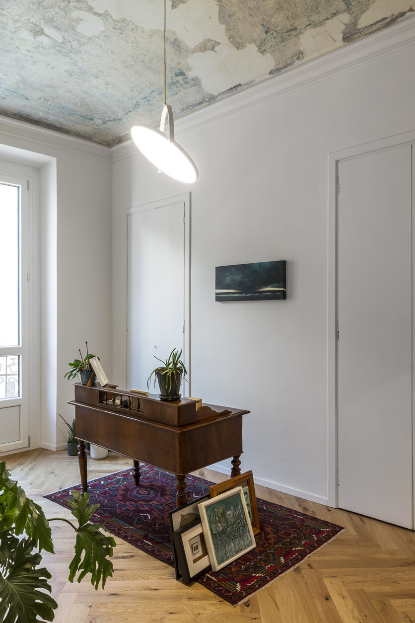 Particolare attenzione è stata dedicata al recupero delle porte interne originali, restaurate e riverniciate per preservare l’impronta liberty dell’edificio. L’unica eccezione è la porta filomuro che dissimula l’ingresso al bagno secondario, scelta per rispettare la continuità stilistica. Dettagli come la riapertura di un antico accesso condominiale, oggi nicchia portaoggetti, riportano in luce la stratificazione storica dell’abitare. Per gli arredi è stato adottato un approccio eclettico, capace di far convivere pezzi antichi e contemporanei senza forzature, mentre l’illuminazione si affida a elementi iconici che impreziosiscono gli ambienti con sobrietà.
