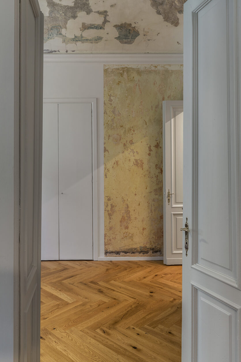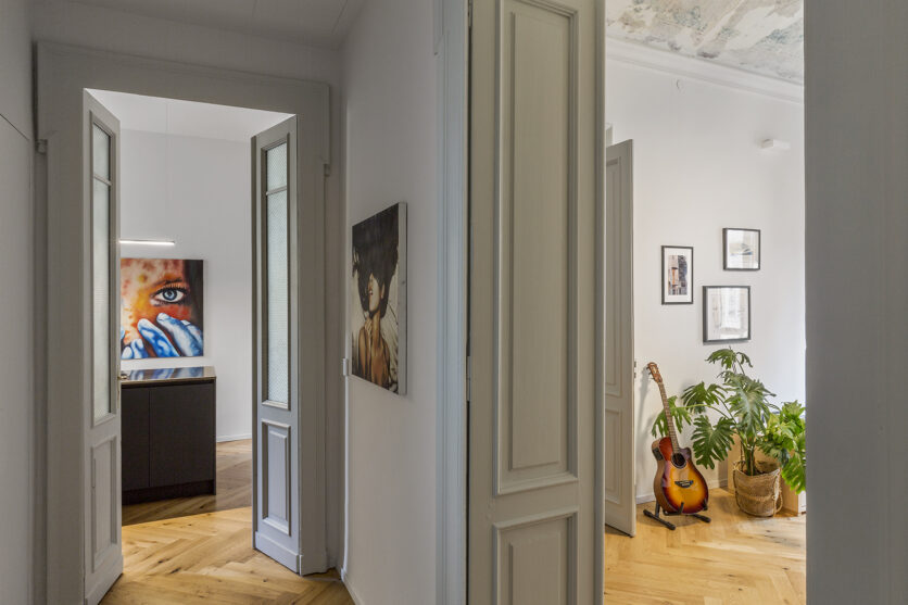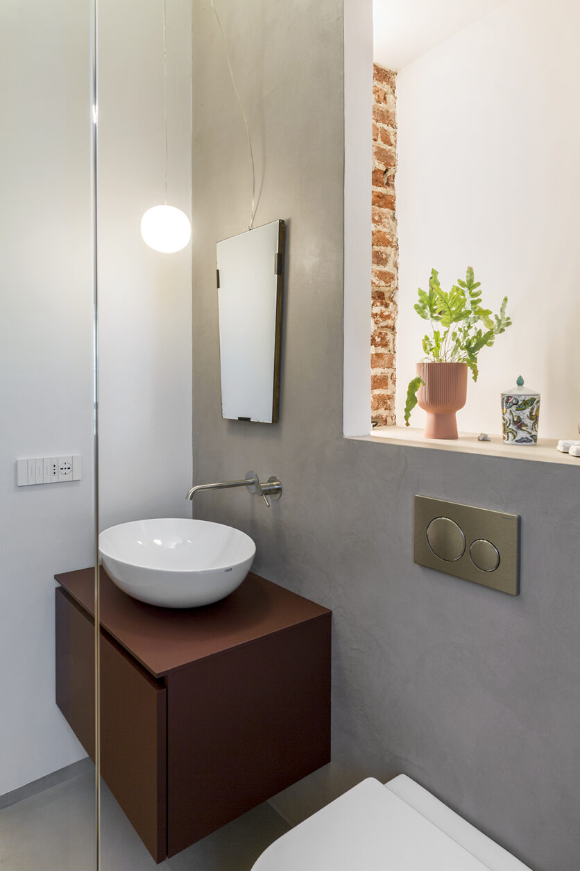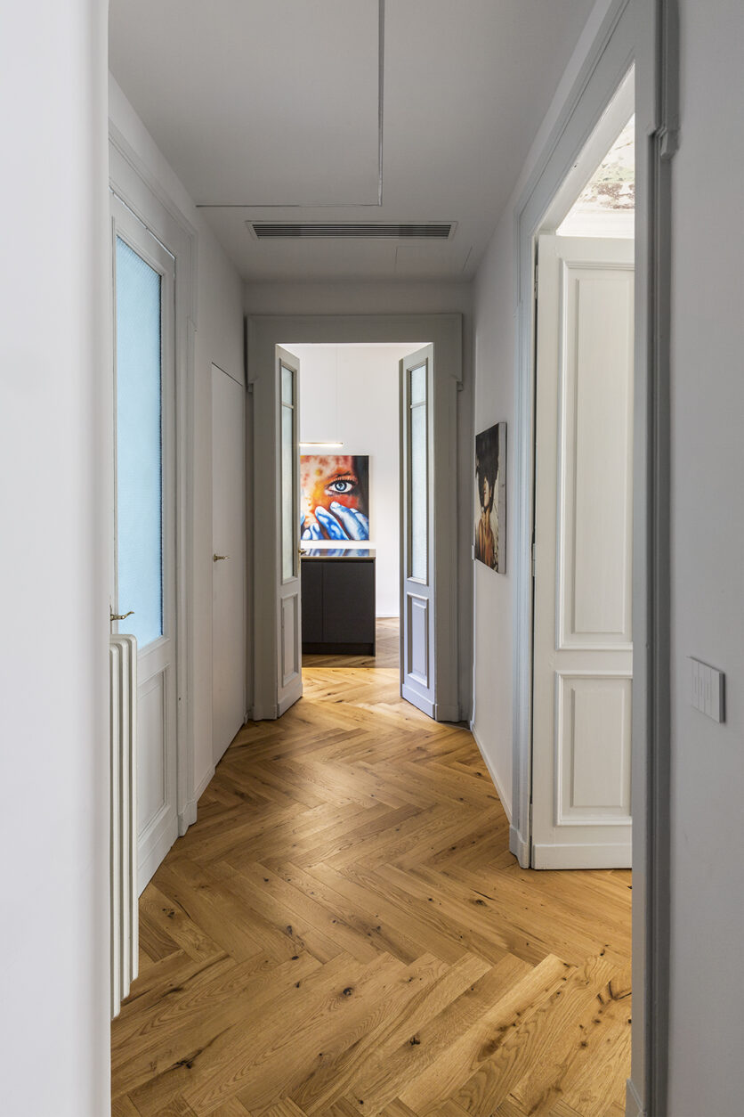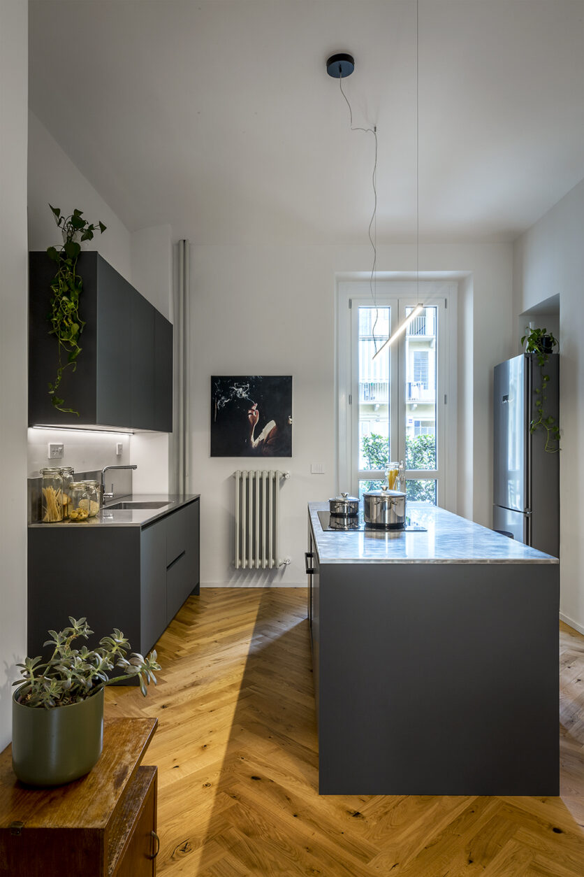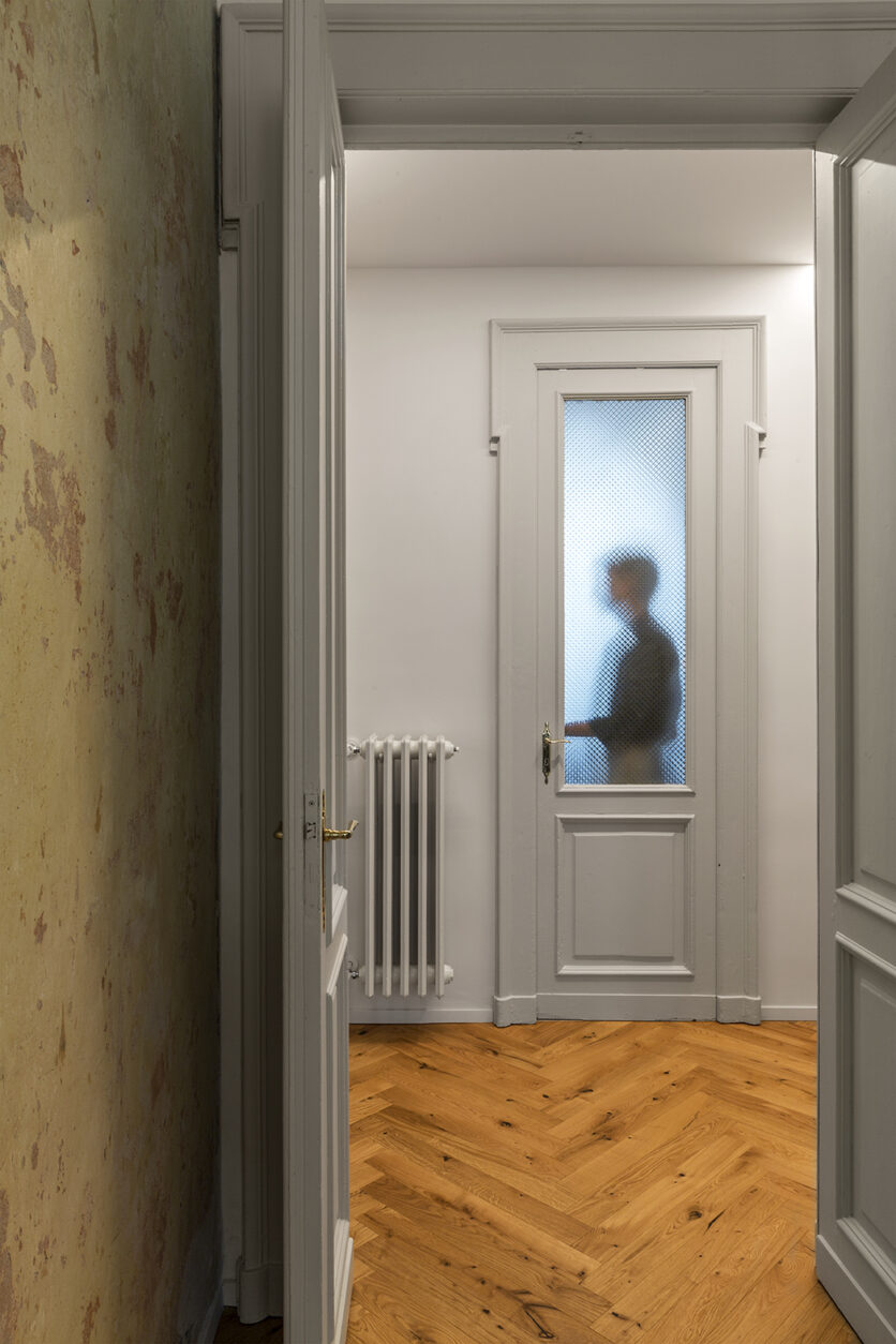 Particolare attenzione è stata dedicata al recupero delle porte interne originali, restaurate e riverniciate per preservare l’impronta liberty dell’edificio. L’unica eccezione è la porta filomuro che dissimula l’ingresso al bagno secondario, scelta per rispettare la continuità stilistica. Dettagli come la riapertura di un antico accesso condominiale, oggi nicchia portaoggetti, riportano in luce la stratificazione storica dell’abitare. Per gli arredi è stato adottato un approccio eclettico, capace di far convivere pezzi antichi e contemporanei senza forzature, mentre l’illuminazione si affida a elementi iconici che impreziosiscono gli ambienti con sobrietà.