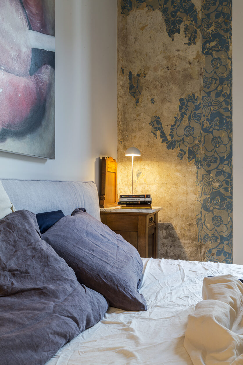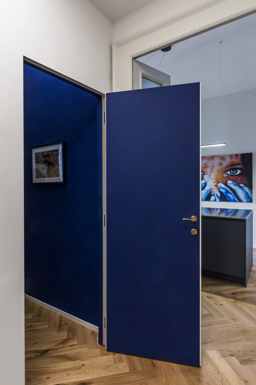 Durante i lavori è emersa una volta affrescata nella zona studio, liberata dagli strati che la ricoprivano e oggi integrata nel progetto come testimonianza preziosa. Gli interni dialogano tra stratificazioni storiche e interventi dal carattere deciso: i due nuovi bagni, ad esempio, adottano tonalità audaci come il blu Klein e un elegante color sabbia, realizzati con micromalta cementizia pigmentata e trattata per garantire durabilità.