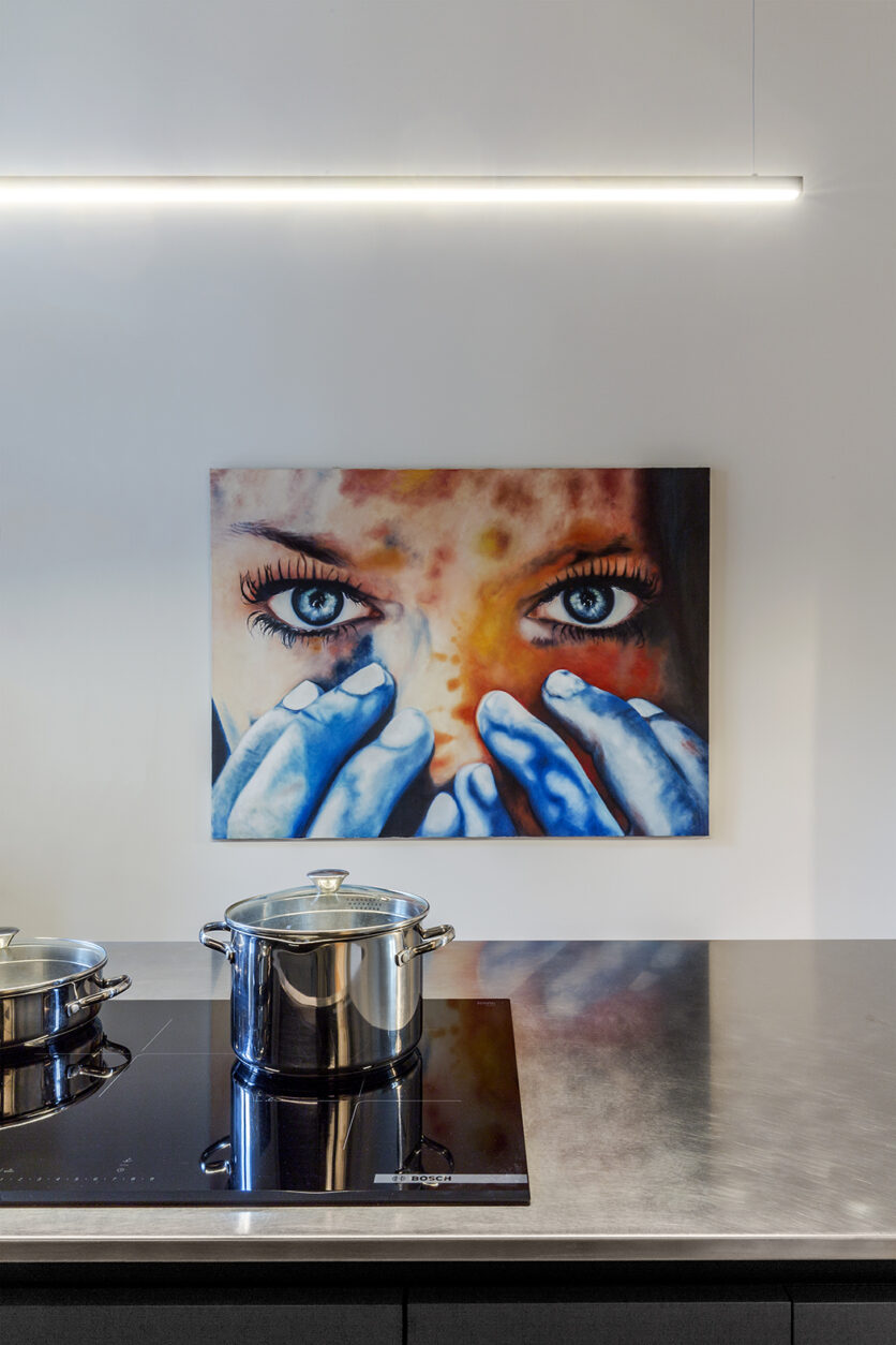 La zona giorno è stata ridefinita con la demolizione del muro che separava cucina e soggiorno, dando vita a uno spazio aperto e fluido centrato su un’isola conviviale. Qui materiali e colori giocano su contrasti eleganti: l’acciaio, che riflette e amplifica la luce, si combina con le tonalità profonde del verde comodoro.