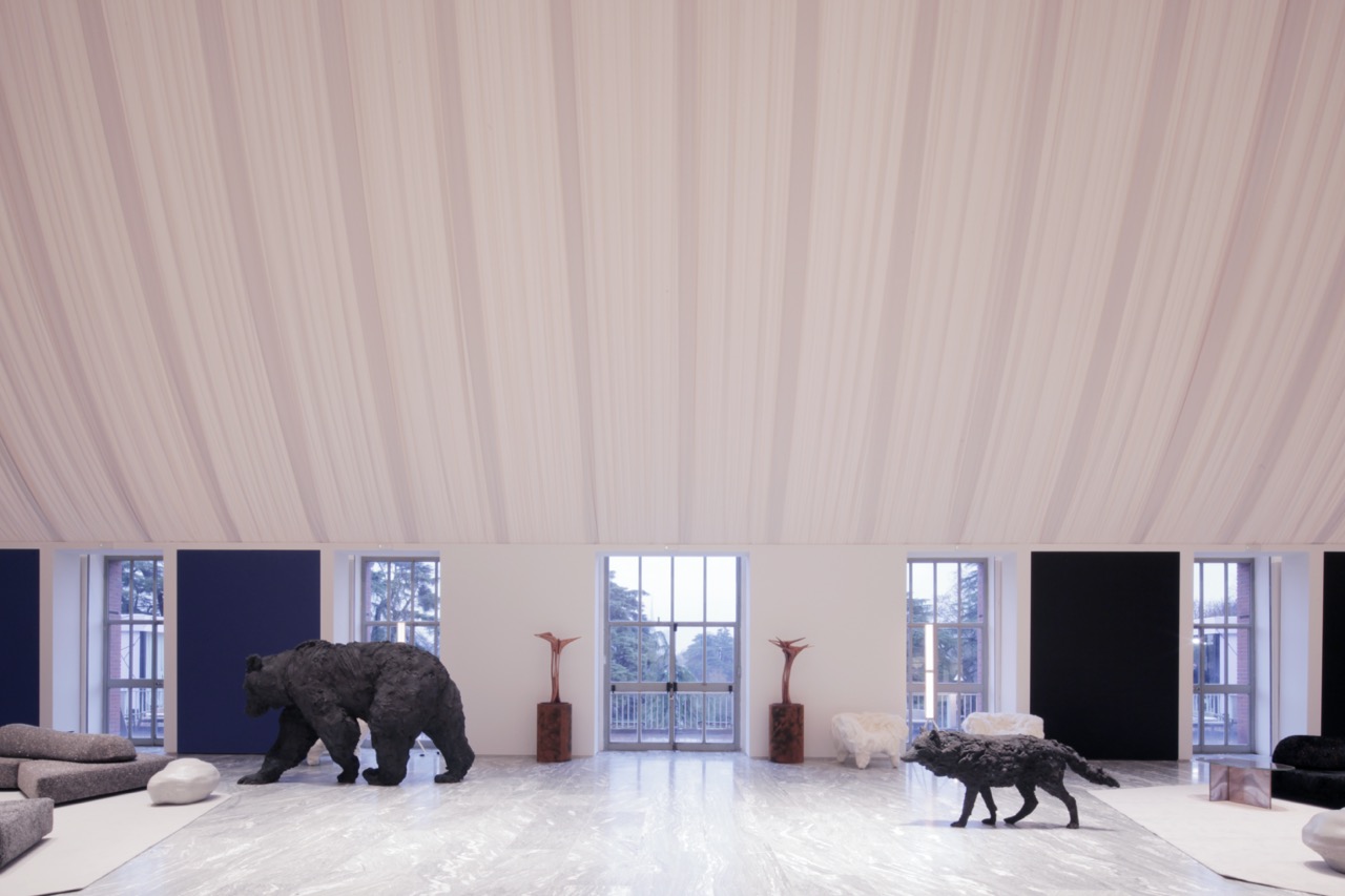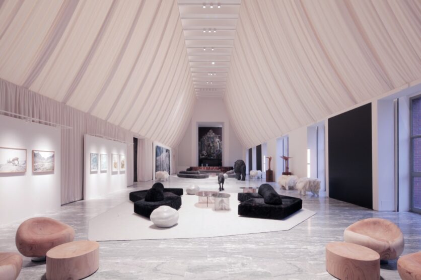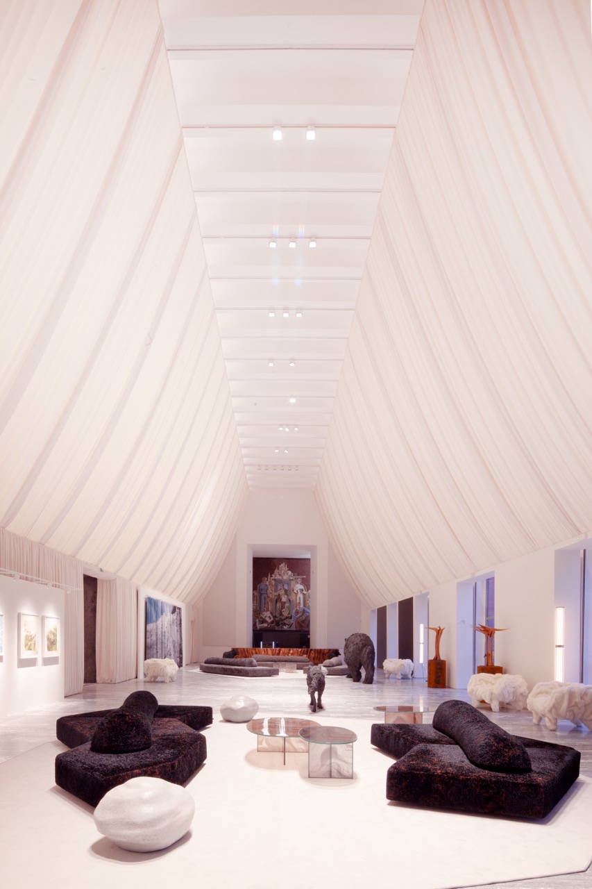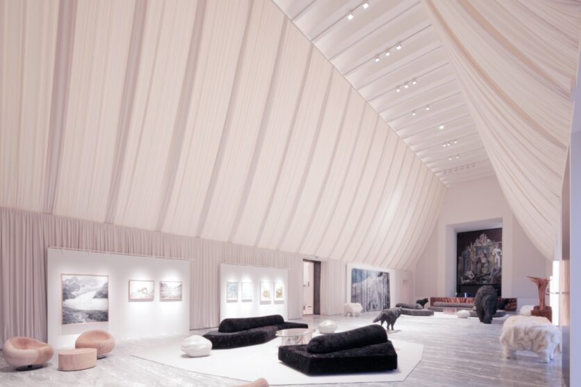 Nel Salone d’Onore, un panneggio in velluto bianco inclinato a doppia falda ridimensiona l’altezza monumentale dello spazio, riportandolo a una scala percettiva più intima. La palette neutra – bianco, grigio, nero – è animata dalla presenza di opere d’arte e di design che costruiscono un paesaggio interno fatto di sculture, tappeti, sedute e tavoli, in dialogo con materiali naturali. Il portale di accesso alla mostra “Musa” riprende forme e materiali delle altre sedi, stabilendo un segno di continuità tra le tre Case. Nello spazio vetrato del ristorante, affacciato sullo skyline milanese, l’intervento sostituisce arredi e tende, introducendo una moquette in filato riciclato che rievoca i paesaggi invernali attraverso la materia e la cromia.