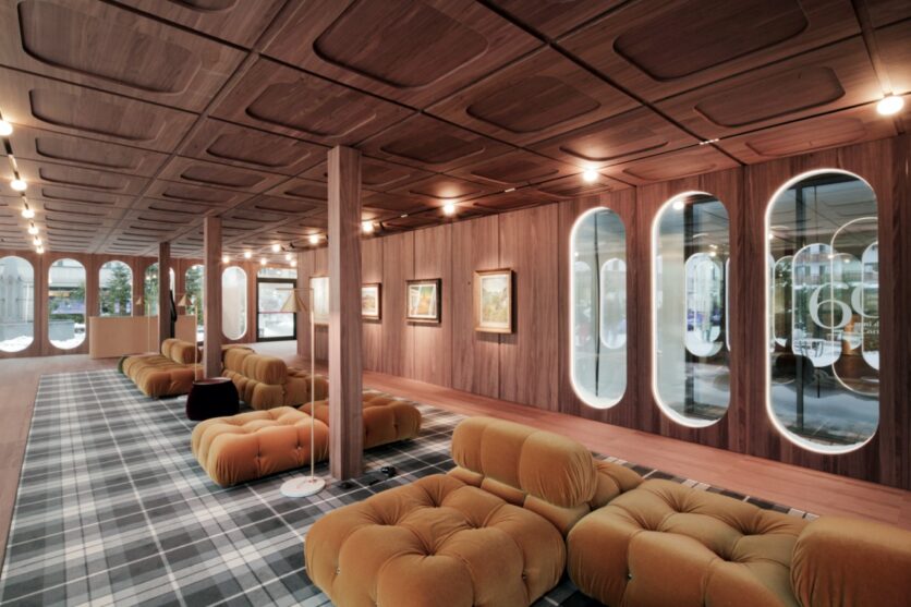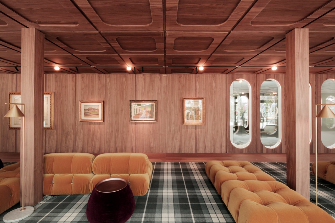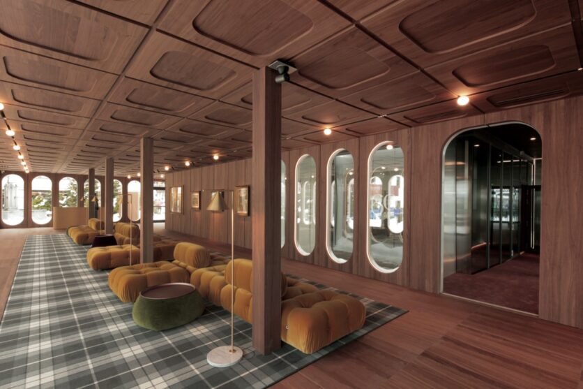 Tre palestre vengono convertite in lounge, il bar-caffetteria è trasformato in ristorante e una nuova struttura temporanea si innesta sulla terrazza esterna per accogliere uno spazio aperiski aperto al pubblico e un secondo ristorante. Il sistema di pannelli in alluminio e oblò – qui reinterpretati come vetrine – ospita scrigni espositivi, banconi accrediti e guardaroba, mentre una moquette in filato riciclato si sovrappone alle superfici esistenti per delimitare le aree temporanee, marcando la presenza dell’evento senza alterare permanentemente l’architettura.