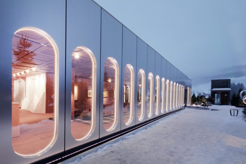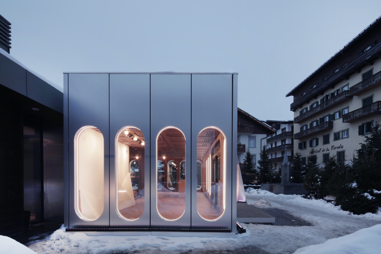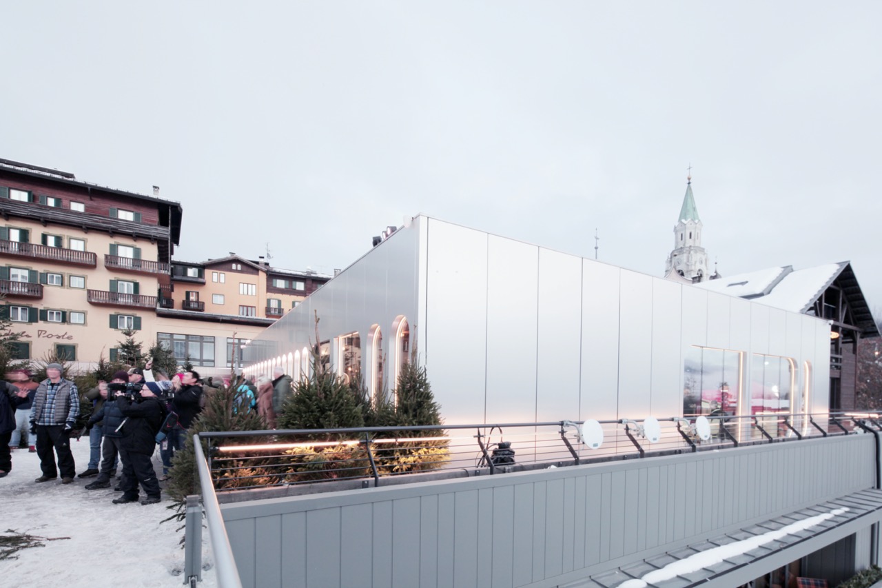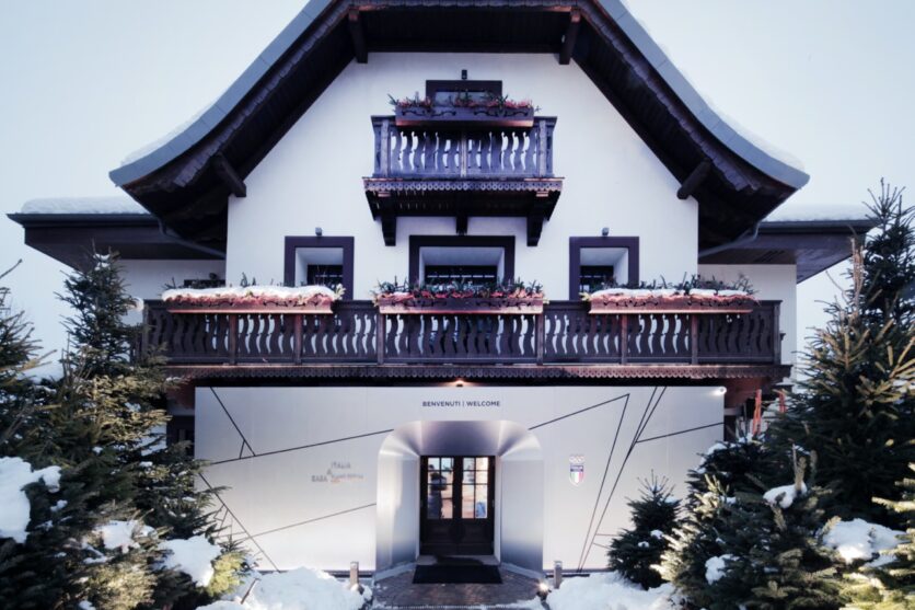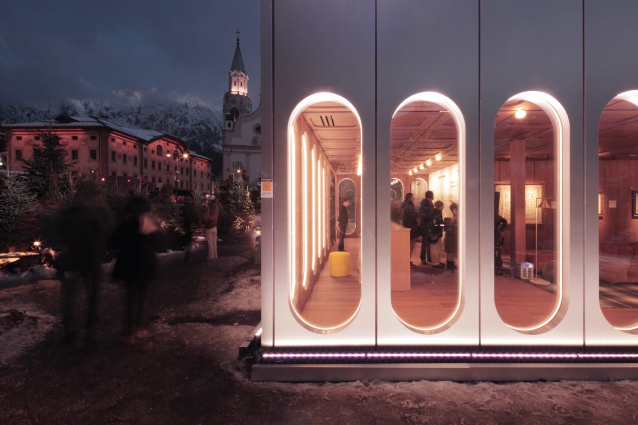 A Cortina, Casa Italia trova sede presso Farsettiarte, edificio nato dalla riconversione della stazione di partenza della storica funivia Belvedere–Pocol. Qui l’intervento si misura con un contesto stratificato, urbano e paesaggistico insieme, affacciato sul municipio storico e sulla Basilica dei Santi Filippo e Giacomo, ma soprattutto sulle Tofane.