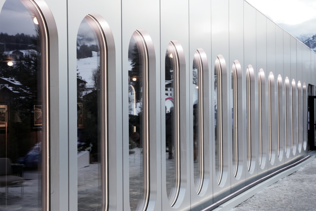 A Livigno, l’allestimento si inserisce nel Centro di Preparazione Olimpica Aquagranda, intervenendo su un organismo architettonico complesso. Il portale d’ingresso sovrappone alla varietà stilistica e volumetrica dell’esistente la chiarezza di un sistema modulare in pannelli prefabbricati di alluminio, affiancato da una parete a zig-zag che definisce l’accoglienza.