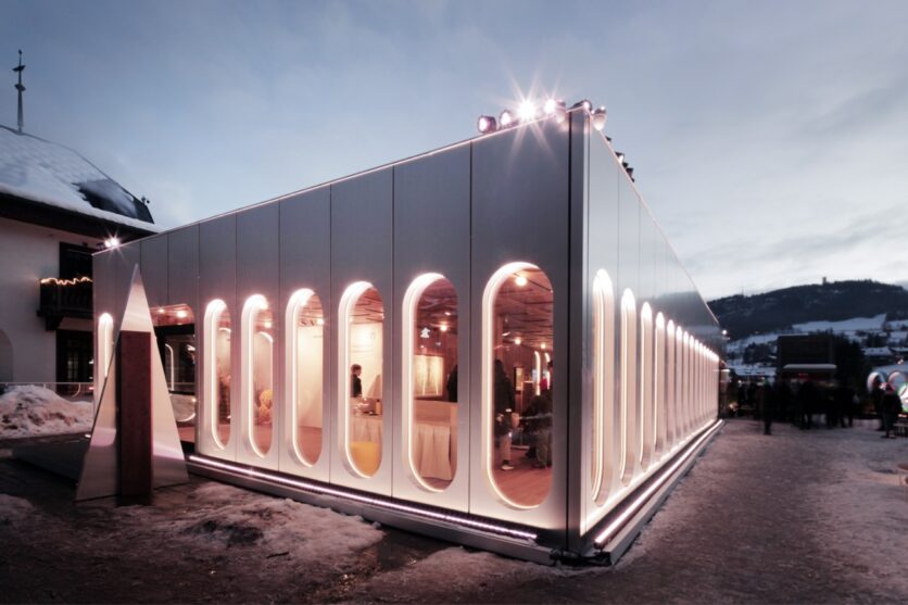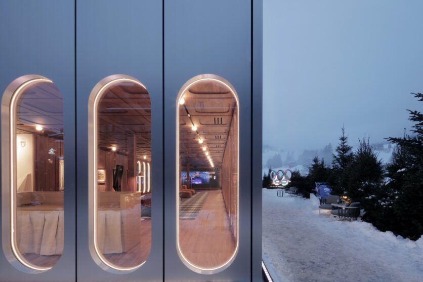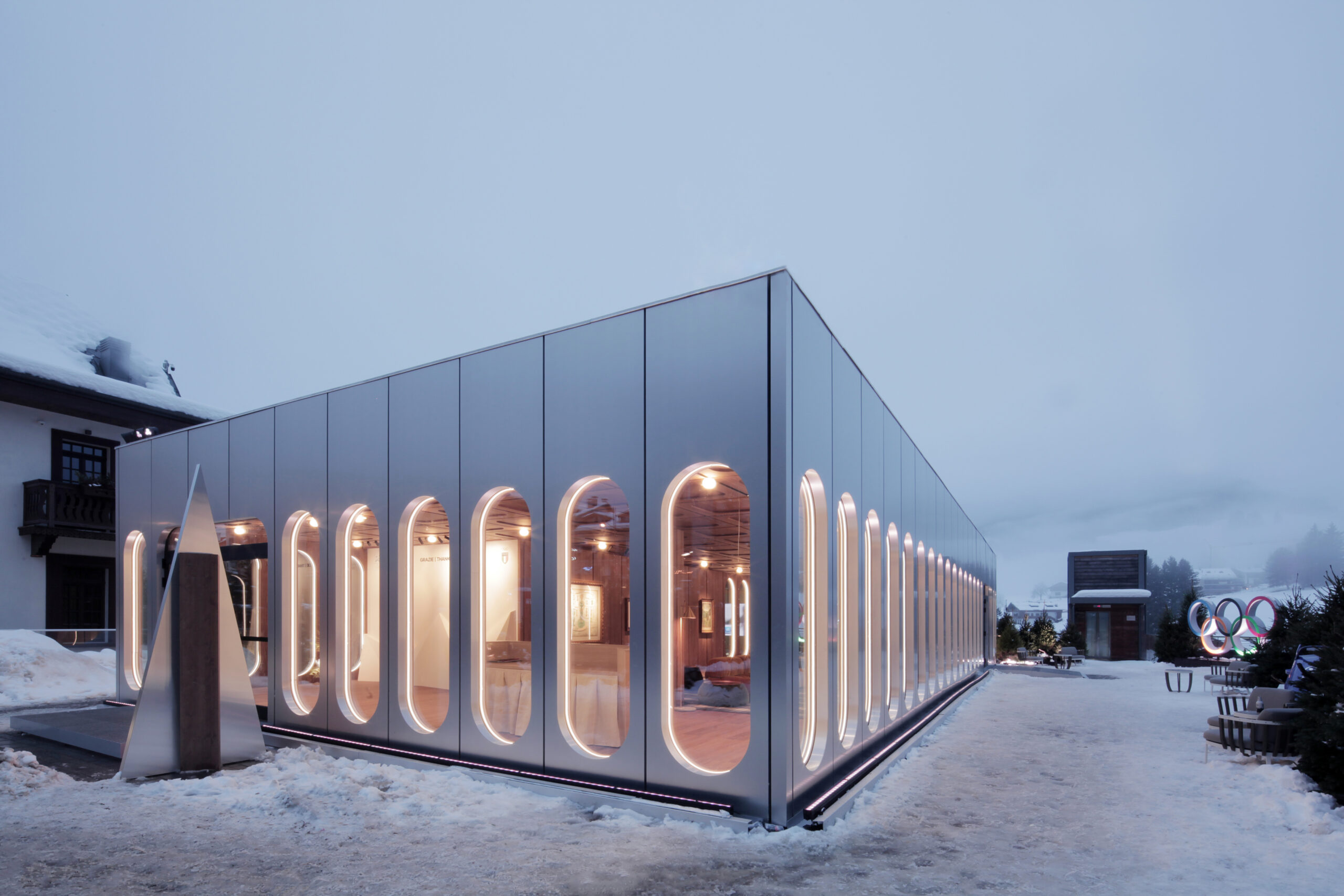 La scelta di elementi modulari prefabbricati, montati a secco, risponde a criteri di sostenibilità e ottimizzazione, ma introduce anche una prospettiva di riuso: il padiglione è concepito per essere smontato e rimontato, trasformando l’effimero olimpico in infrastruttura durevole. All’esterno, l’alluminio spazzolato riflette il paesaggio innevato e smaterializza il volume; all’interno, il rivestimento in noce dalle sfumature rossastre costruisce una dimensione raccolta e quasi domestica. La relazione visiva tra lounge e piazza, garantita dalle ampie vetrate, permette la condivisione pubblica del momento celebrativo, dissolvendo il confine tra spazio riservato e spazio collettivo.