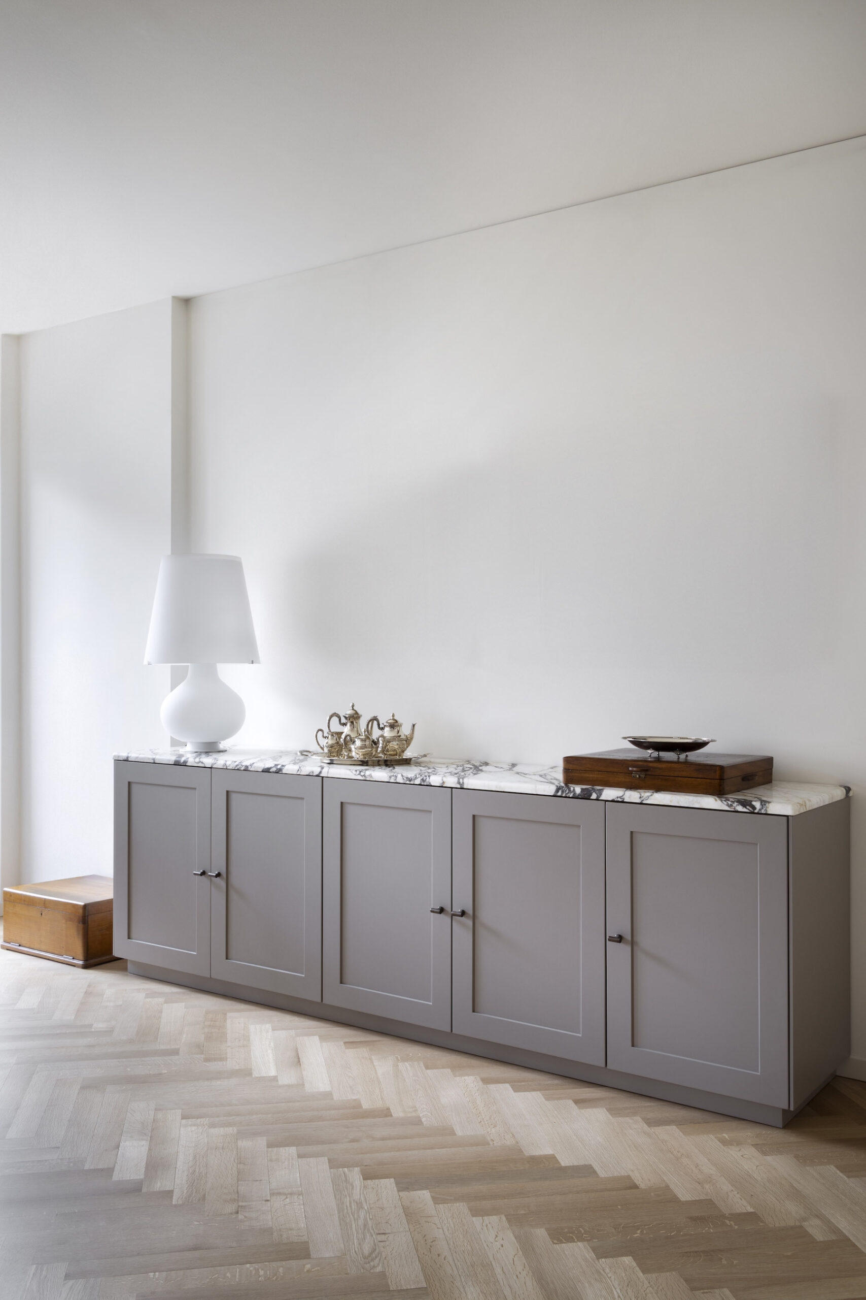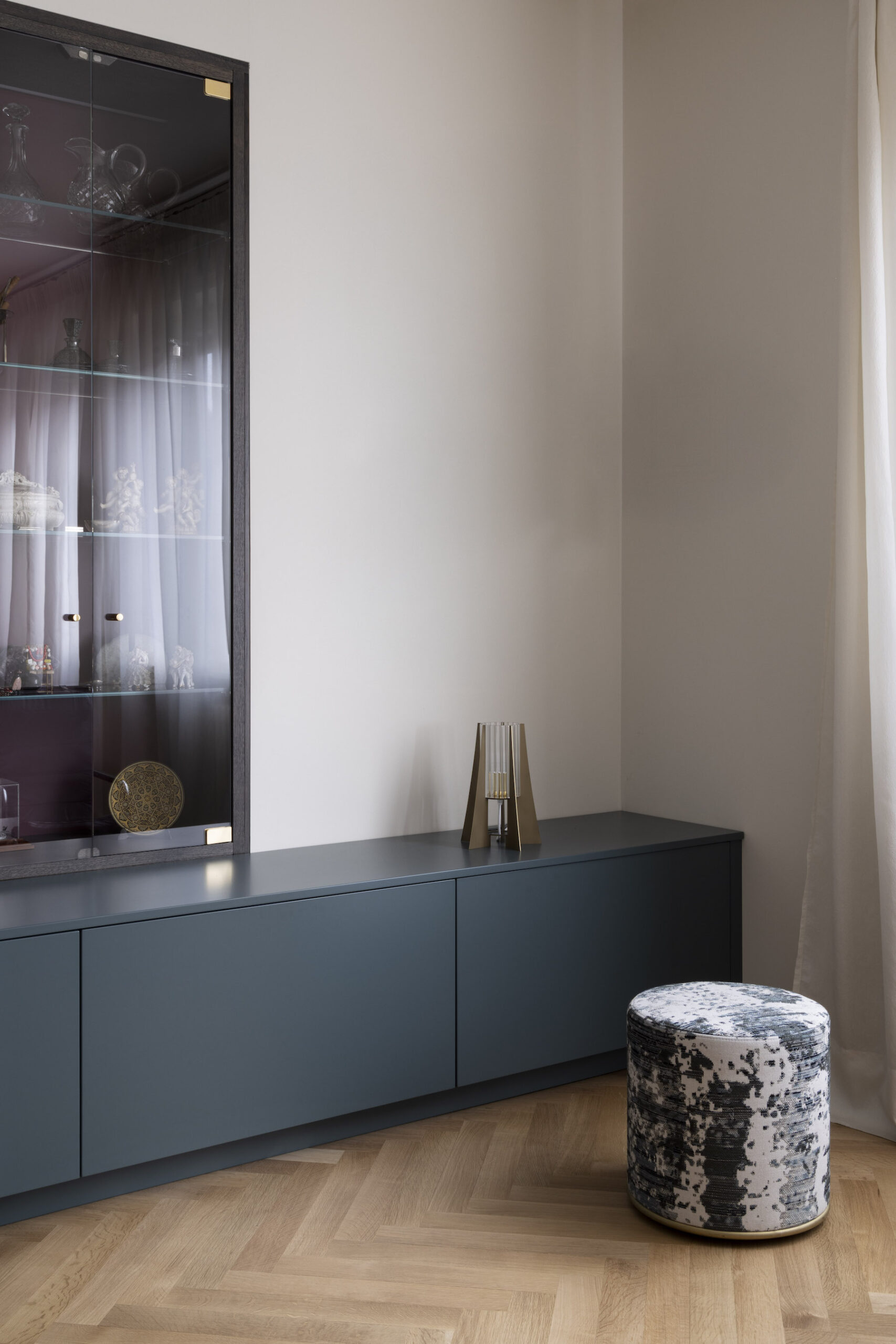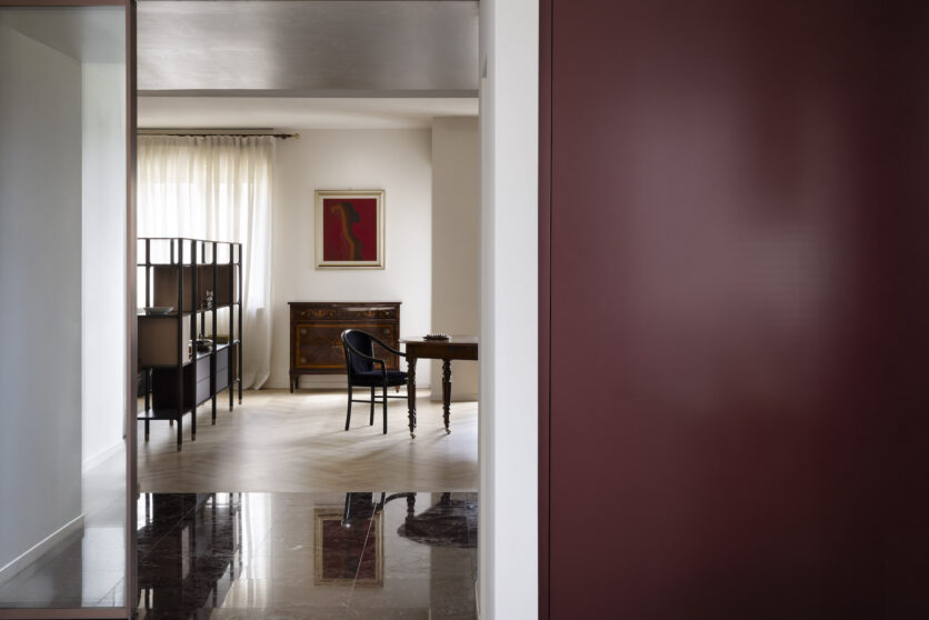 Uno degli aspetti centrali del progetto riguarda il recupero e la reinterpretazione di arredi esistenti. Diversi pezzi antichi sono stati restaurati e ripensati attraverso nuove cromie e dettagli contemporanei, contribuendo a costruire un ambiente domestico in cui passato e presente convivono insieme con grande eleganza. Questo approccio, che lo studio definisce reclaim, consente di valorizzare la memoria degli oggetti e allo stesso tempo di inserirli in una narrazione abitativa aggiornata, sostenibile e personale.