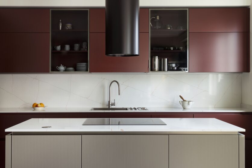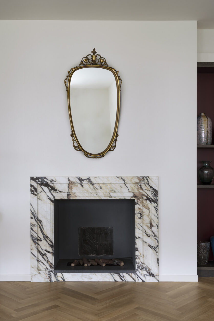 Una volta definito l’impianto planimetrico, il progetto si sviluppa come un lavoro di raffinamento progressivo che coinvolge materiali, finiture e arredi. Studio Cava accompagna la committenza in tutte le scelte progettuali, fino alla progettazione di numerosi elementi su misura integrati nell’architettura. Tra questi spicca il camino rivestito in marmo, elemento scultoreo che diventa fulcro visivo della zona giorno e sintetizza l’approccio dello studio, capace di combinare eleganza materica e precisione compositiva.