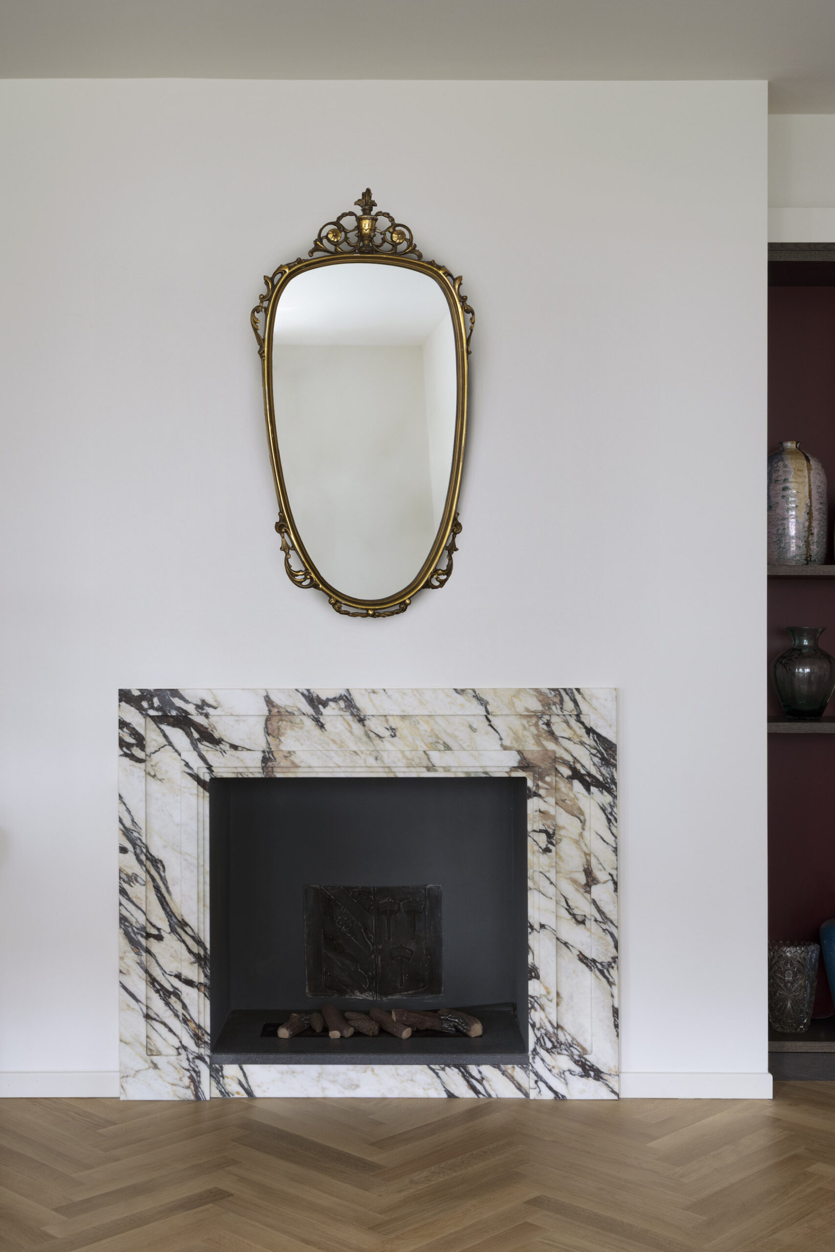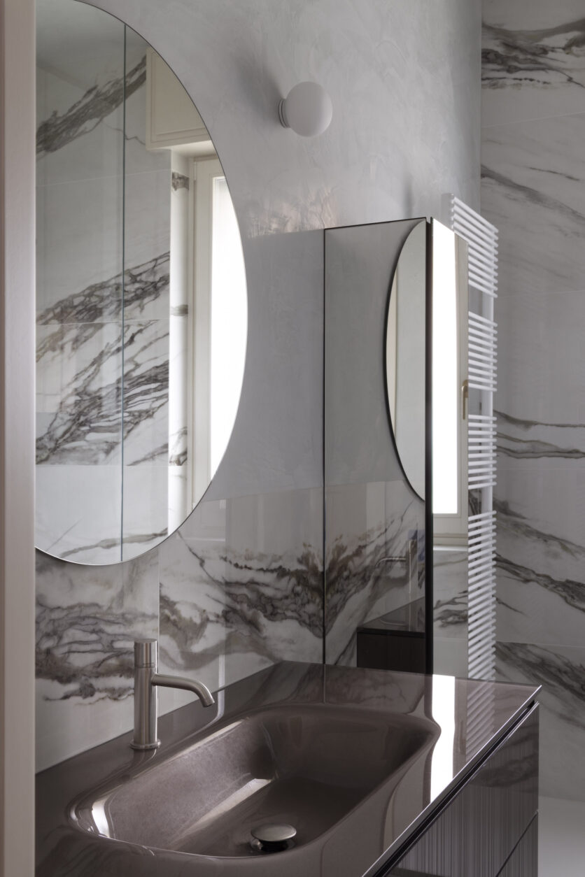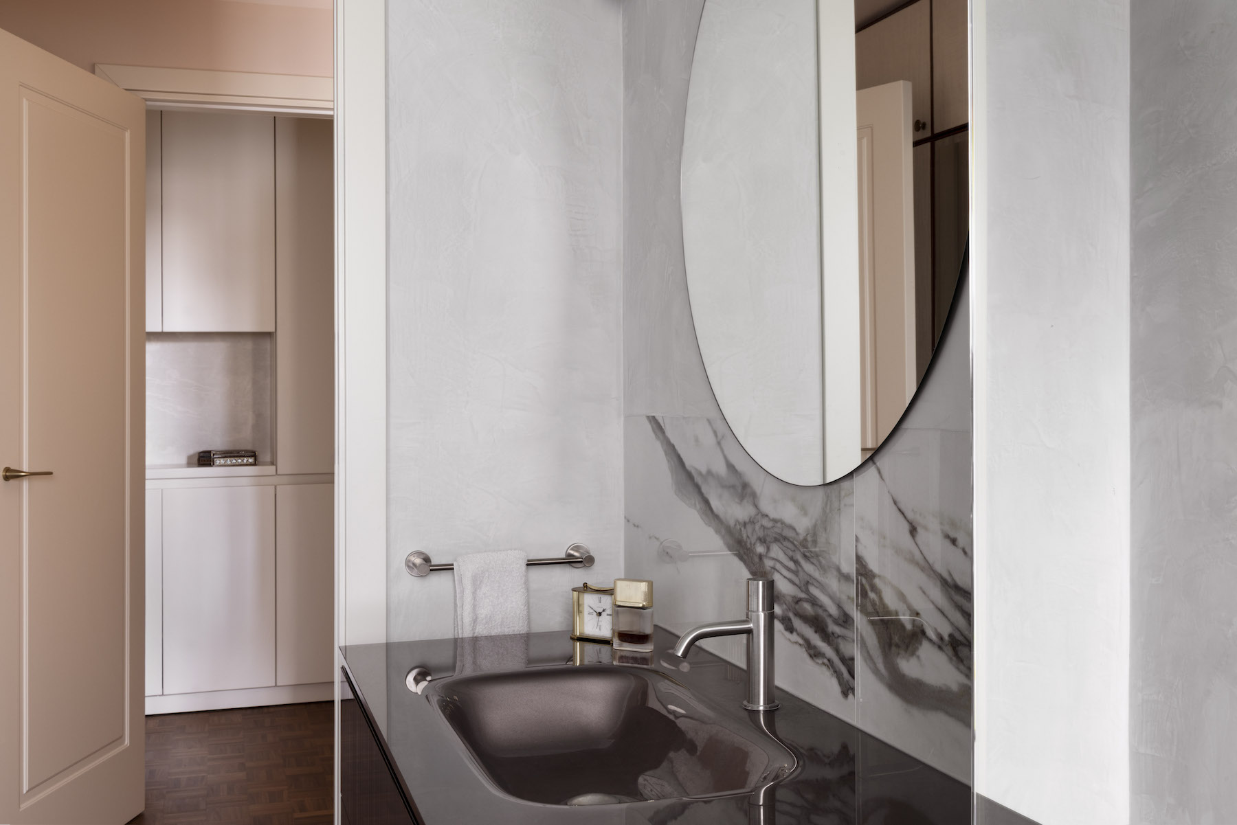 L’ingresso introduce immediatamente il carattere dell’abitazione attraverso un dialogo tra materiali preziosi e citazioni decorative. Il marmo e la carta da parati definiscono uno spazio di forte identità visiva che riflette il gusto raffinato dei proprietari, integrandosi con naturalezza nel contesto architettonico d’epoca dell’edificio.