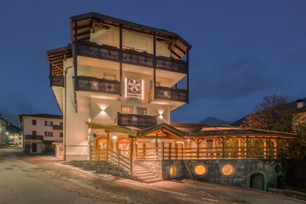 L’esterno dell’edificio appare completamente in mattoni, compreso il tetto, rivestito con listelli di larice. Anche le finestre sono in larice e non presentano cornice.