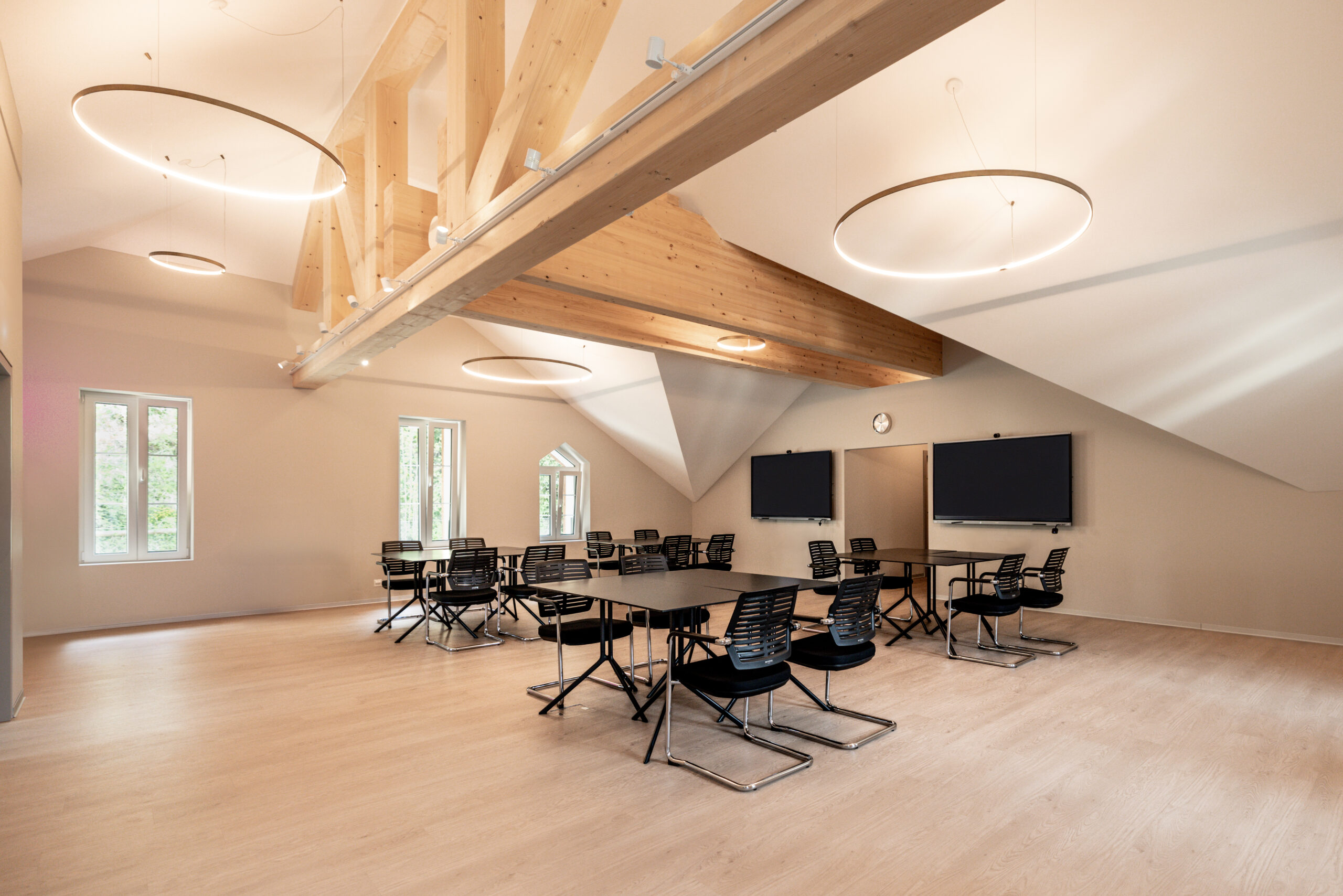 La luce naturale gioca un ruolo centrale nell’impianto architettonico: ampie vetrate incorniciano la vista sul lago e favoriscono il benessere psicofisico, rafforzando il legame con il paesaggio circostante. Al calare della sera, l’illuminazione si fa più morbida e avvolgente, grazie a un equilibrio tra luci diffuse e faretti regolabili. Particolare attenzione è stata inoltre dedicata al comfort acustico, ottenuto tramite sistemi di isolamento tra le stanze e l’impiego di porte scorrevoli, per garantire quiete e riposo.