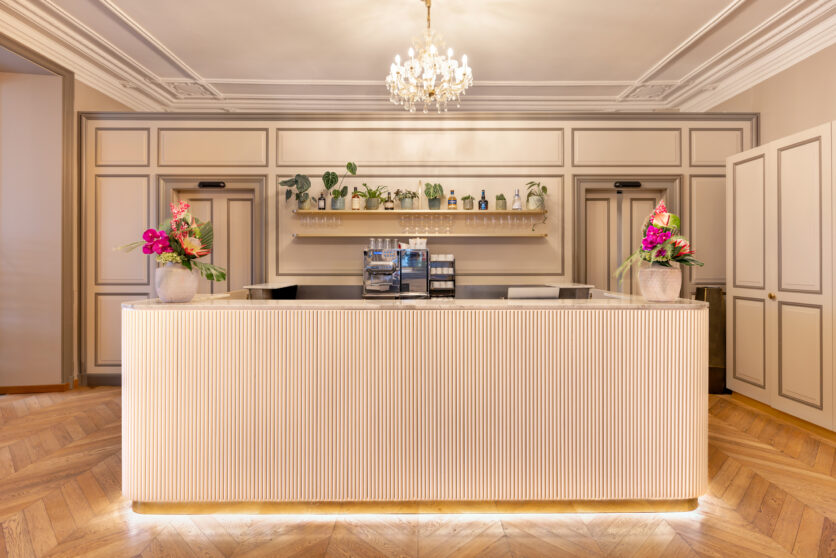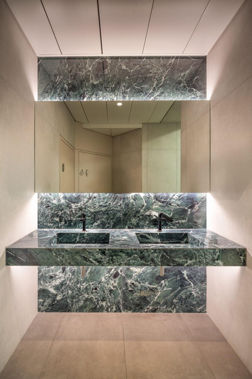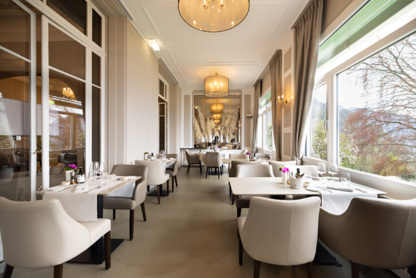 Il progetto ha coinvolto anche gli spazi comuni e le aree di servizio. La cucina, completamente ripensata su due livelli, è stata trasformata in un centro di formazione per gli chef del Gruppo Swiss Medical Network, migliorando al contempo l’organizzazione dei flussi operativi. Il ristorante si caratterizza per una boiserie contemporanea con intarsi verticali e un elegante bancone in marmo bianco, dando vita a un ambiente raccolto che dialoga con il paesaggio lacustre.