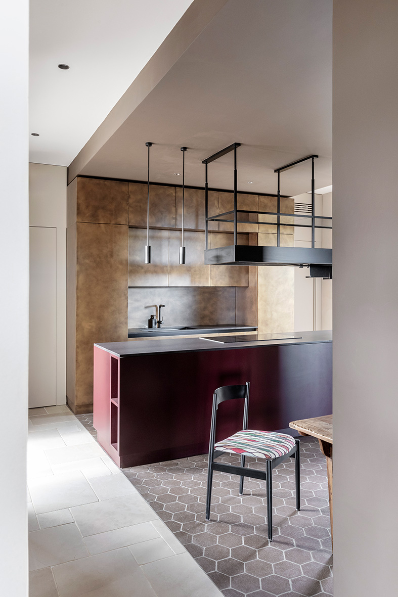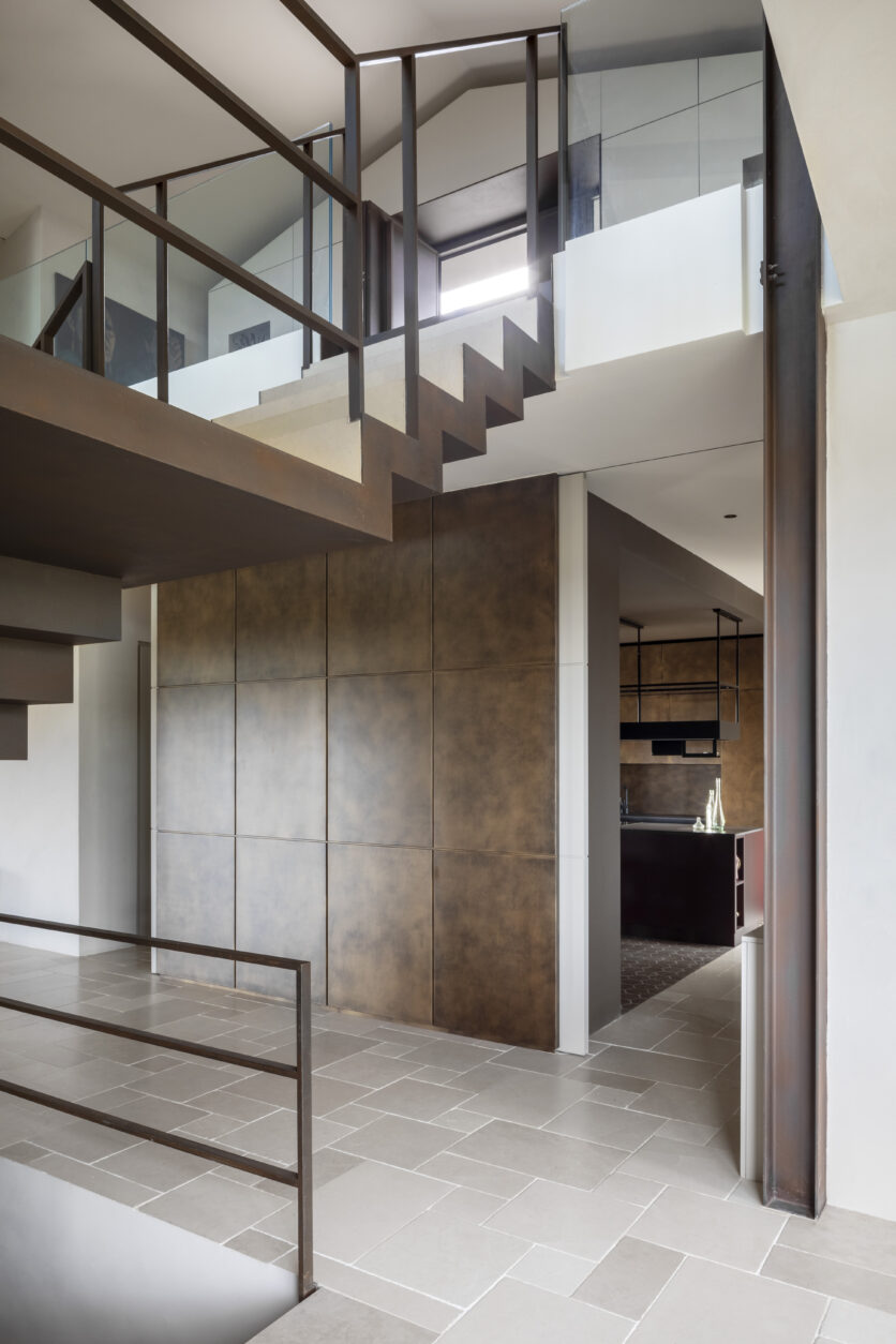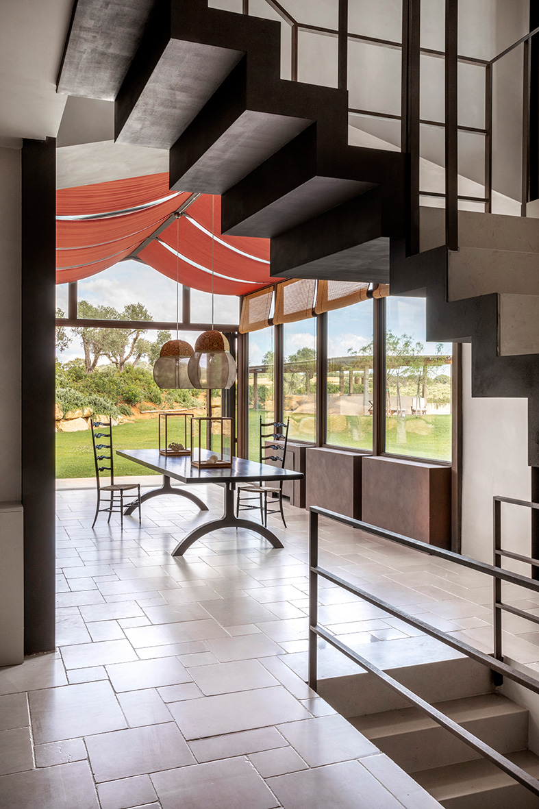Elemento cardine della distribuzione è la scala scultorea, fulcro connettivo che, grazie al rivestimento in pietra continua col pavimento, guida con naturalezza il passaggio tra i piani. Al livello inferiore, la grande cucina è occultata da una parete lignea a effetto bronzo per preservare ampiezza e linearità dello spazio giorno; la sala da pranzo occupa la serra apribile su un lato, ottenendo una continuità fisica tra interno ed esterno che asseconda l’uso stagionale della casa.