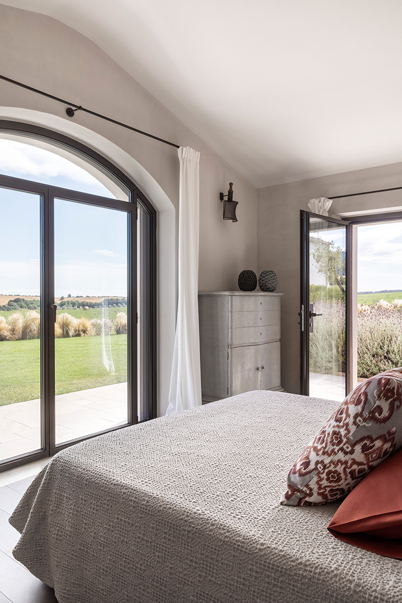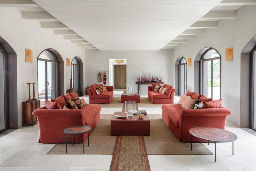 Il living al piano terra si affaccia su due salotti speculari, incorniciati da grandi archi che modulano la luce lungo l’arco della giornata. All’esterno, un portico attraversa due “anime”: verso mare, un pergolato per la stagione estiva; in controcampo, un patio in pietra organizzato attorno a un olivo secolare, rifugio raccolto nelle stagioni più fresche. Il giardino integra una piscina in pietra e una struttura open-air attrezzata con cucina, rafforzando il carattere di abitazione diffusa e modulabile. Cinque camere con bagno privato, distribuite sui due livelli, completano il programma residenziale.