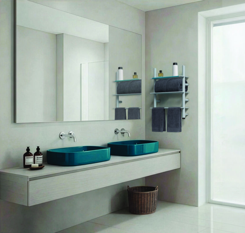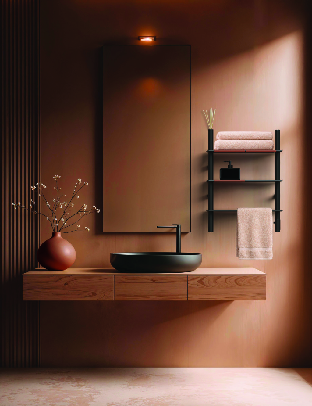 Alongside Stick, Deltacalor presents Koala, an electric towel warmer that revolutionises the concept of functionality thanks to a compact design and a multifunctional approach. Designed to optimise every inch of the bathroom, Koala integrates drying, heating, aromatherapy and storage surfaces into a single product.