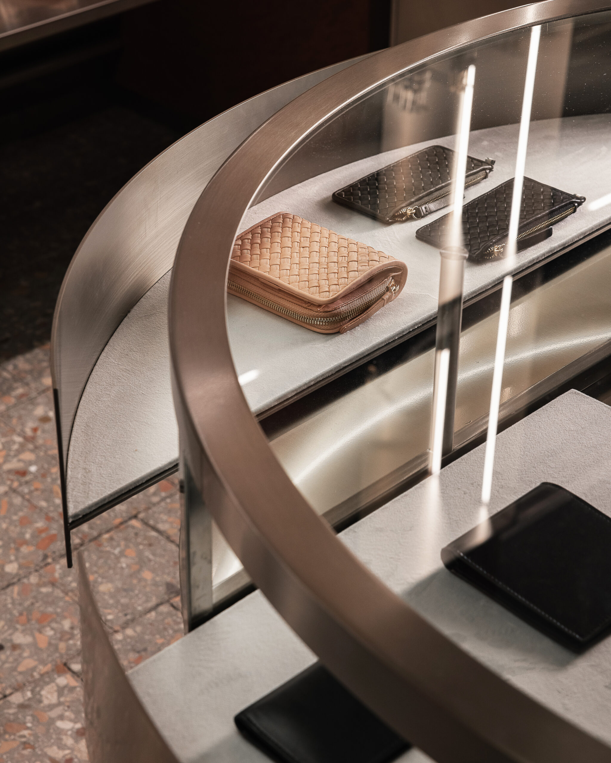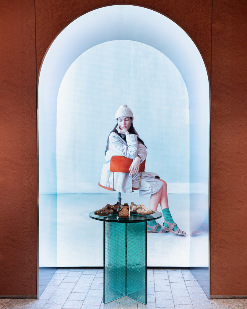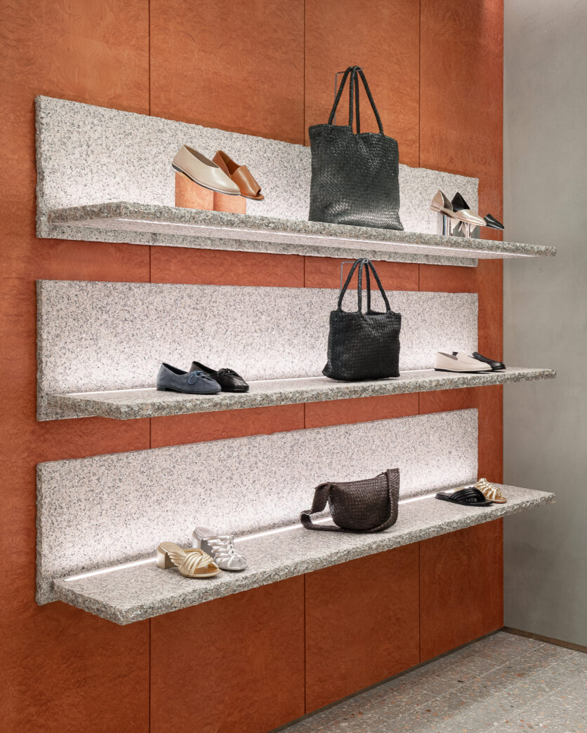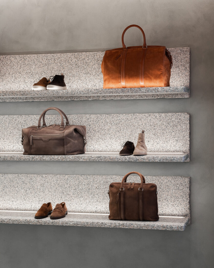 La vetrina si smaterializza in continuità con l’interno, trasformandosi in uno spazio espositivo visibile anche dall’esterno. Pensata come piattaforma temporanea e mutevole, accoglie installazioni e progetti sviluppati in dialogo con giovani artisti, mettendo al centro il lavoro manuale e i materiali identitari del marchio, primo fra tutti la pelle.