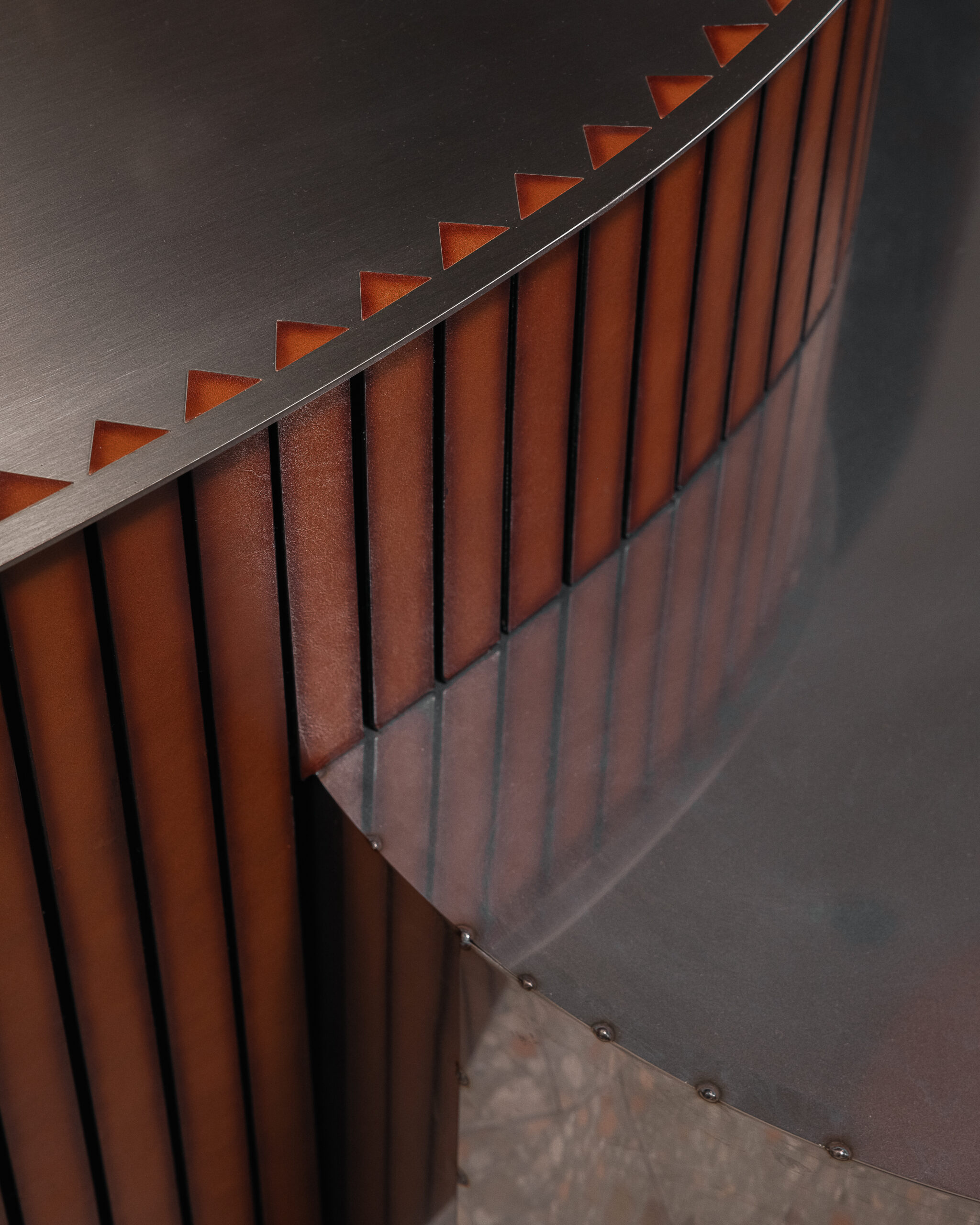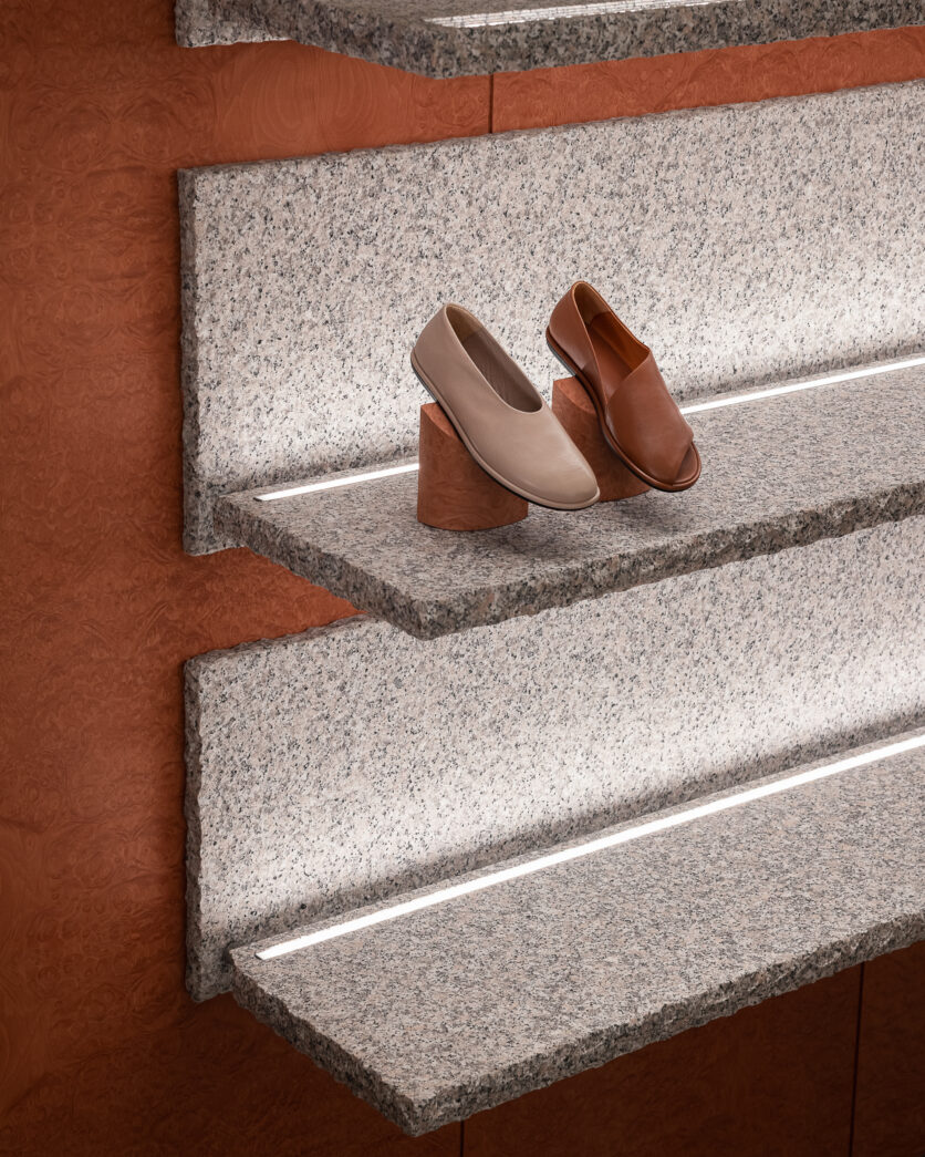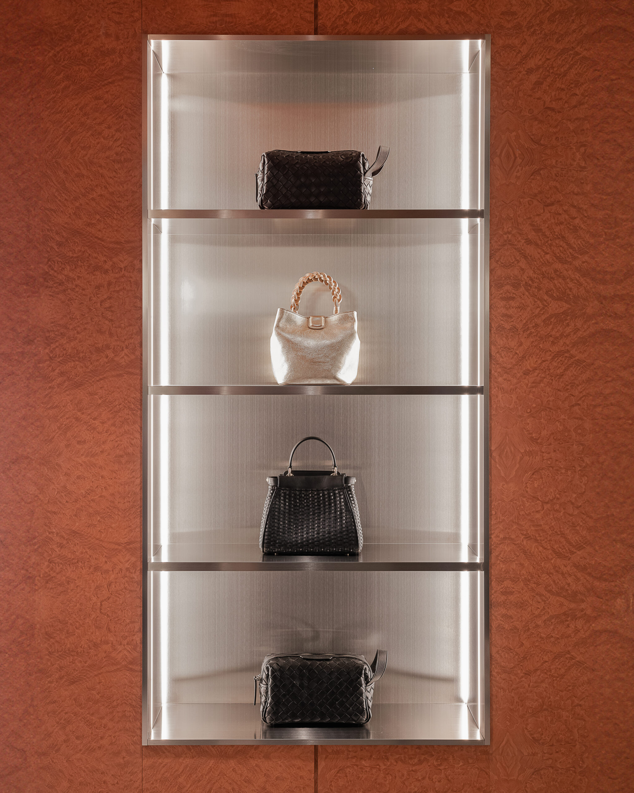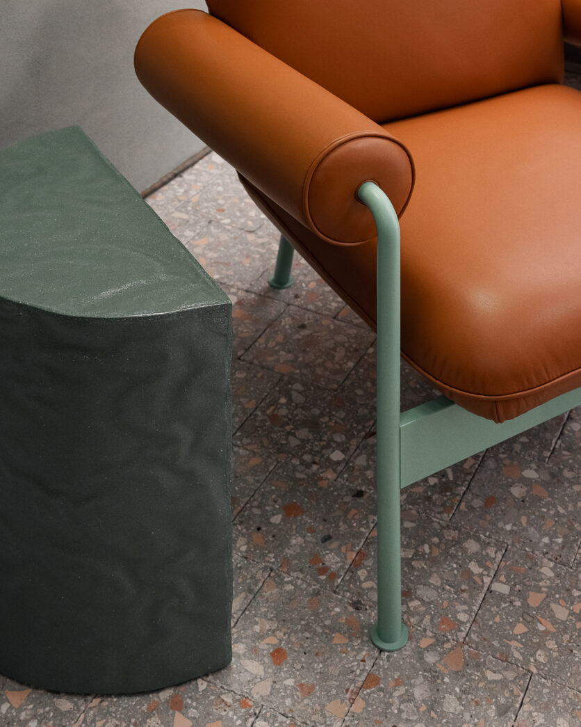 La vetrina si smaterializza in continuità con l’interno, trasformandosi in uno spazio espositivo visibile anche dall’esterno. Pensata come piattaforma temporanea e mutevole, accoglie installazioni e progetti sviluppati in dialogo con giovani artisti, mettendo al centro il lavoro manuale e i materiali identitari del marchio, primo fra tutti la pelle.