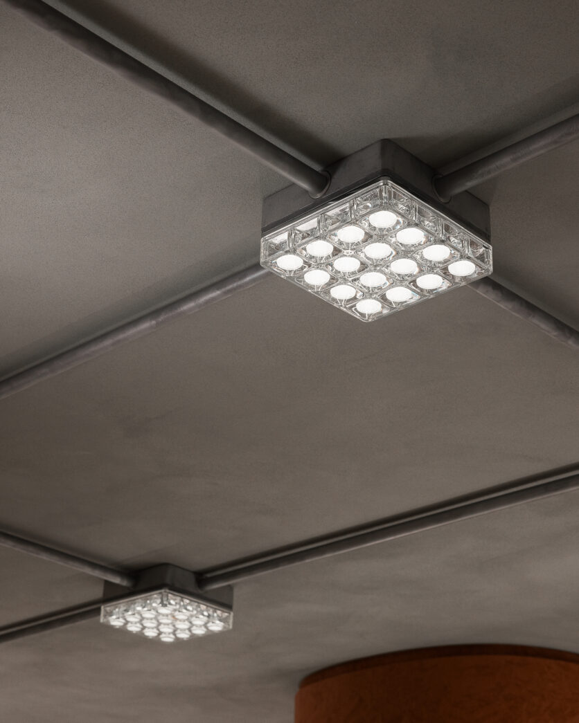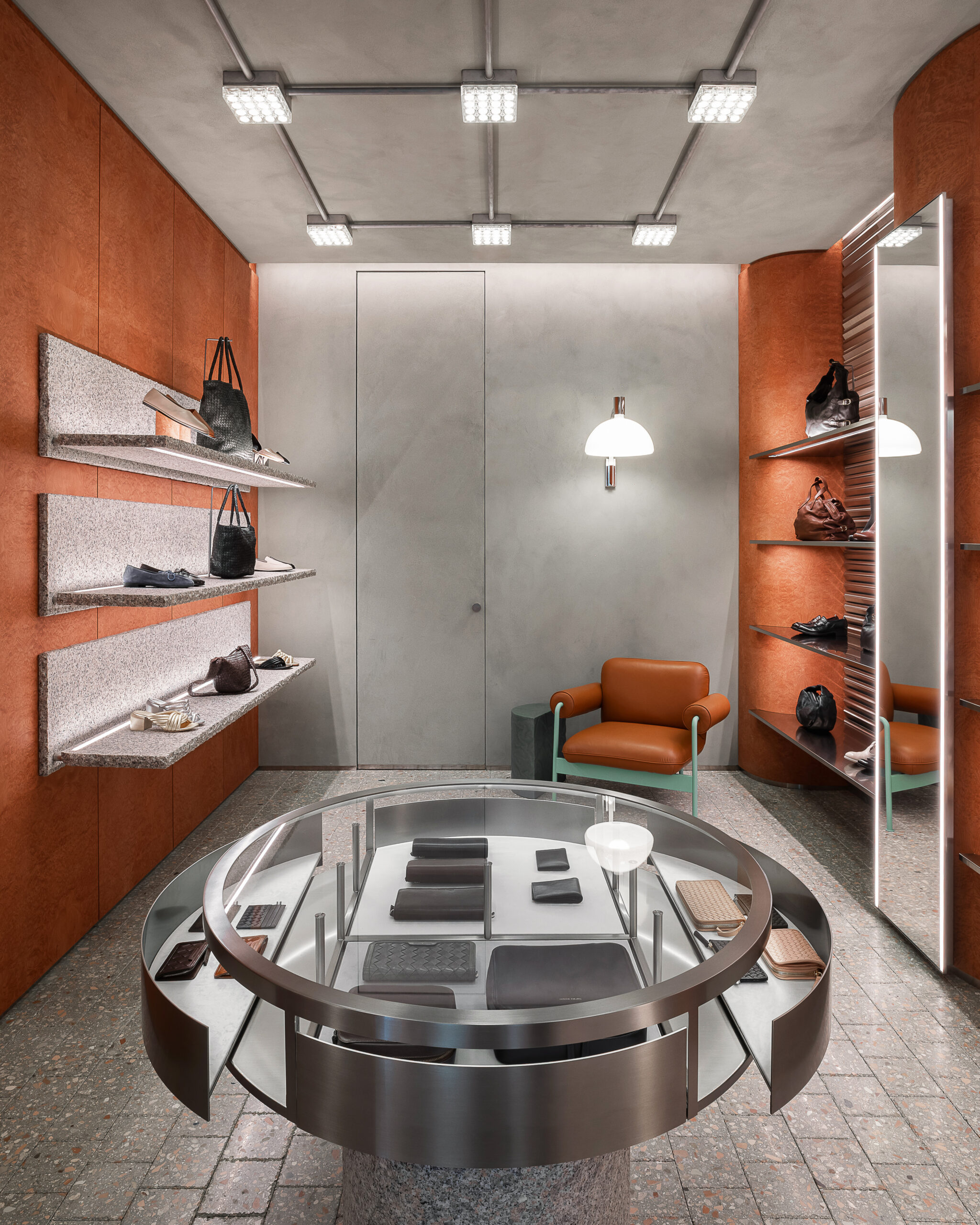 Gli arredi espositivi, volutamente semilavorati, integrano dettagli artigianali come vetri pressofusi con reti metalliche, mensole in granito grezzo e tavolini in cemento alleggerito, rafforzando l’identità di una “officina” sofisticata, in equilibrio tra sperimentazione e controllo formale.