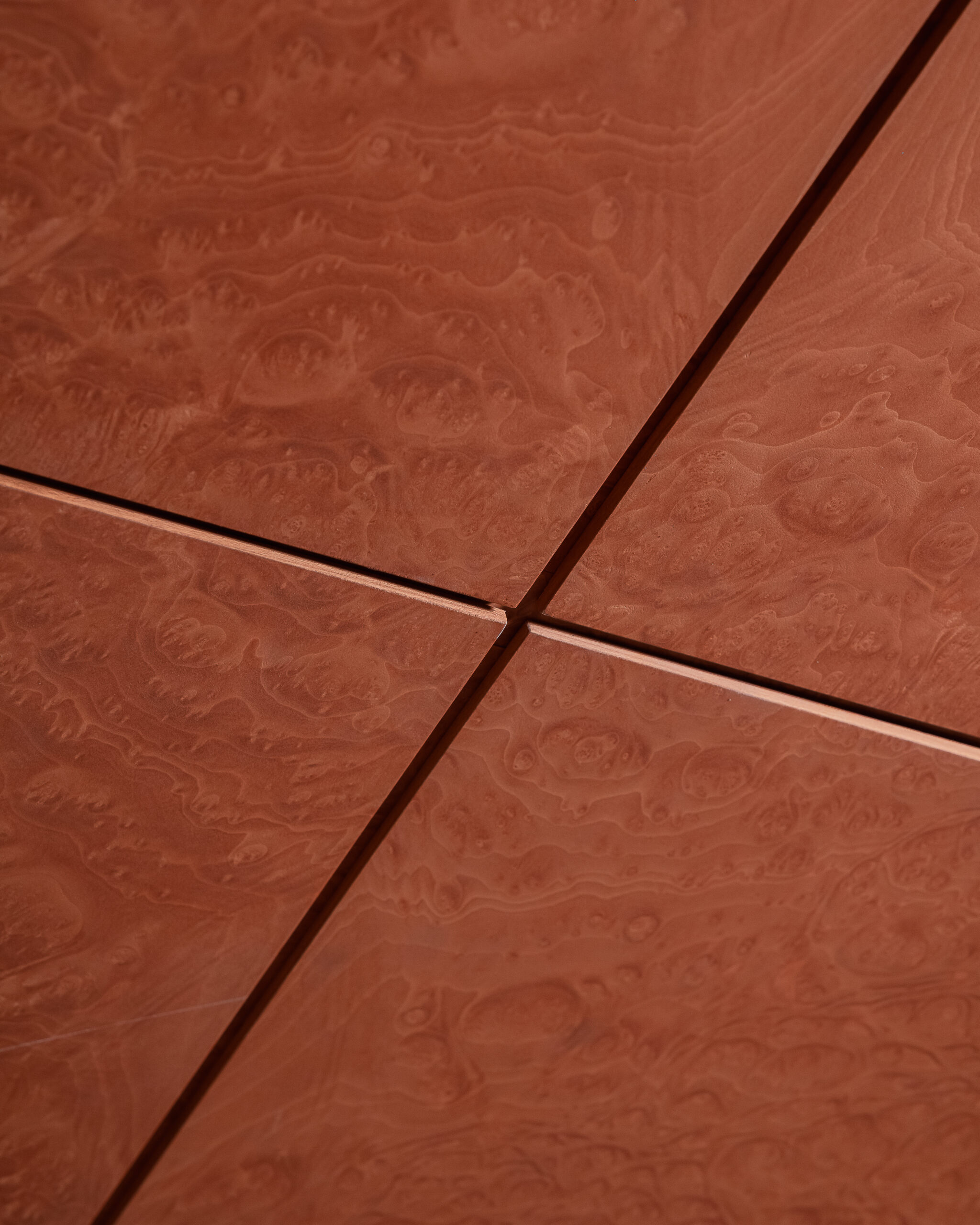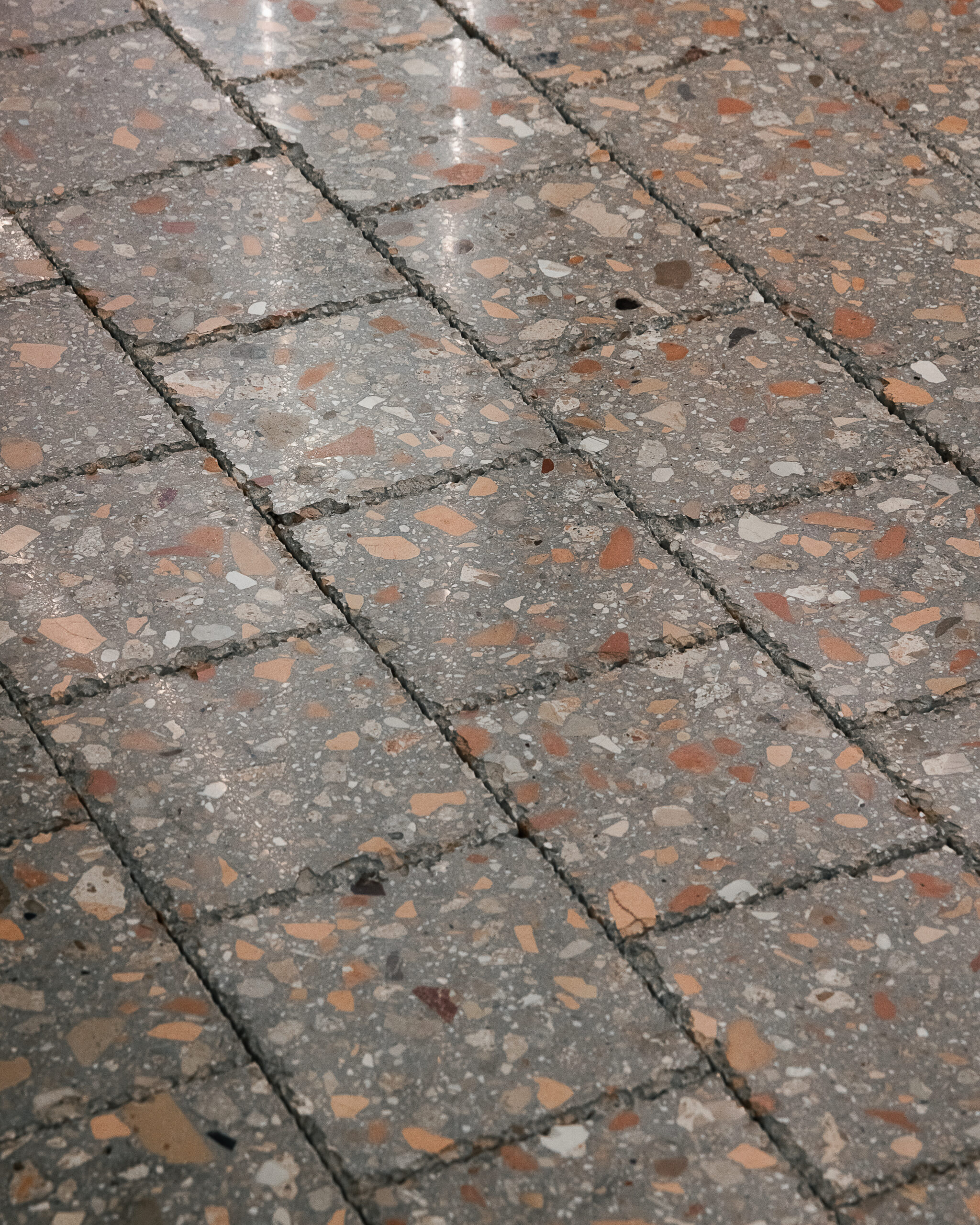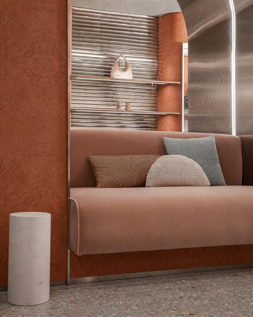 Grande attenzione è riservata alla materia, intesa non solo come finitura ma come portatrice di memoria. Il pavimento in marmette 15×15 cm, ispirato agli anni Sessanta, è realizzato con materiali di recupero provenienti dalle macerie del sisma che ha colpito le Marche nel 2016, stabilendo un legame diretto con le origini geografiche ed emotive del brand. Radica opaca, alluminio grezzo spazzolato e calce naturale grigio-verde compongono una palette coerente e misurata.