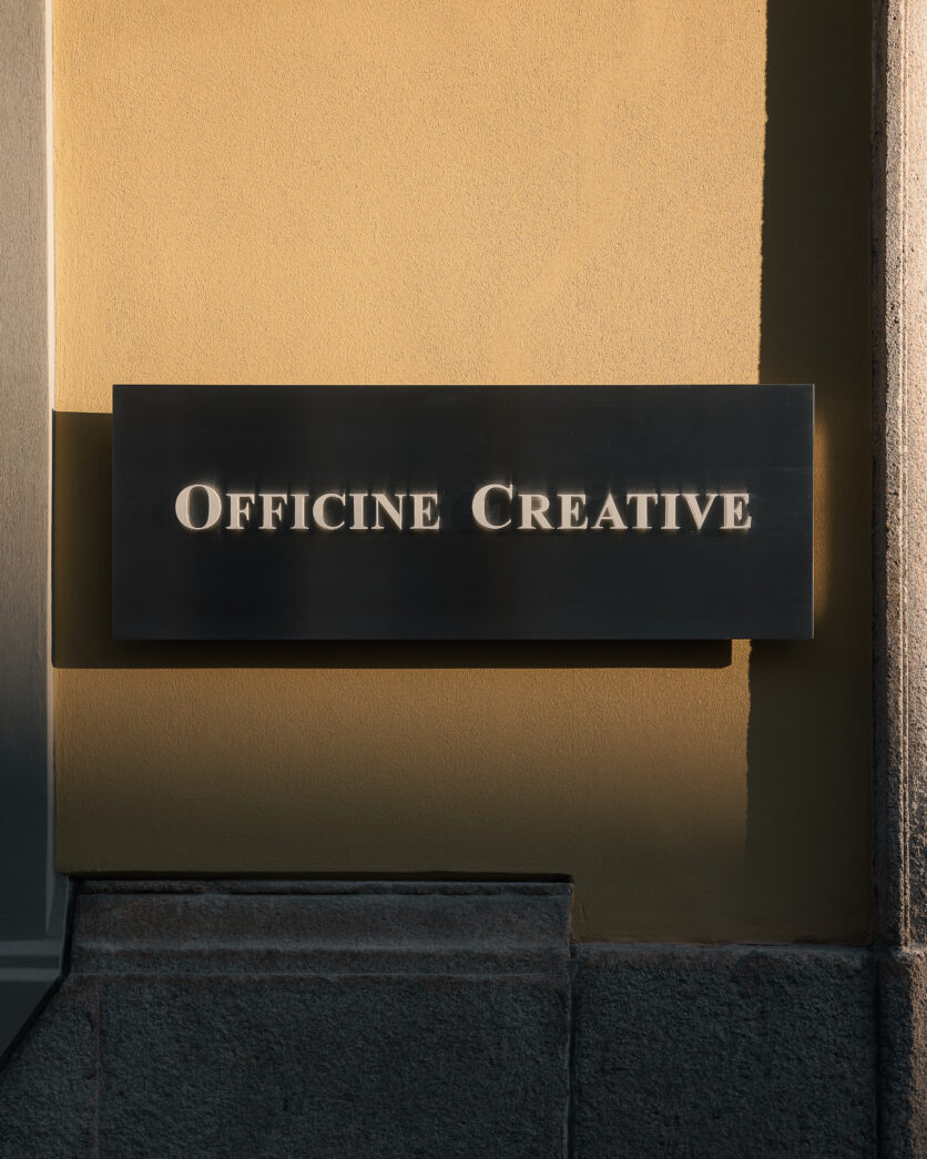 Elemento centrale del progetto è la reinterpretazione delle persiane milanesi, trasformate in quinte scenografiche in acciaio zigrinato. Un gesto che rilegge la tradizione in chiave industriale e contemporanea, restituendo profondità e ritmo allo spazio interno. Il tema dell’arco ritorna come matrice compositiva, trovando un’eco anche nel logo di Officine Creative, dove la “O” iniziale diventa forma e struttura.