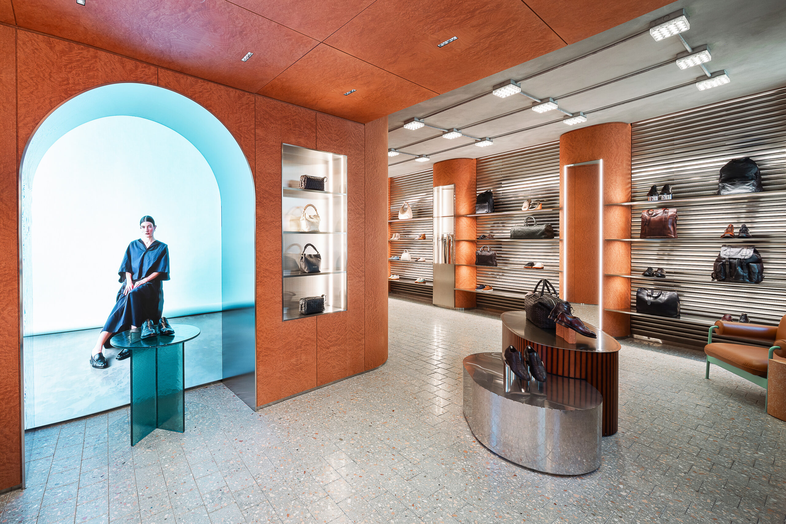 L’ingresso è segnato da un portale ad arco retroilluminato, un vero e proprio filtro percettivo che introduce il visitatore nell’universo del brand. Il ledwall integrato ospita contenuti video sviluppati in collaborazione con l’Art Director Scott Emerson, rafforzando la dimensione immersiva e narrativa del flagship.