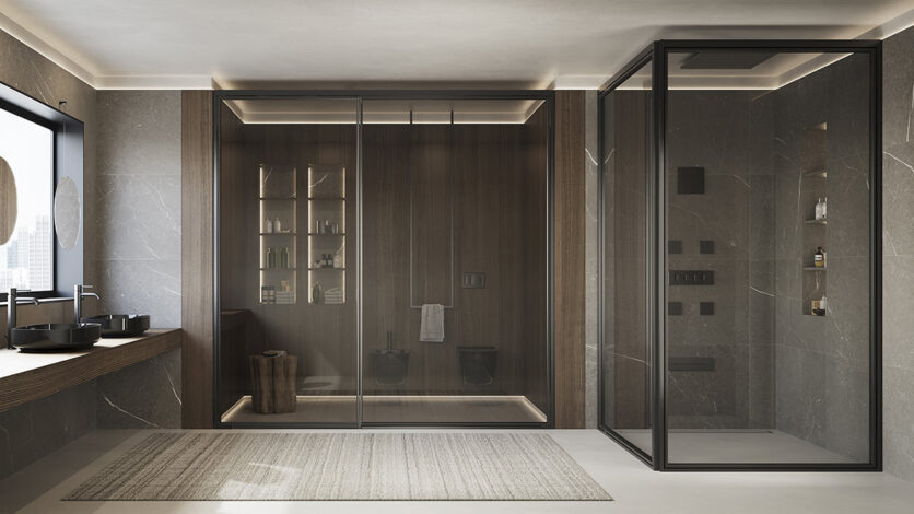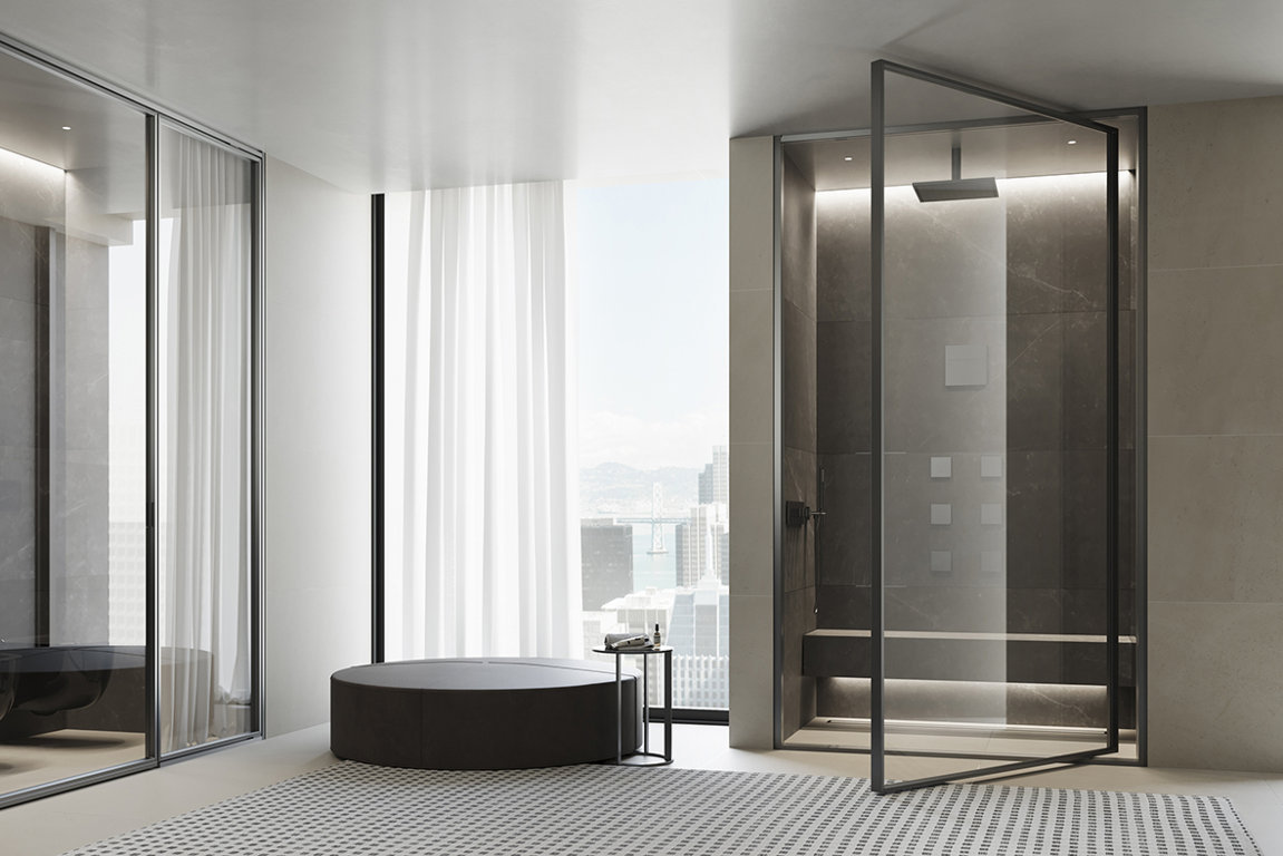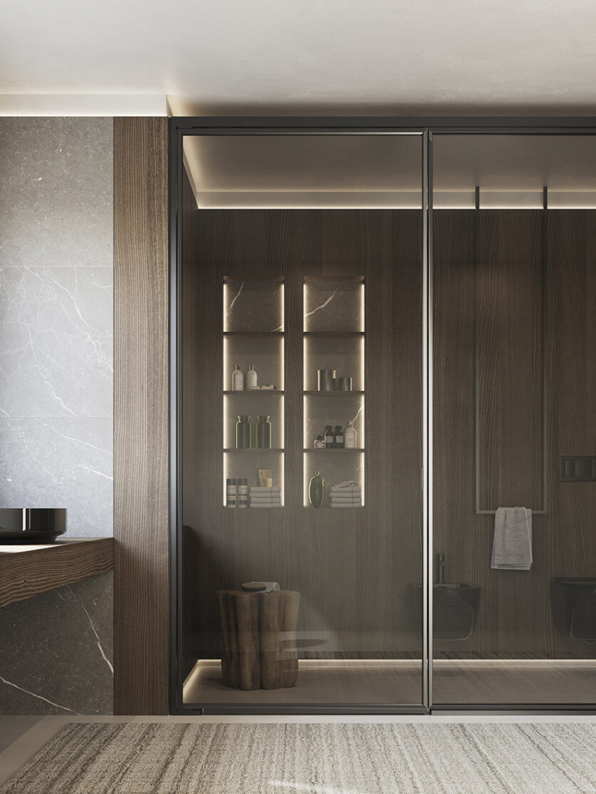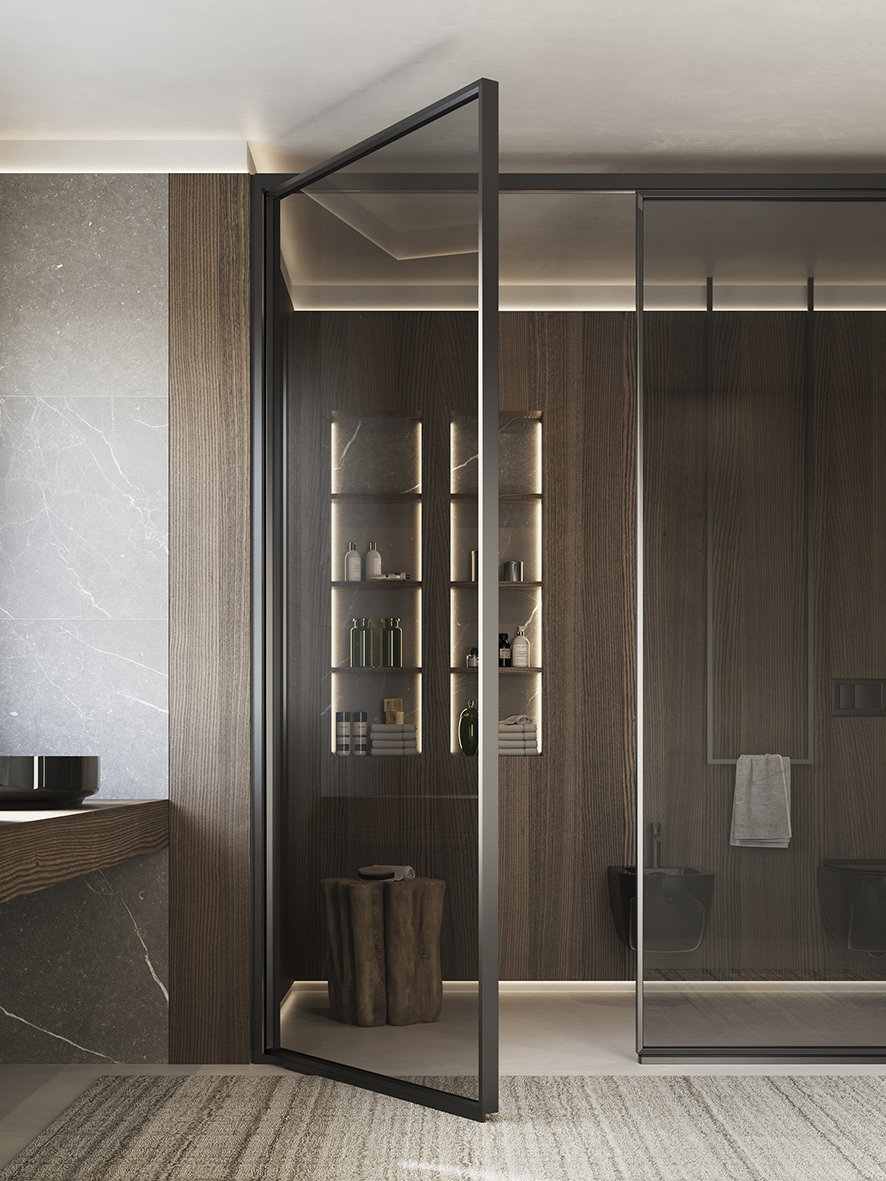 The evolution towards wall systems is a natural step for Vismaravetro. The company, historically a leader in the production of shower enclosures, has gained in-depth knowledge of glass, aluminium and opening and closing mechanisms over the years. This experience has given rise to the desire to go beyond the logic of the isolated technical product and offer solutions that not only delimit a space but also interpret and transform it. The needs of contemporary design — both residential and contract — require cross-cutting, integrated systems that can be adapted to bedrooms, wellness areas, suites and hybrid spaces. Domino responds to this demand with an approach that combines formal consistency, compositional freedom and rigorous execution.