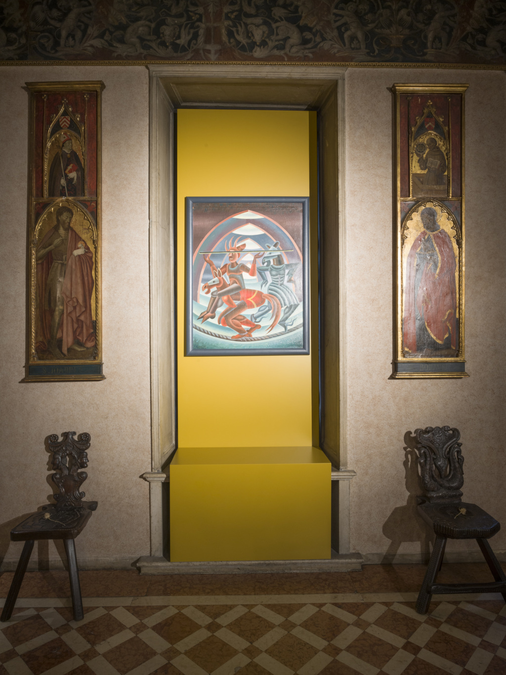 Nelle sale del Museo Bagatti Valsecchi, dove pannelli in legno intagliato e arredi rinascimentali un tempo mettevano in scena una fantasia colta del passato italiano, una presenza audace abita ora questa magnifica atmosfera. Con Depero Spazio a Spazio. La creazione della memoria, la casa museo milanese diventa teatro di un incontro sorprendente e magico tra Novecento e Ottocento, l’immaginazione irrequieta dell’artista futurista Fortunato Depero, il cui lavoro è in perpetuo equilibrio tra visioni arcaiche e progressiste, e i baroni Fausto e Giuseppe Bagatti Valsecchi, visionari e appassionati collezionisti di arte neorinascimentale.