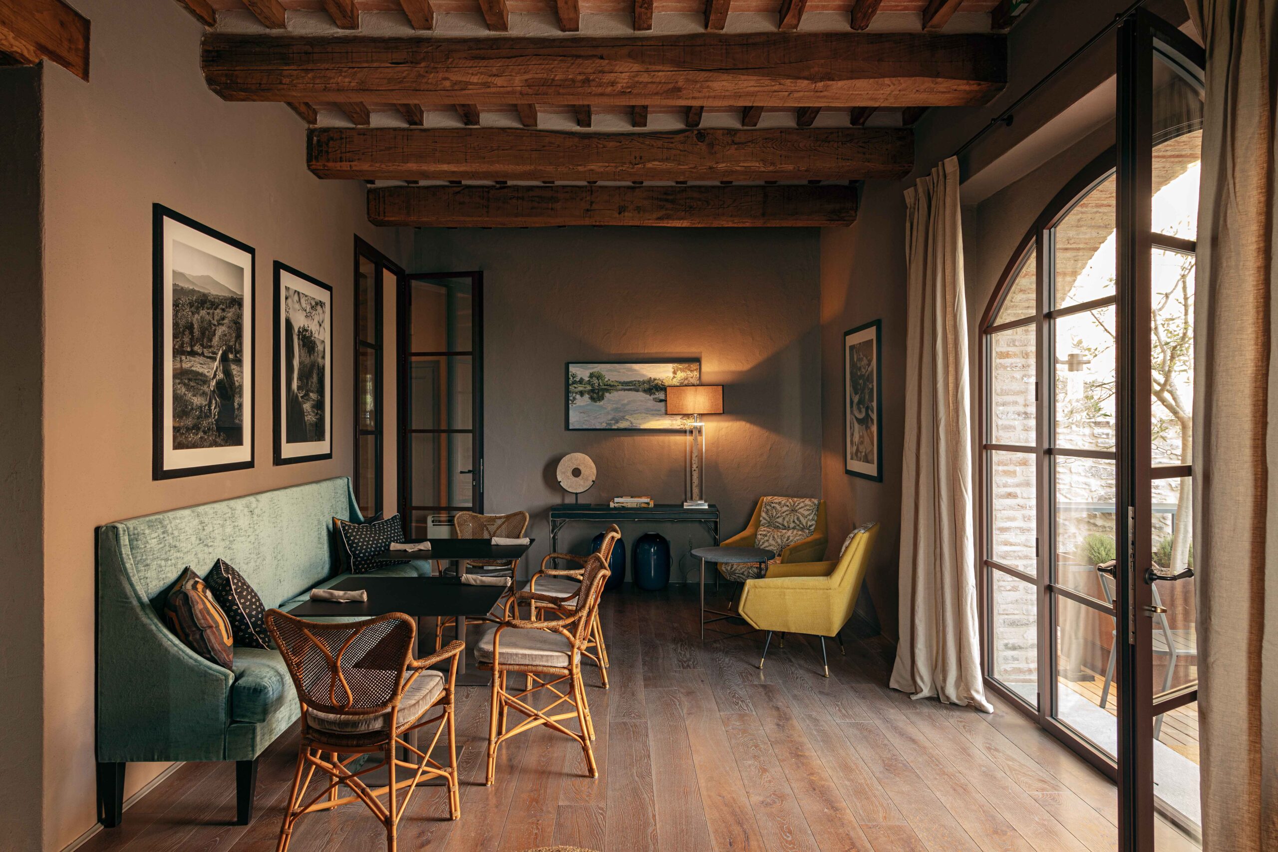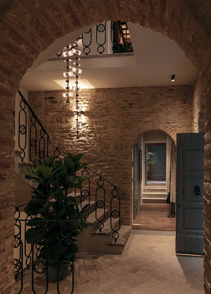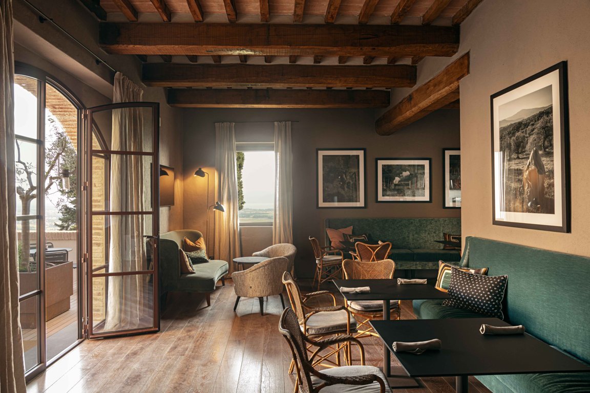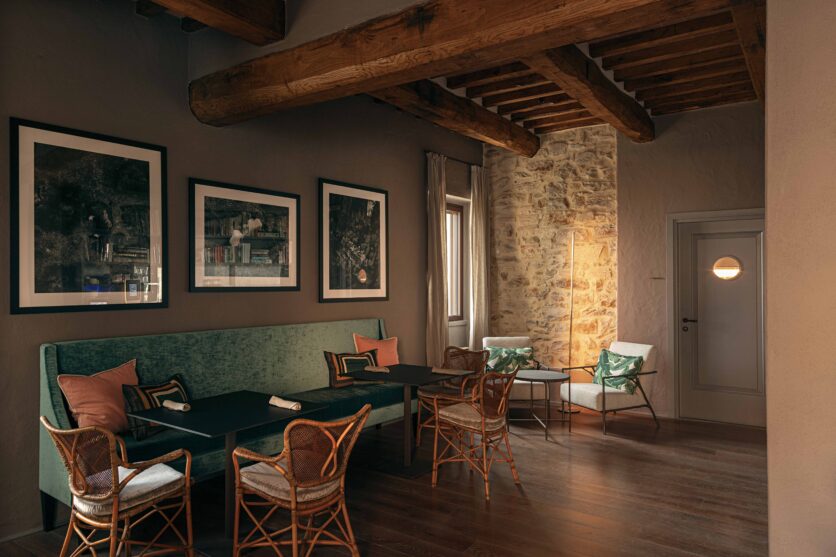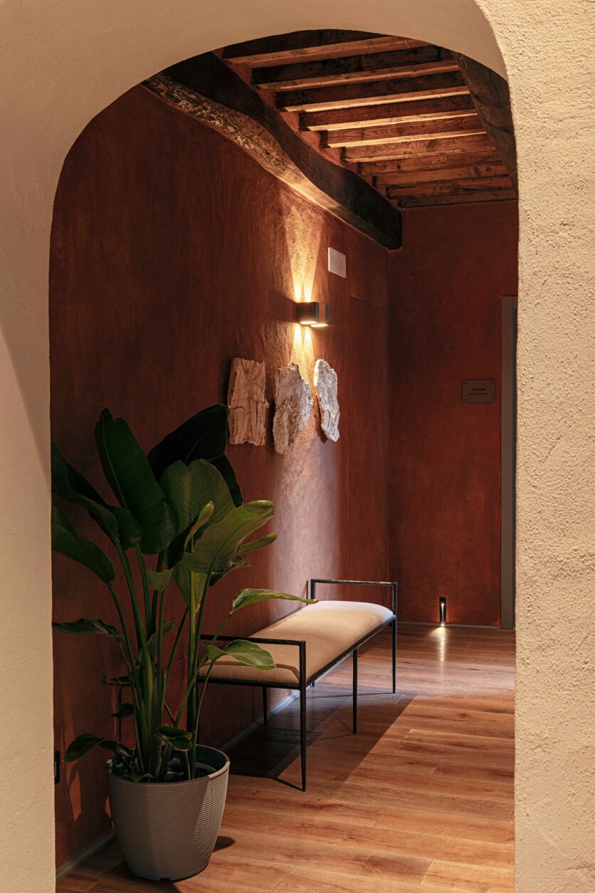 Al piano strada, tra le mura antiche, trova posto un bistrot dedicato alle specialità umbre, arredato con richiami alle trattorie locali reinterpretati in chiave contemporanea. Una piccola spa, ricavata negli antichi ambienti delle cantine, offre un’atmosfera intima e suggestiva, con volte originali riportate alla luce da un restauro accurato. Spazi dedicati allo yoga e alla meditazione si aprono invece verso scorci silenziosi del borgo, con cromie polverose che riprendono i colori dei mattoni circostanti e delle pietre Serena. La zona colazioni, accanto allo scalone principale, dialoga con il giardino esterno grazie a un’ampia porta in vetro e corten.