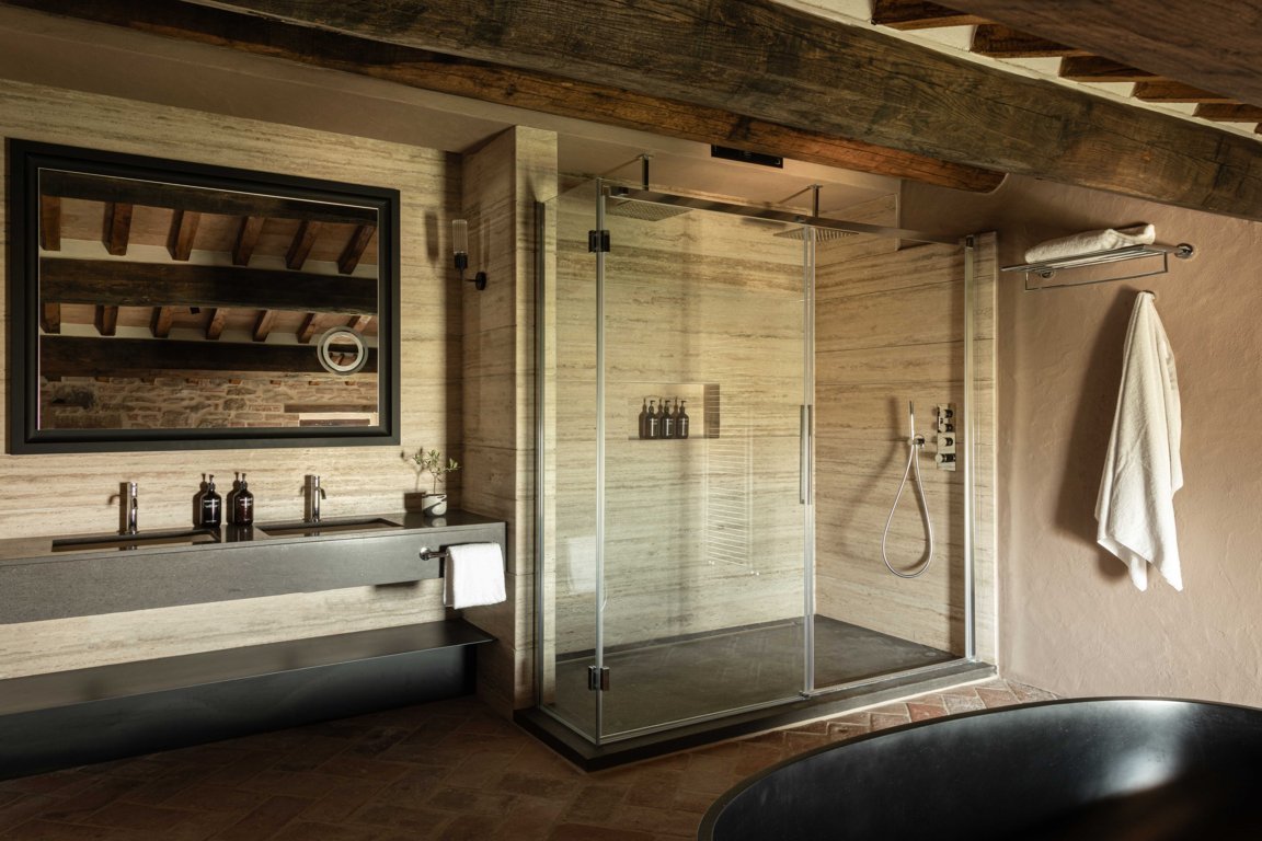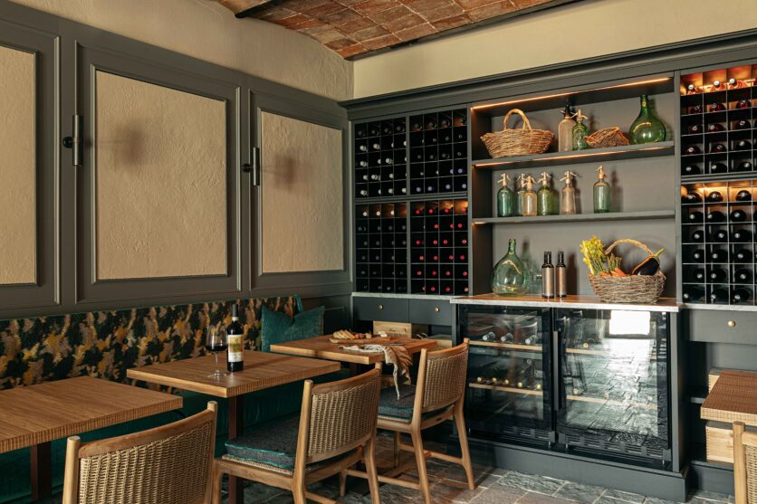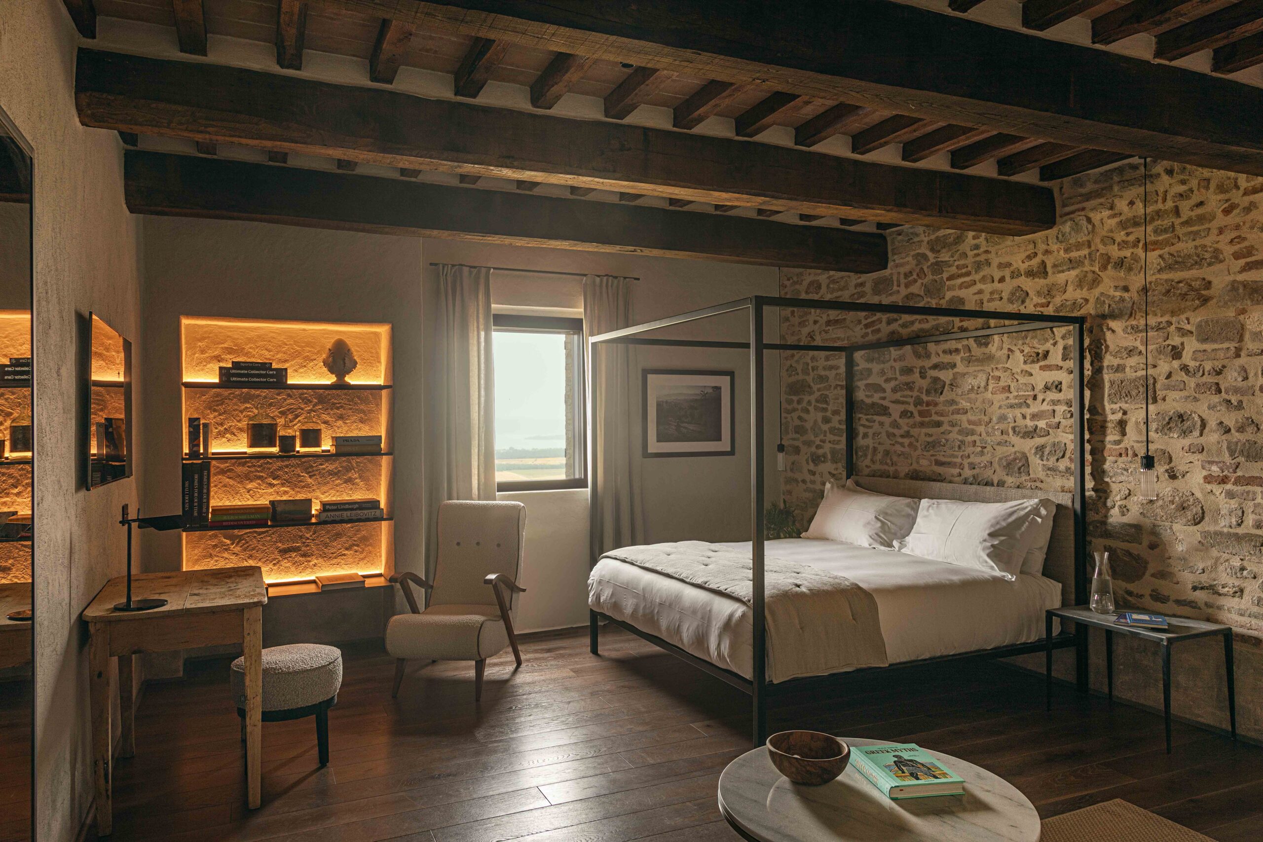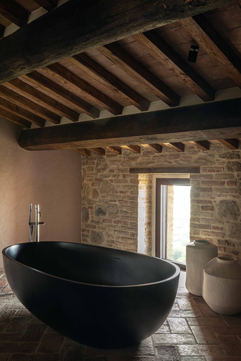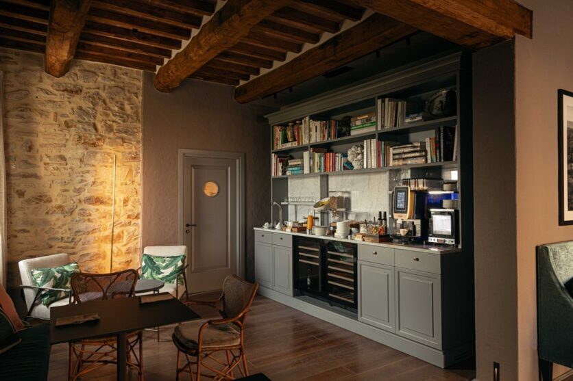 Al piano strada, tra le mura antiche, trova posto un bistrot dedicato alle specialità umbre, arredato con richiami alle trattorie locali reinterpretati in chiave contemporanea. Una piccola spa, ricavata negli antichi ambienti delle cantine, offre un’atmosfera intima e suggestiva, con volte originali riportate alla luce da un restauro accurato. Spazi dedicati allo yoga e alla meditazione si aprono invece verso scorci silenziosi del borgo, con cromie polverose che riprendono i colori dei mattoni circostanti e delle pietre Serena. La zona colazioni, accanto allo scalone principale, dialoga con il giardino esterno grazie a un’ampia porta in vetro e corten.