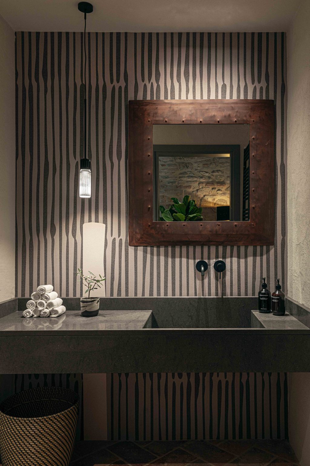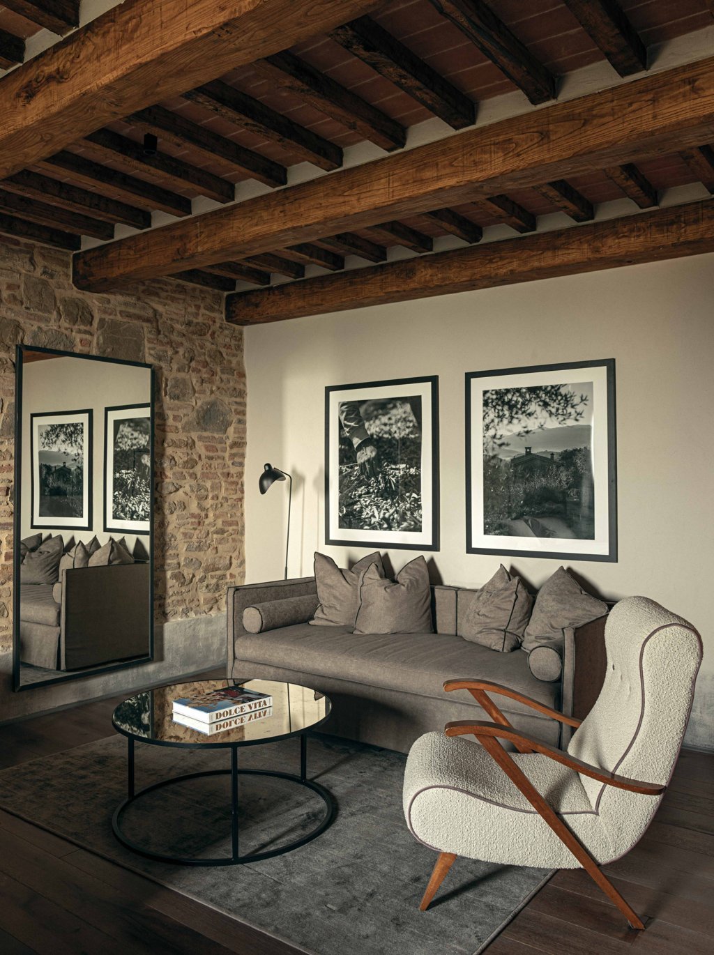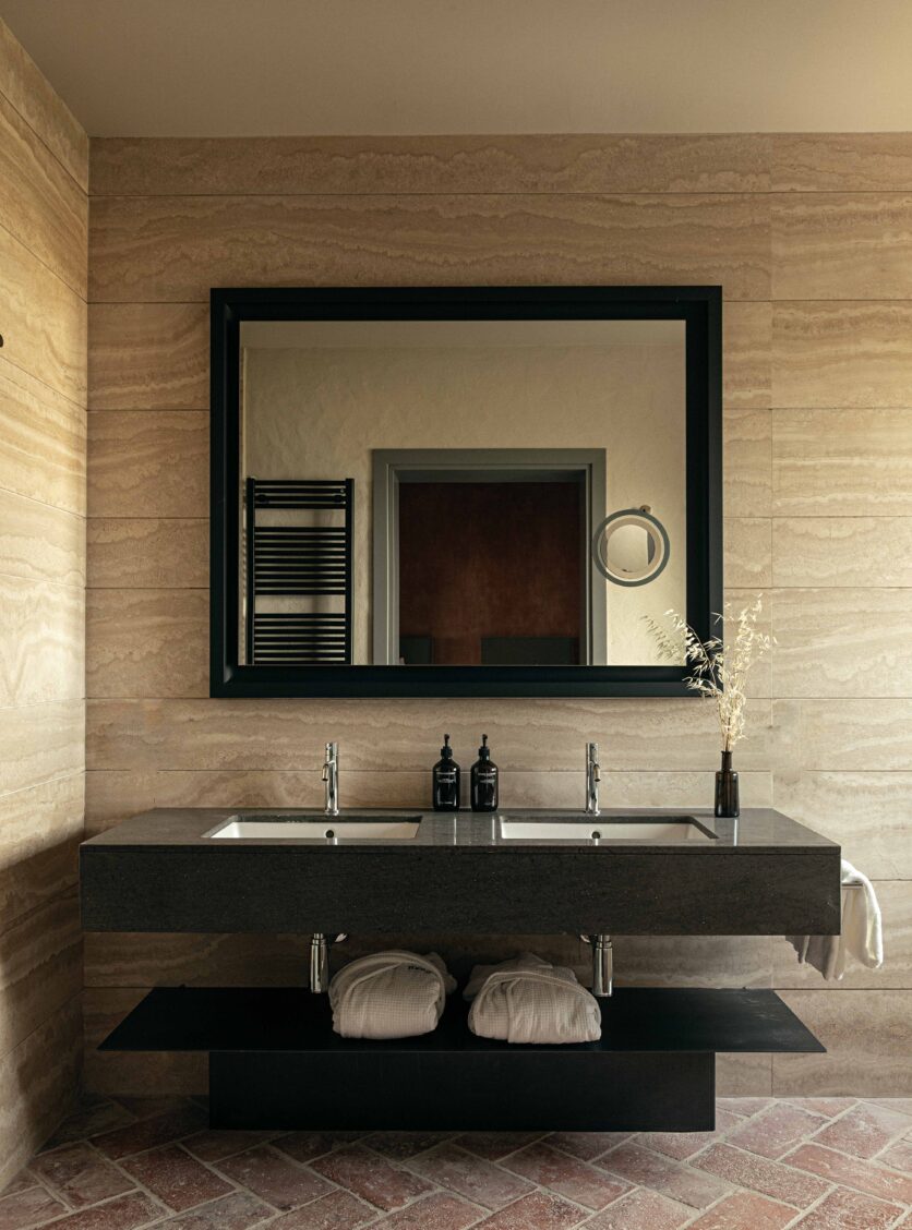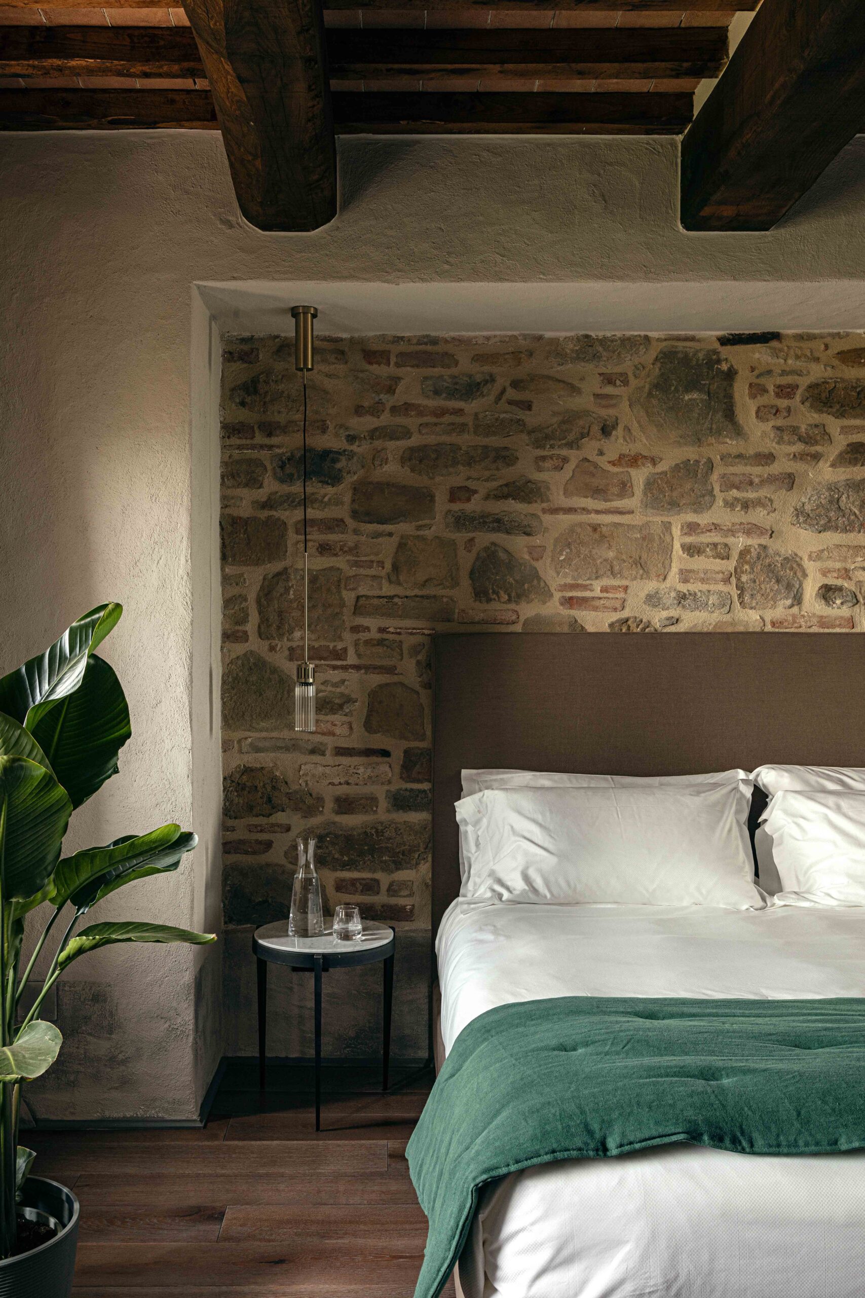 Al piano strada, tra le mura antiche, trova posto un bistrot dedicato alle specialità umbre, arredato con richiami alle trattorie locali reinterpretati in chiave contemporanea. Una piccola spa, ricavata negli antichi ambienti delle cantine, offre un’atmosfera intima e suggestiva, con volte originali riportate alla luce da un restauro accurato. Spazi dedicati allo yoga e alla meditazione si aprono invece verso scorci silenziosi del borgo, con cromie polverose che riprendono i colori dei mattoni circostanti e delle pietre Serena. La zona colazioni, accanto allo scalone principale, dialoga con il giardino esterno grazie a un’ampia porta in vetro e corten.