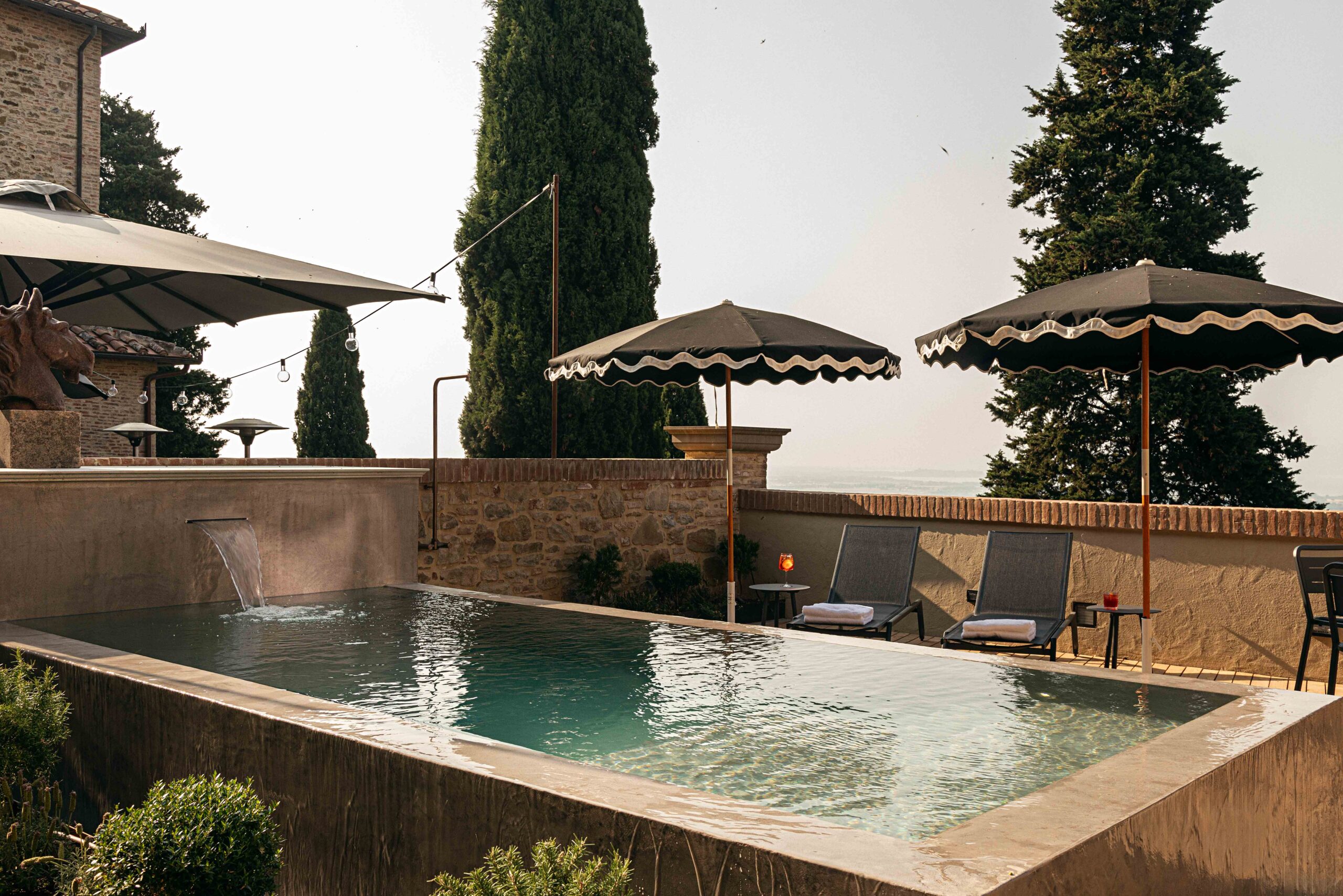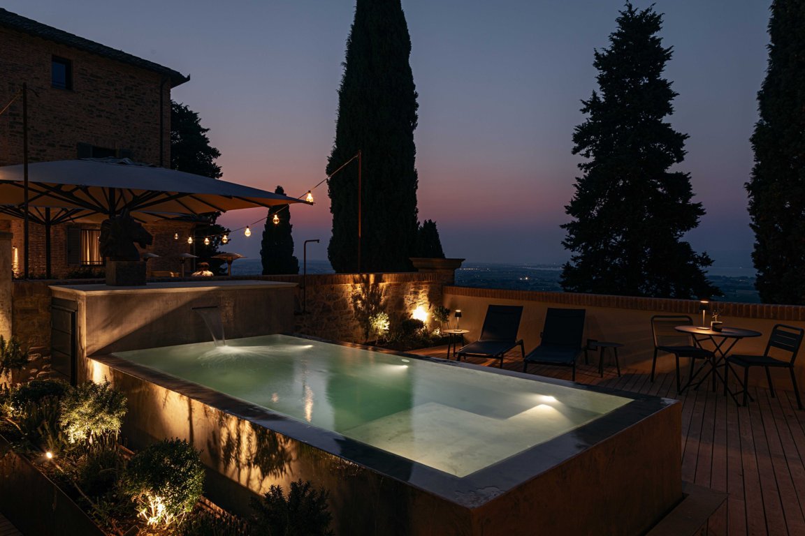 Il giardino sospeso, con vista sul Lago Trasimeno, diventa cuore scenografico dell’hotel: un luogo sospeso nel tempo, capace di evocare i paesaggi dipinti dal Perugino. L’intero intervento segue il concetto di continuità visiva, con passaggi fluidi tra interni ed esterni, in un equilibrio che integra memoria storica e comfort contemporaneo.